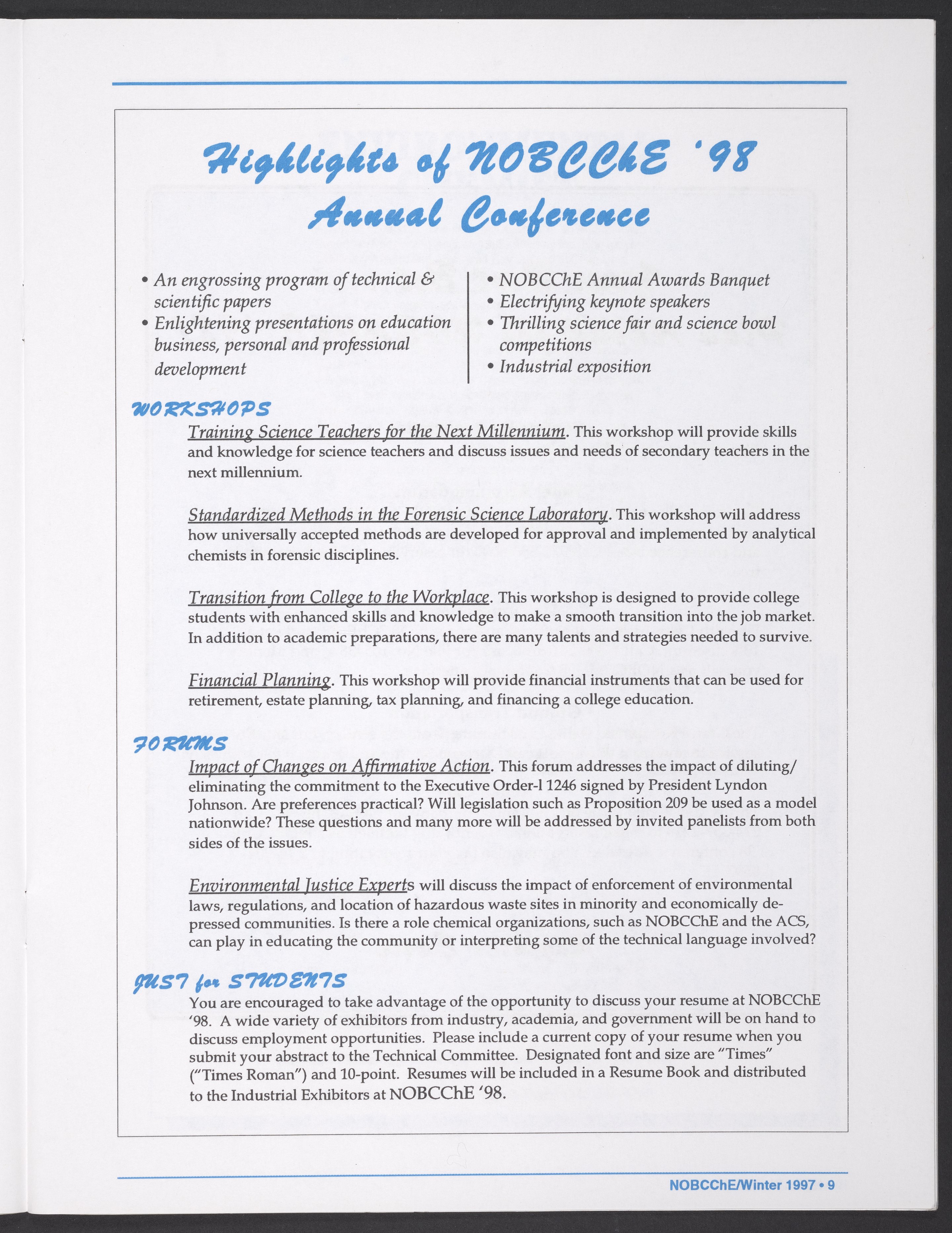 “NOBCChE News, Volume 18, Number 3.” National Organization for Black Chemists and Chemical Engineers, 1997. William A. Lester, Jr. Papers, Box 46, Folder 31. Science History Institute. Philadelphia. https://digital.sciencehistory.org/works/ylmgr6b.