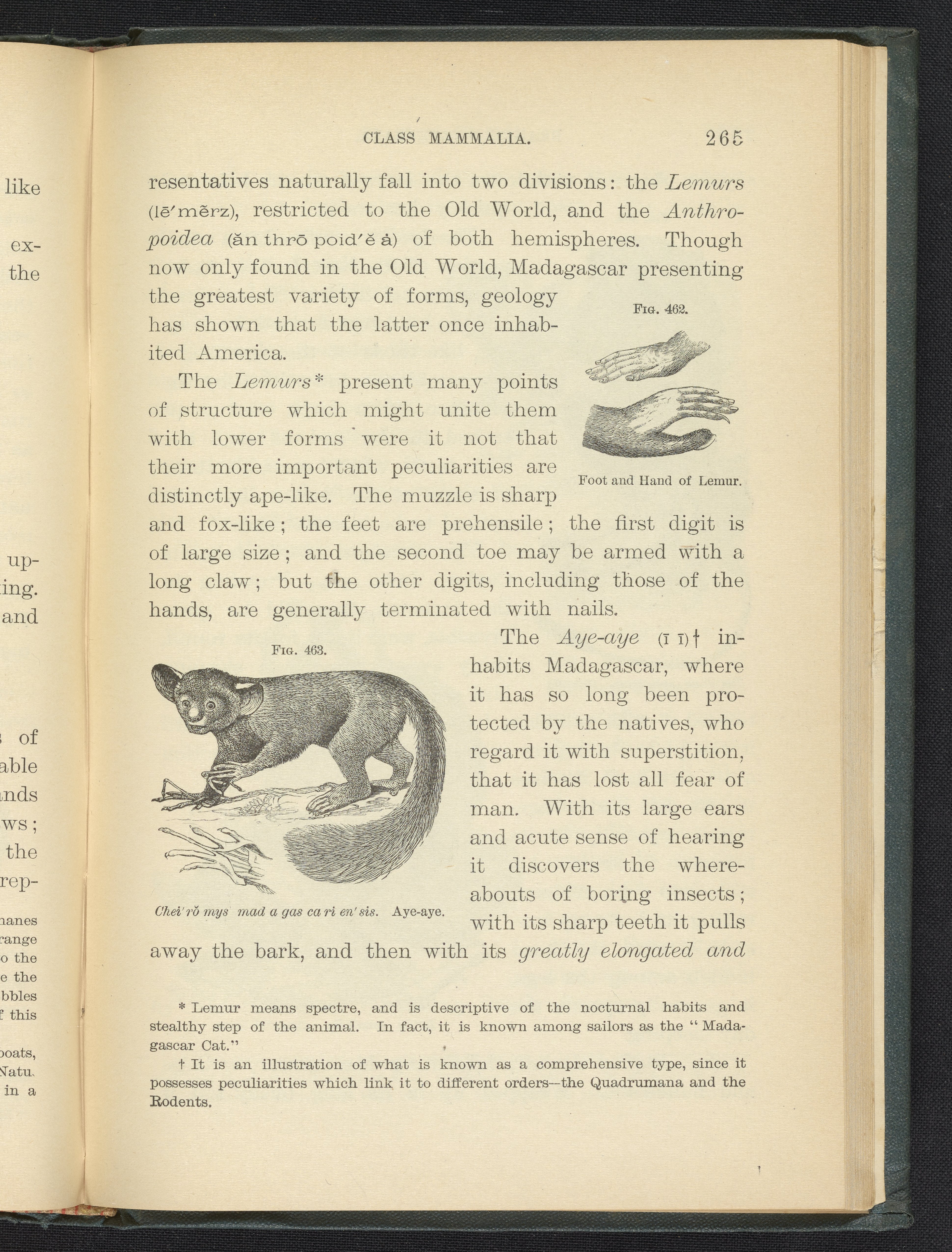 Figures 462 and 463 of the 1887 volume Popular Zoology. Figure 462 depicts the foot and hand of a lemur. Figure 463 depicts an aye-aye, a long-fingered lemur.