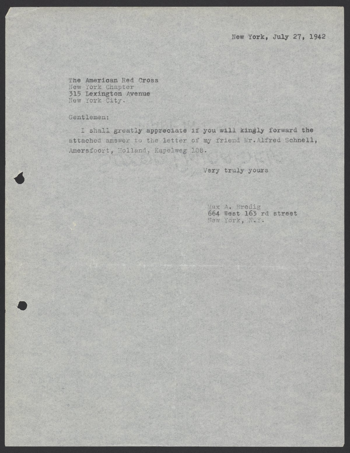 Letter from Max Bredig to the American Red Cross, July 27, 1942