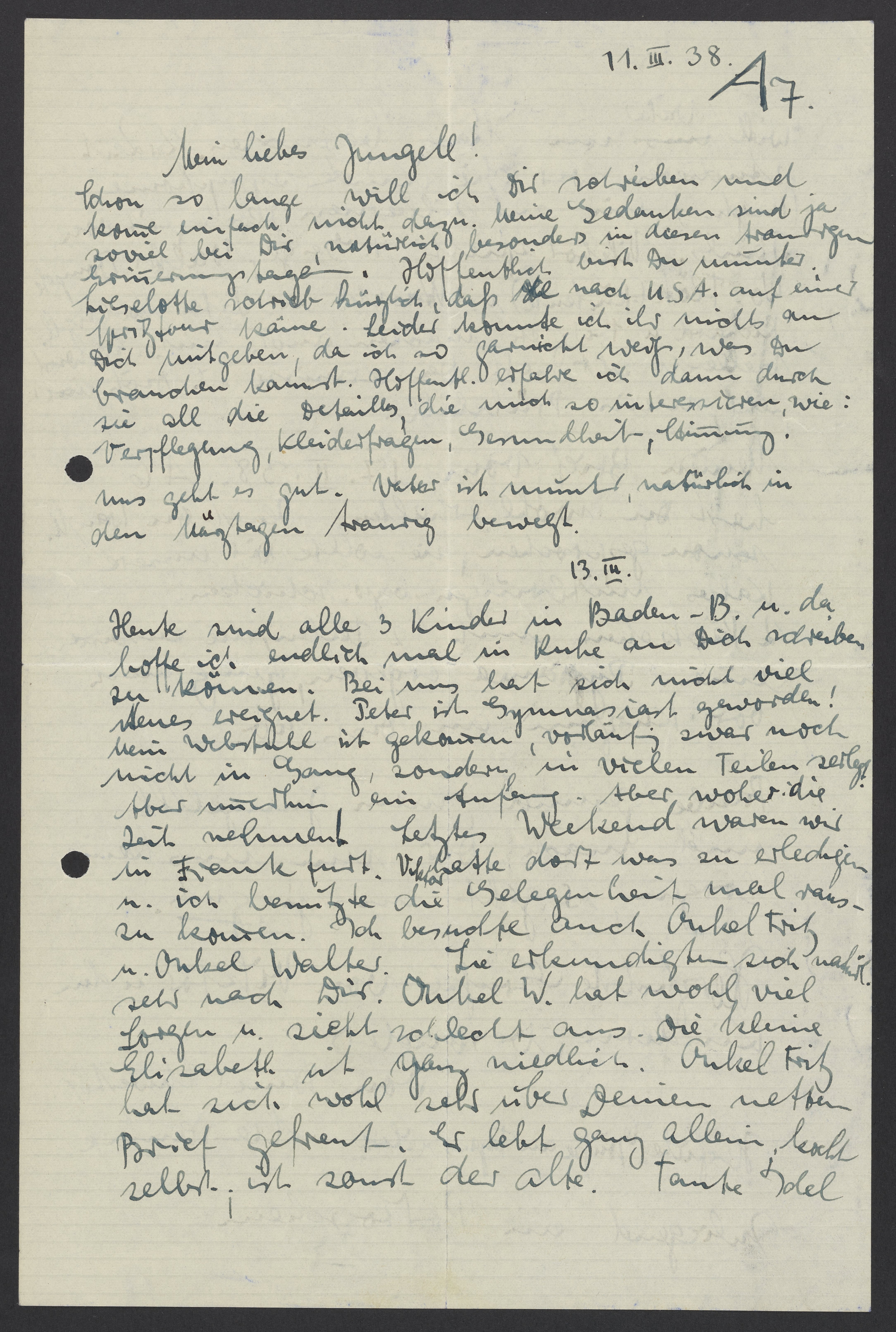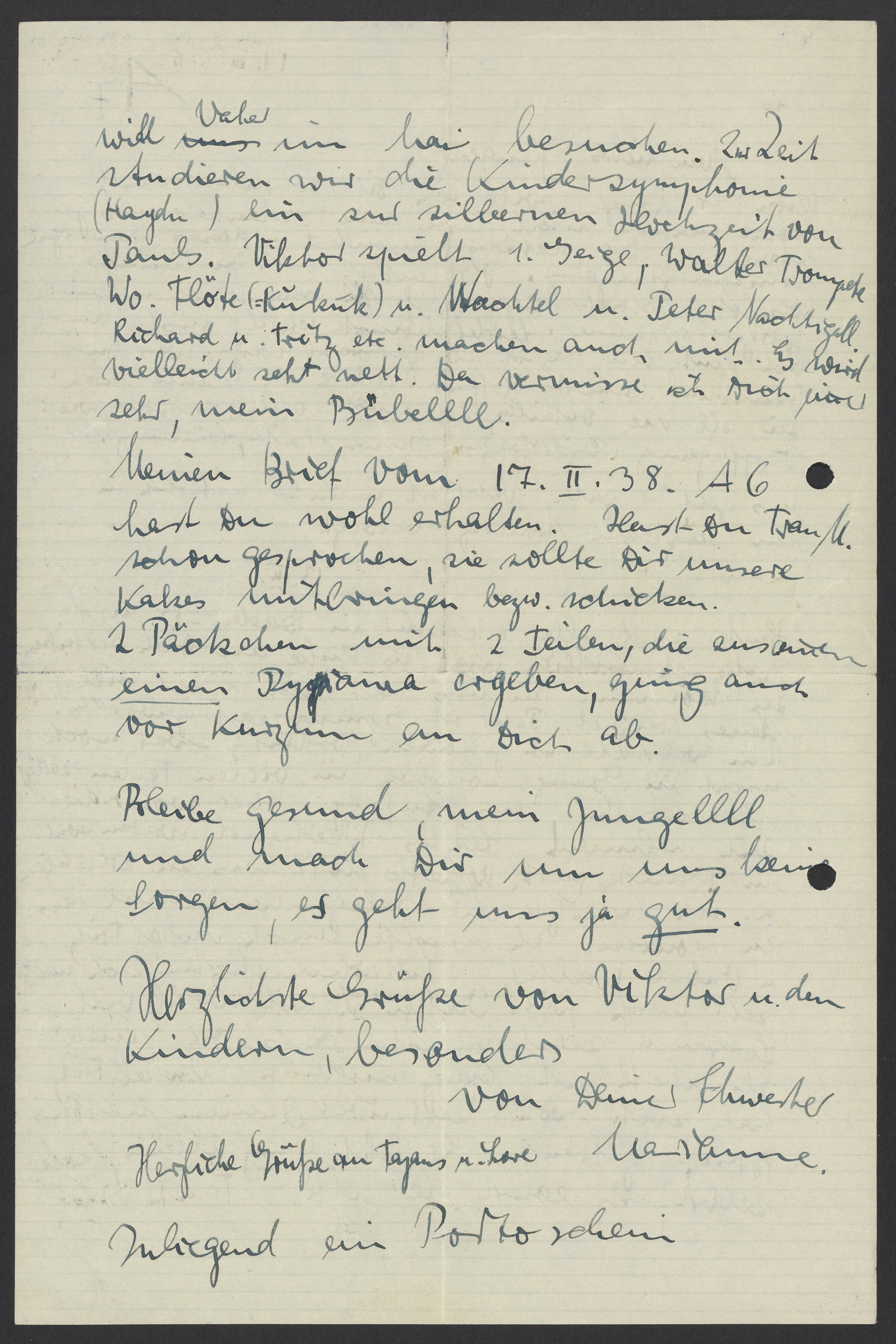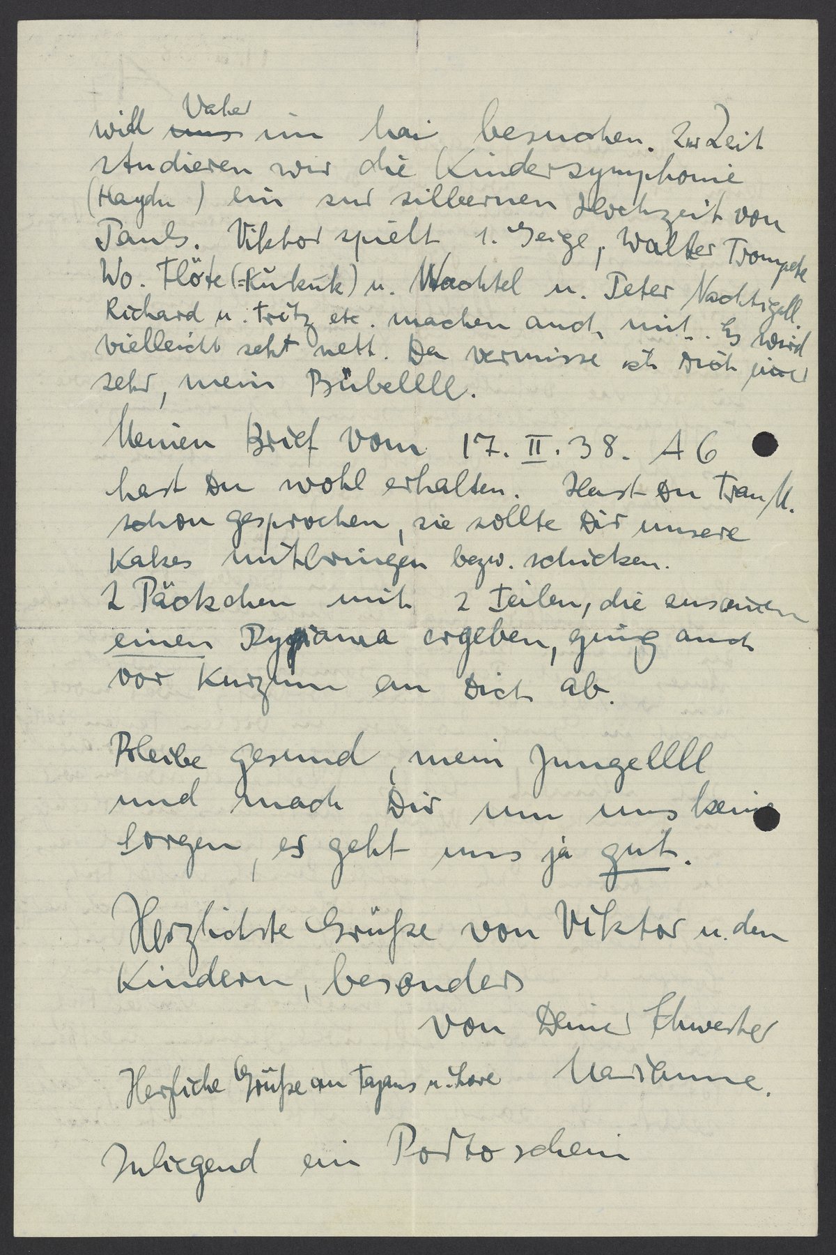 Mein Brief vom 17. II. 38. A6 hast Du wohl erhalten. Hast Du Frau M. schon gesprochen, sie sollte Dir unsere Kakes mitbringen bezw. schicken.