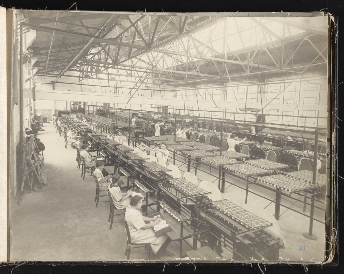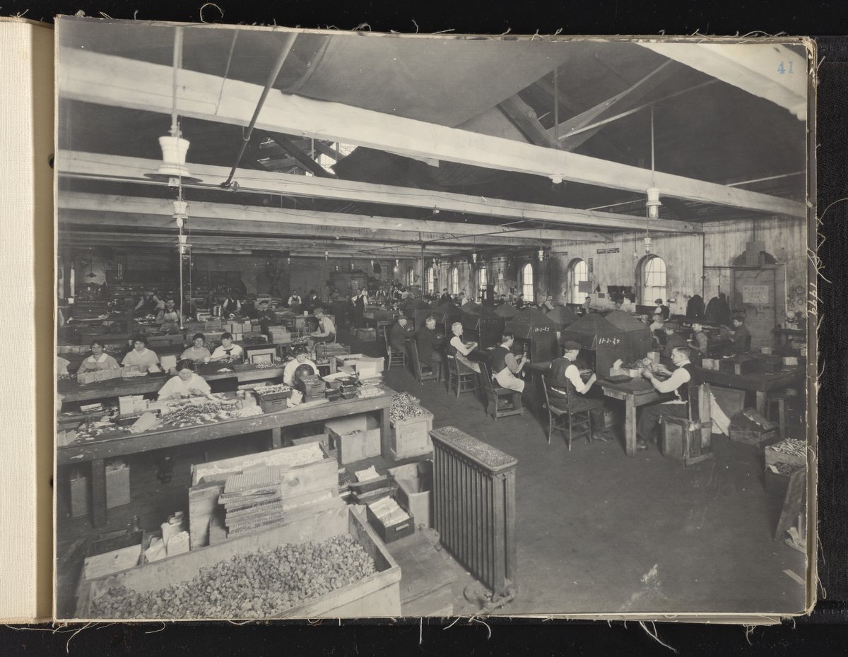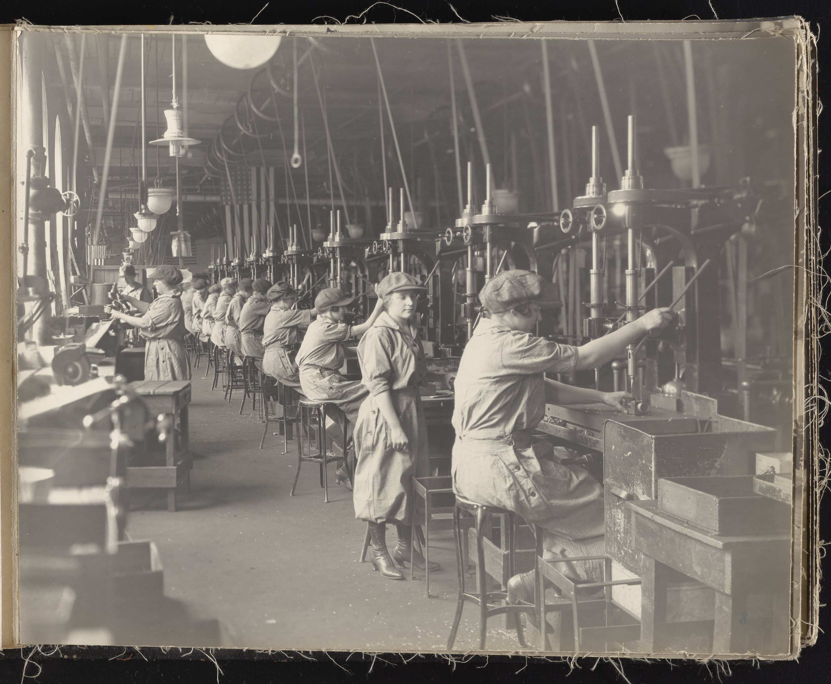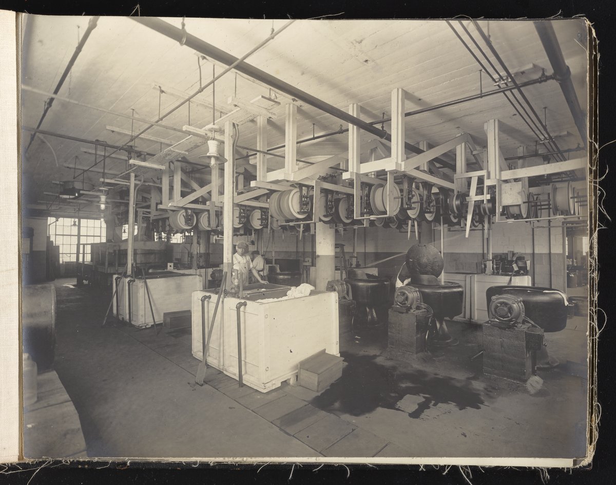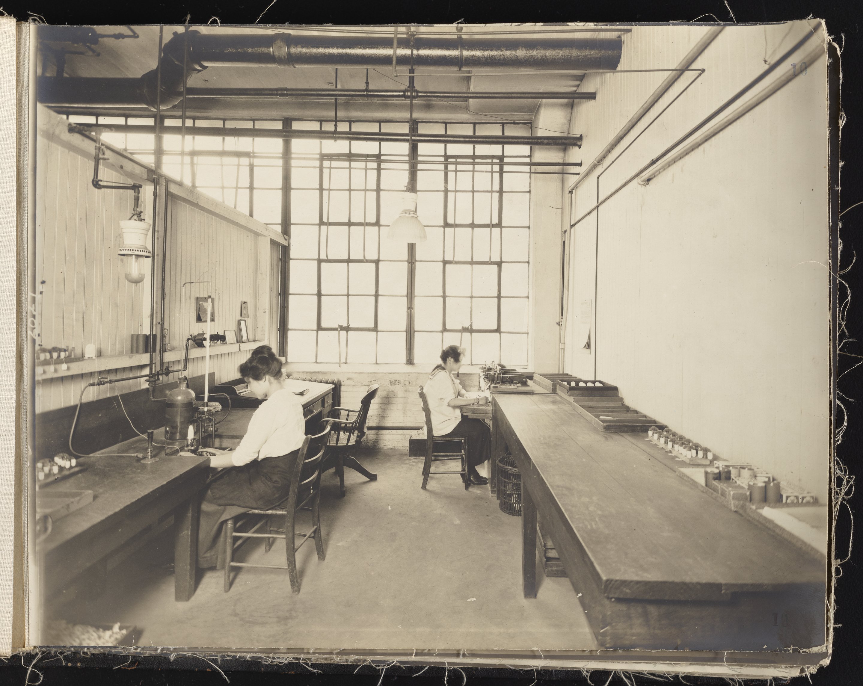 Small JPG1200 x 613px — 132 KBLarge JPG2880 x 1472px — 692 KBFull-sized JPG6930 x 3541px — 3.3 MBOriginal fileTIFF — 6930 x 3541px — 70.3 MBAlbum containing 52 black and white photographs documenting various aspects of the production process at the Welsbach Gas Light Company site located along the Delaware River in Gloucester City, New Jersey. From 1888 to 1940, the Welsbach Gas Light Company held exclusive manufacturing and sales rights to the Welsbach gas mantle, a device made of fibers impregnated with oxides of thorium and cerium that produced bright white light when heated with a gas flame. Invented in 1880's by Austrian scientist Carl Auer Von Welsbach (1858-1929), these gas mantles were used extensively in street lighting and in gas-powered appliances. The Welsbach gas mantle also was the first industrial product to make use of rare earth elements. At peak production, the Welsbach factory employed 2,000 people, including a large number of women skilled at the sewing and other precision handwork involved in the manufacturing process. The album, digitized here in its entirety, provides a valuable visual record of all aspects of the production process, showing a wide range of machinery, and male and female employees working at various tasks including chemical production, machining metal parts, sewing, assembly, testing, packaging, and shipping.