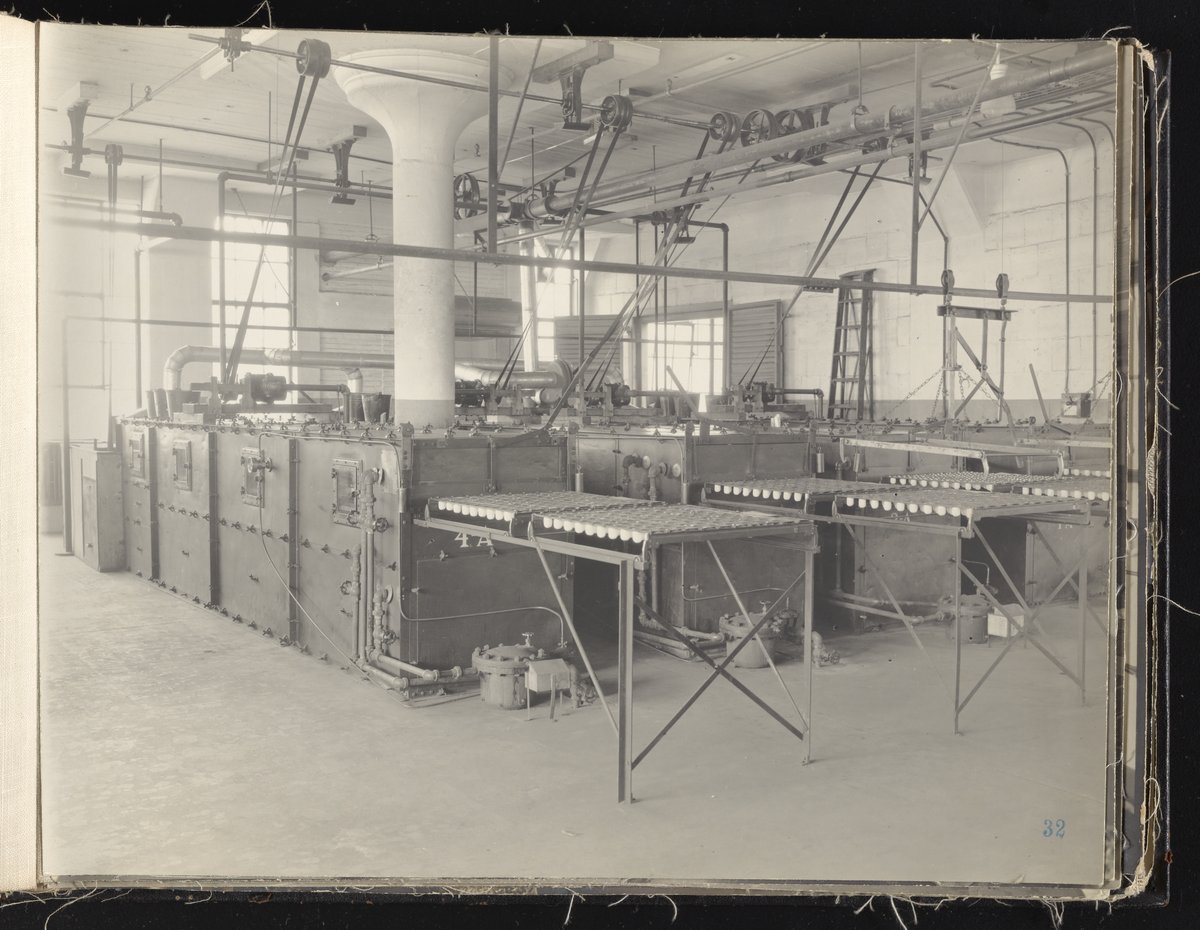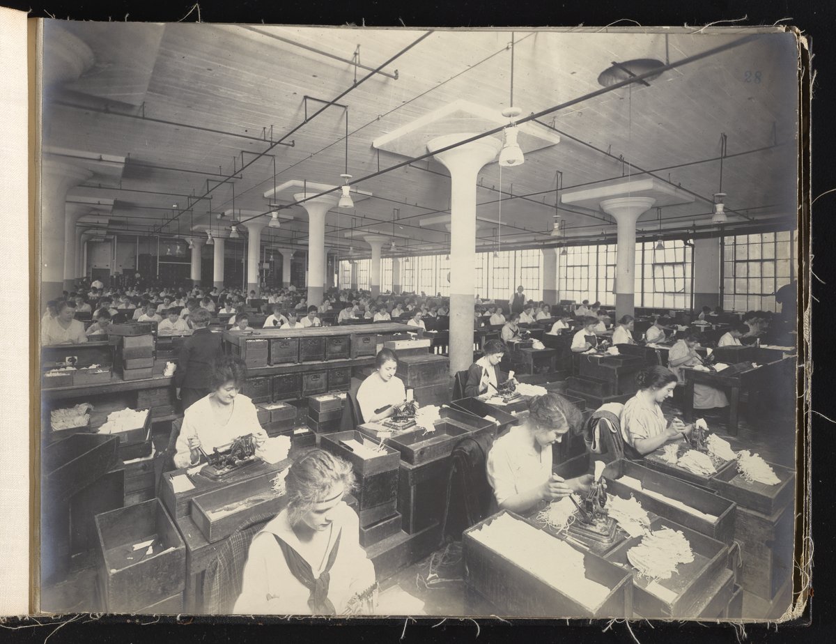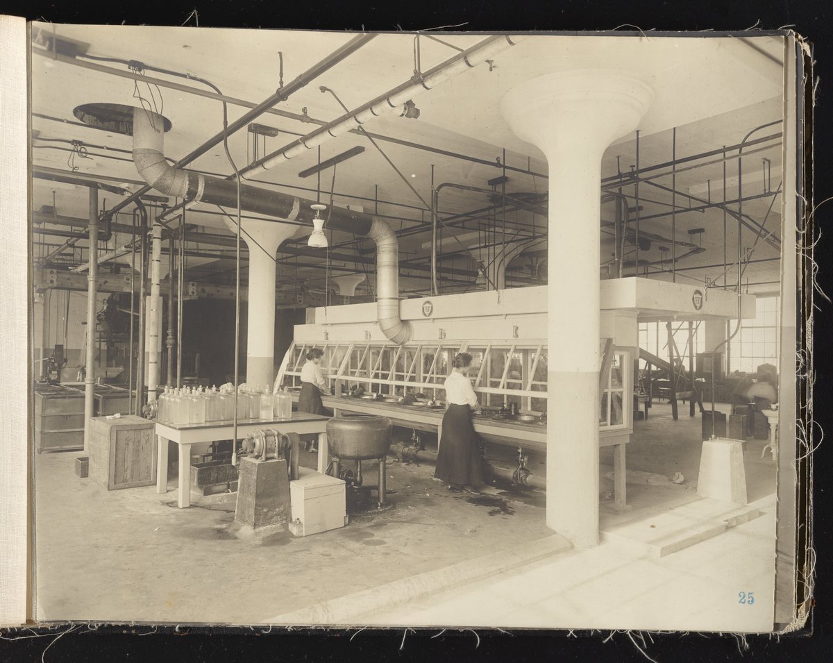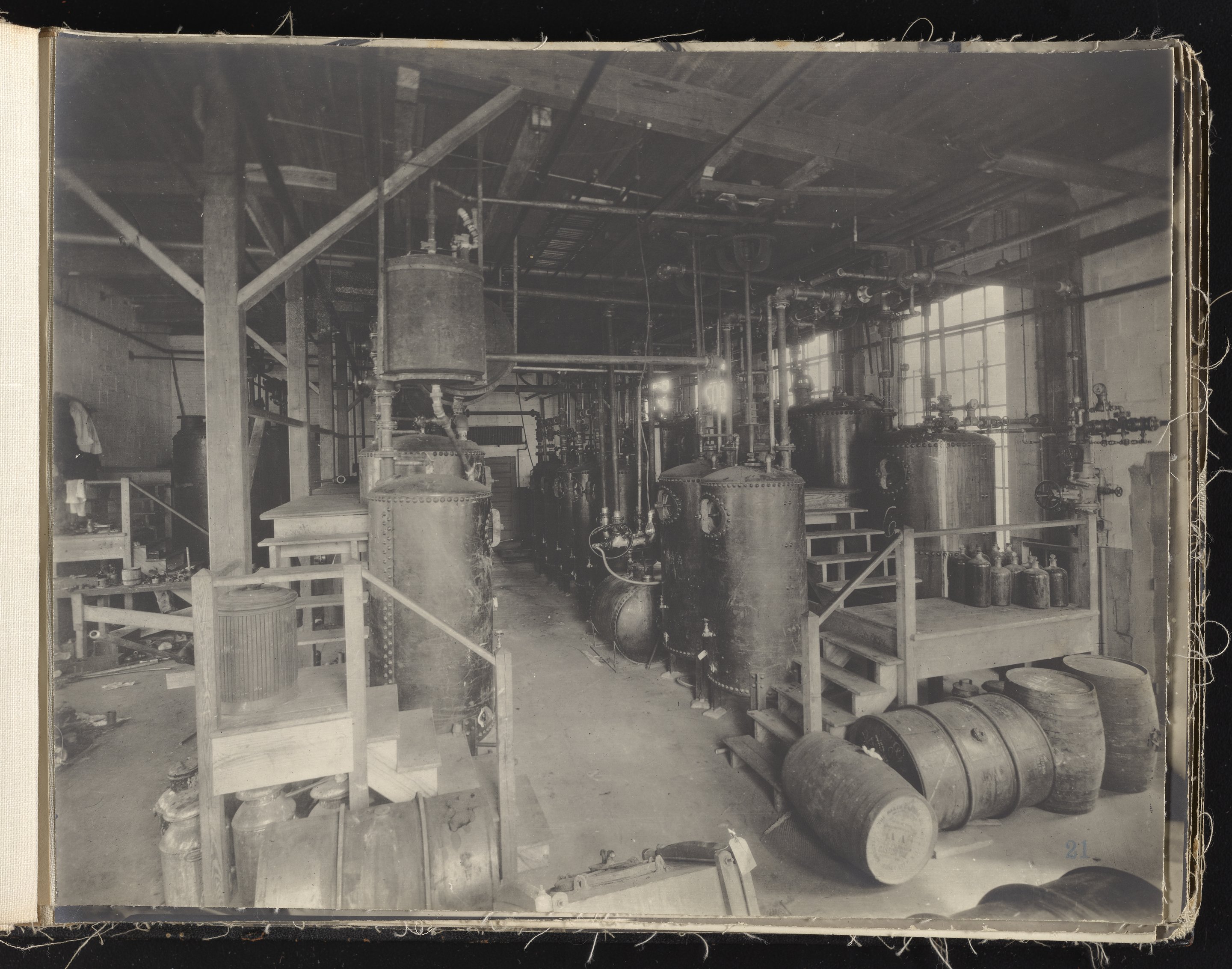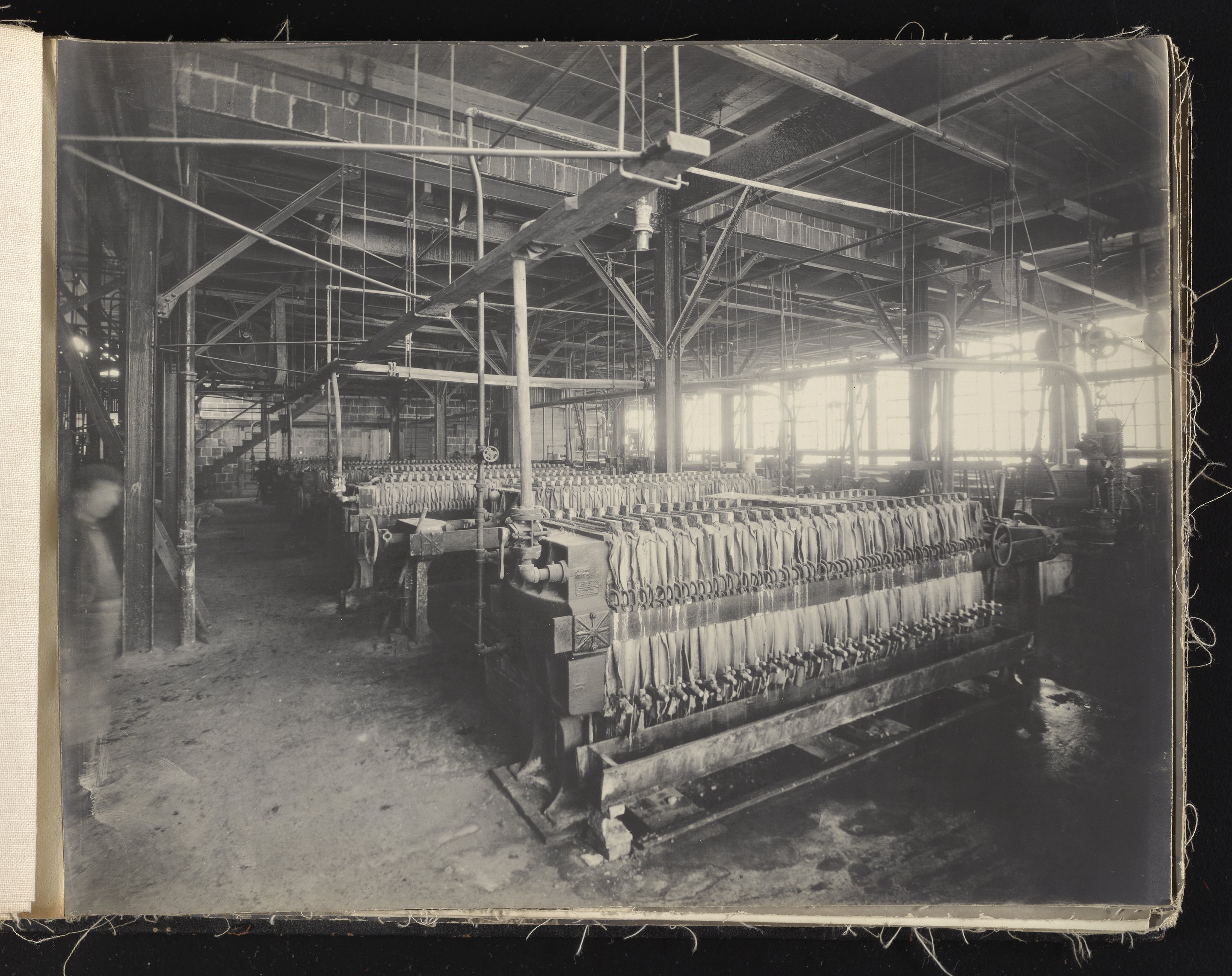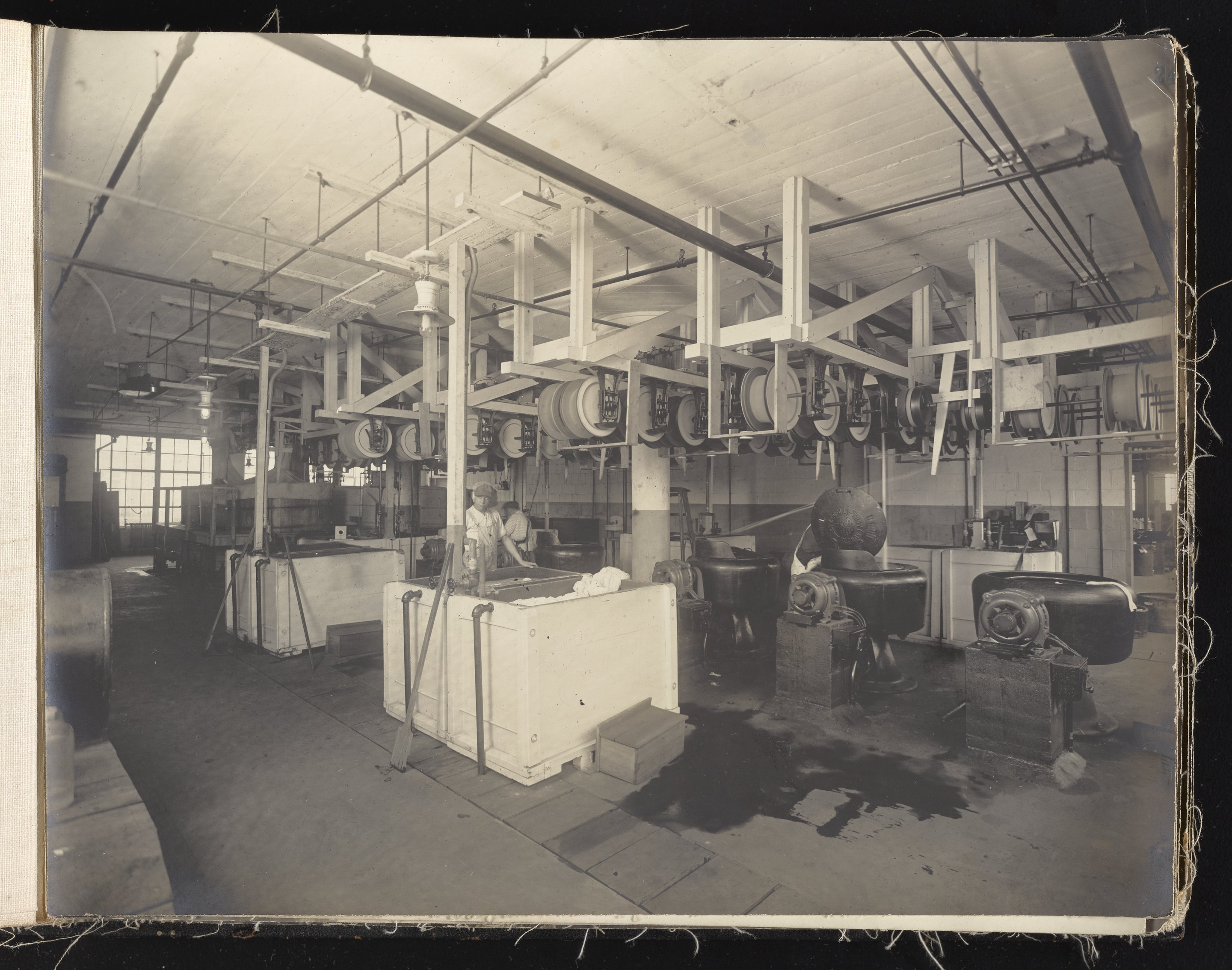 Small JPG1200 x 613px — 132 KBLarge JPG2880 x 1472px — 692 KBFull-sized JPG6930 x 3541px — 3.3 MBOriginal fileTIFF — 6930 x 3541px — 70.3 MBAlbum containing 52 black and white photographs documenting various aspects of the production process at the Welsbach Gas Light Company site located along the Delaware River in Gloucester City, New Jersey. From 1888 to 1940, the Welsbach Gas Light Company held exclusive manufacturing and sales rights to the Welsbach gas mantle, a device made of fibers impregnated with oxides of thorium and cerium that produced bright white light when heated with a gas flame. Invented in 1880's by Austrian scientist Carl Auer Von Welsbach (1858-1929), these gas mantles were used extensively in street lighting and in gas-powered appliances. The Welsbach gas mantle also was the first industrial product to make use of rare earth elements. At peak production, the Welsbach factory employed 2,000 people, including a large number of women skilled at the sewing and other precision handwork involved in the manufacturing process. The album, digitized here in its entirety, provides a valuable visual record of all aspects of the production process, showing a wide range of machinery, and male and female employees working at various tasks including chemical production, machining metal parts, sewing, assembly, testing, packaging, and shipping.