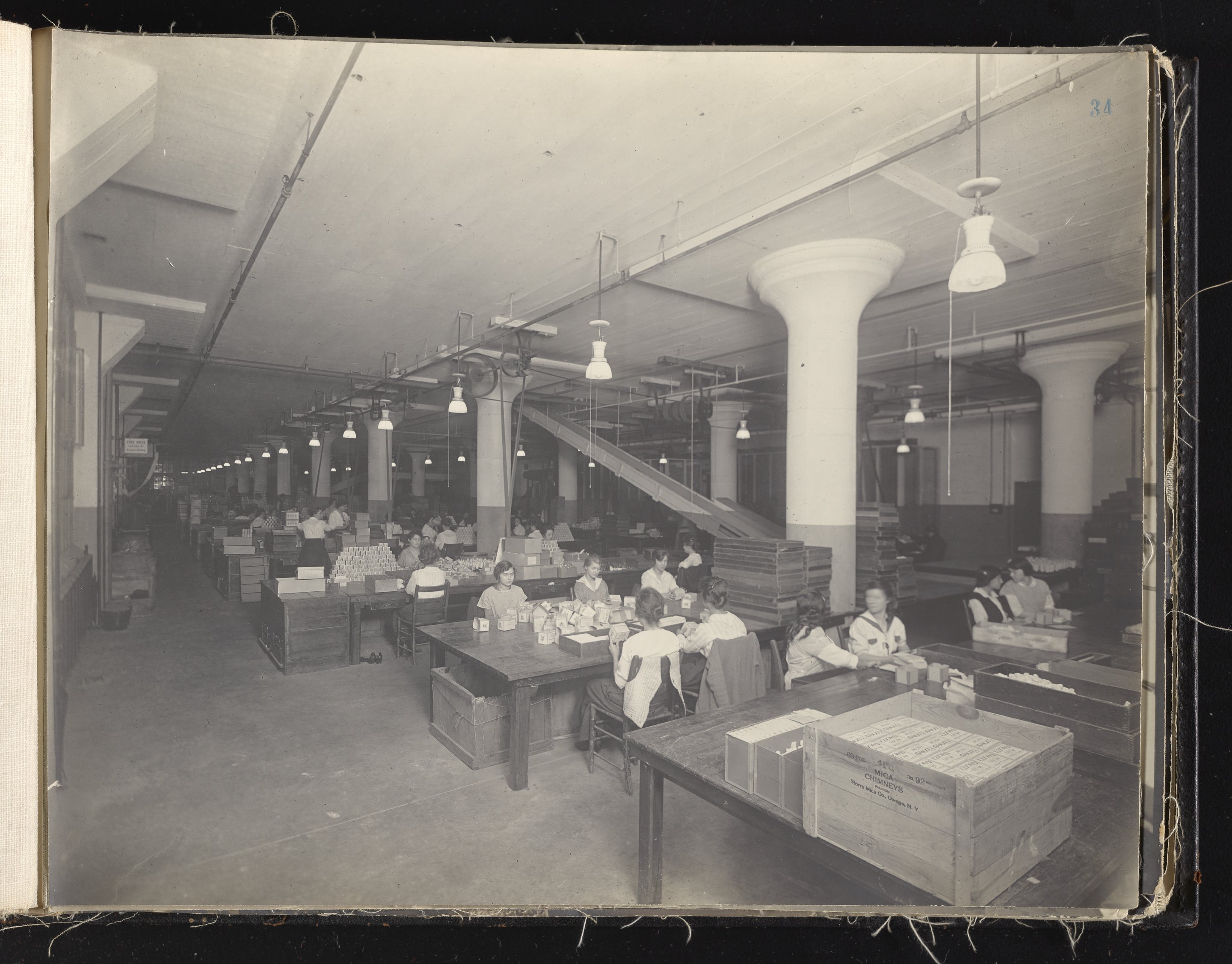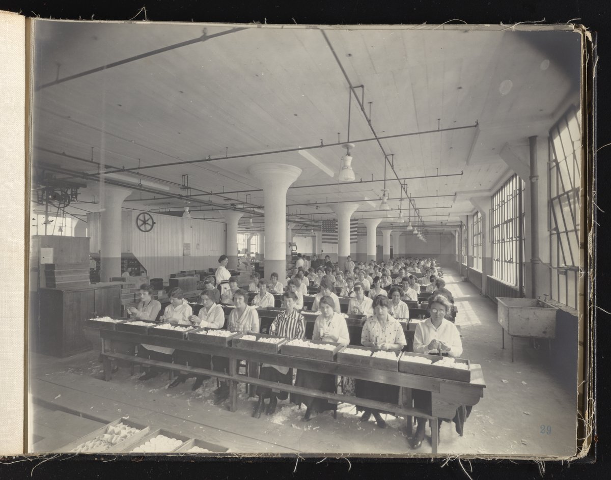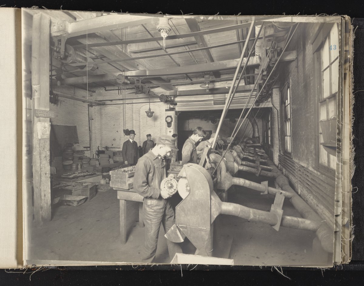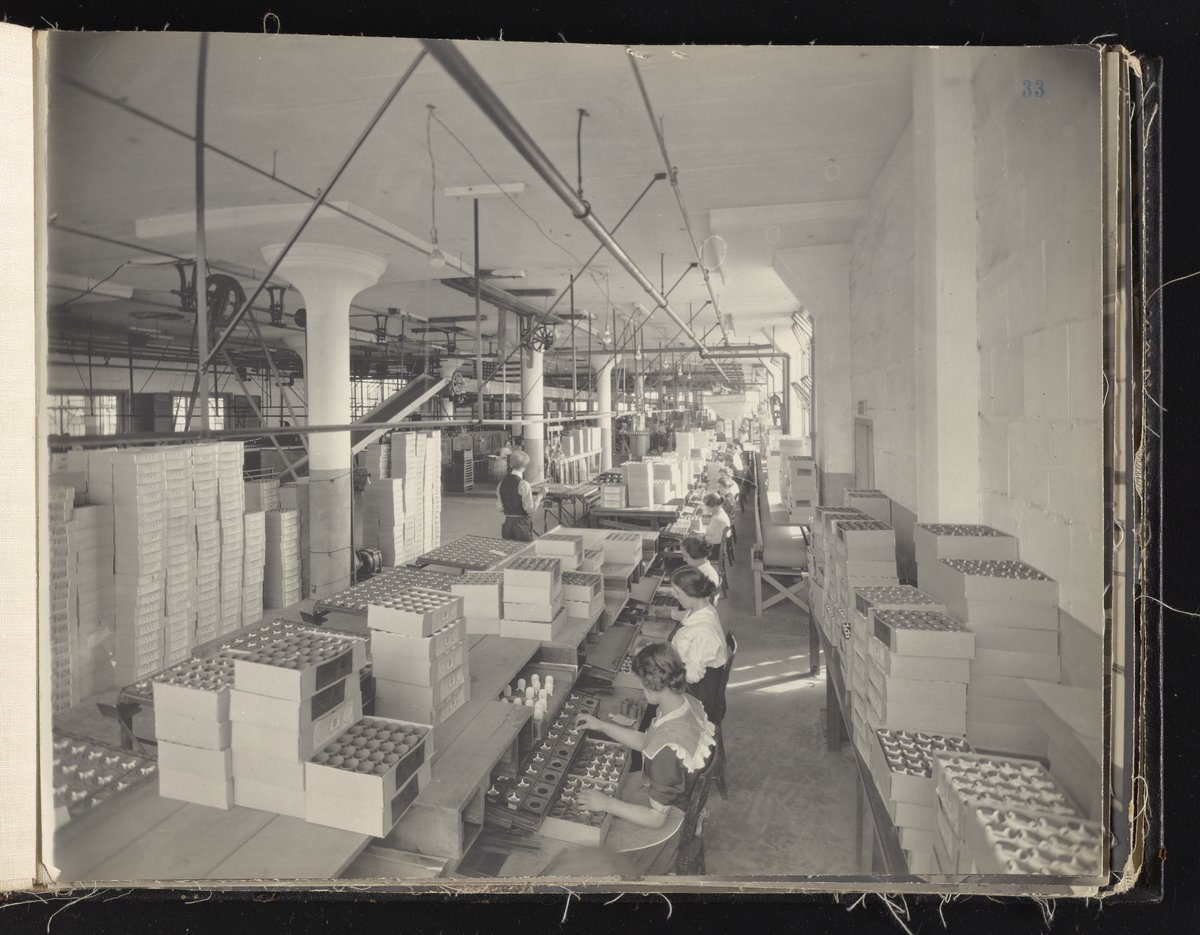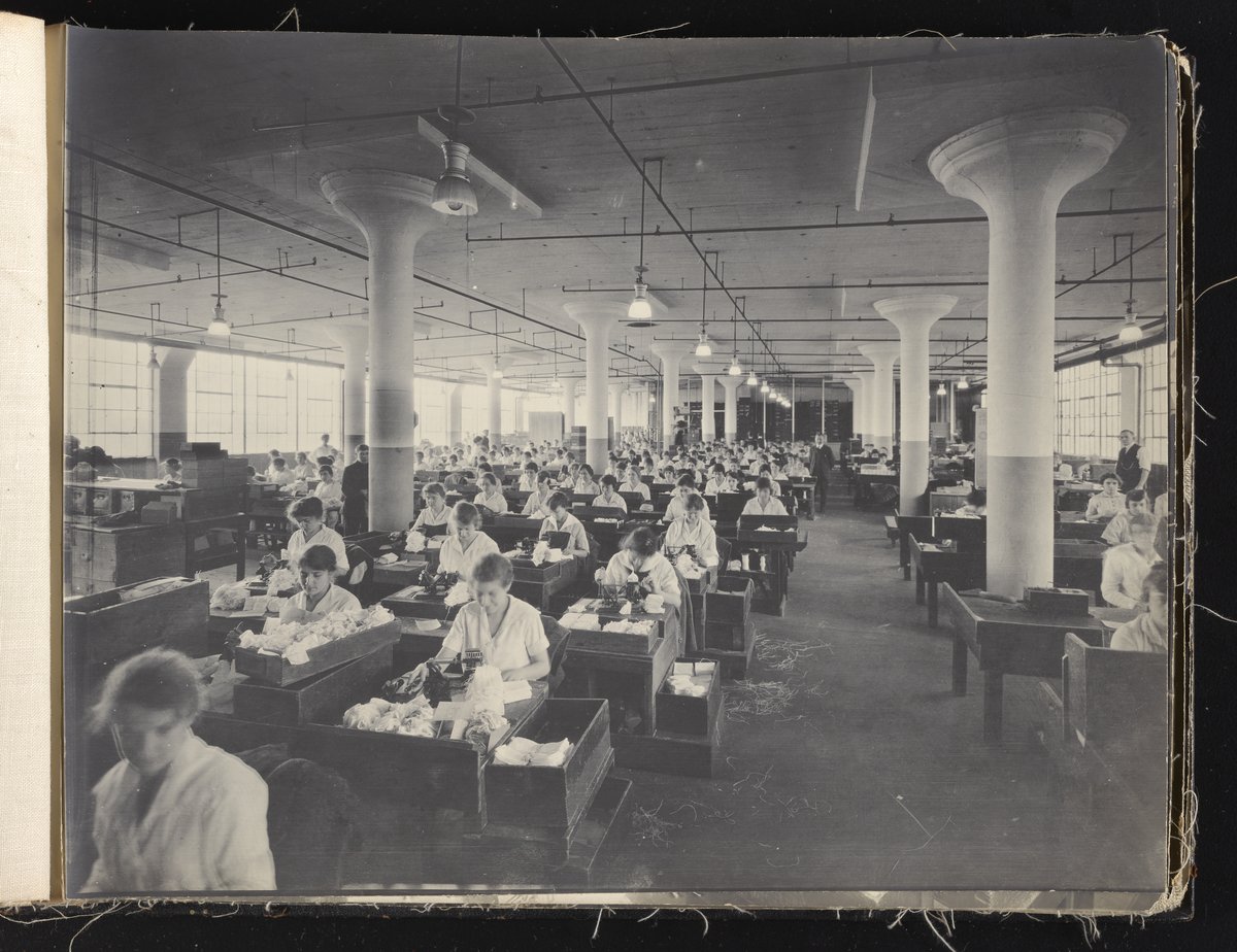 Small JPG1200 x 613px — 132 KBLarge JPG2880 x 1472px — 692 KBFull-sized JPG6930 x 3541px — 3.3 MBOriginal fileTIFF — 6930 x 3541px — 70.3 MBAlbum containing 52 black and white photographs documenting various aspects of the production process at the Welsbach Gas Light Company site located along the Delaware River in Gloucester City, New Jersey. From 1888 to 1940, the Welsbach Gas Light Company held exclusive manufacturing and sales rights to the Welsbach gas mantle, a device made of fibers impregnated with oxides of thorium and cerium that produced bright white light when heated with a gas flame. Invented in 1880's by Austrian scientist Carl Auer Von Welsbach (1858-1929), these gas mantles were used extensively in street lighting and in gas-powered appliances. The Welsbach gas mantle also was the first industrial product to make use of rare earth elements. At peak production, the Welsbach factory employed 2,000 people, including a large number of women skilled at the sewing and other precision handwork involved in the manufacturing process. The album, digitized here in its entirety, provides a valuable visual record of all aspects of the production process, showing a wide range of machinery, and male and female employees working at various tasks including chemical production, machining metal parts, sewing, assembly, testing, packaging, and shipping.