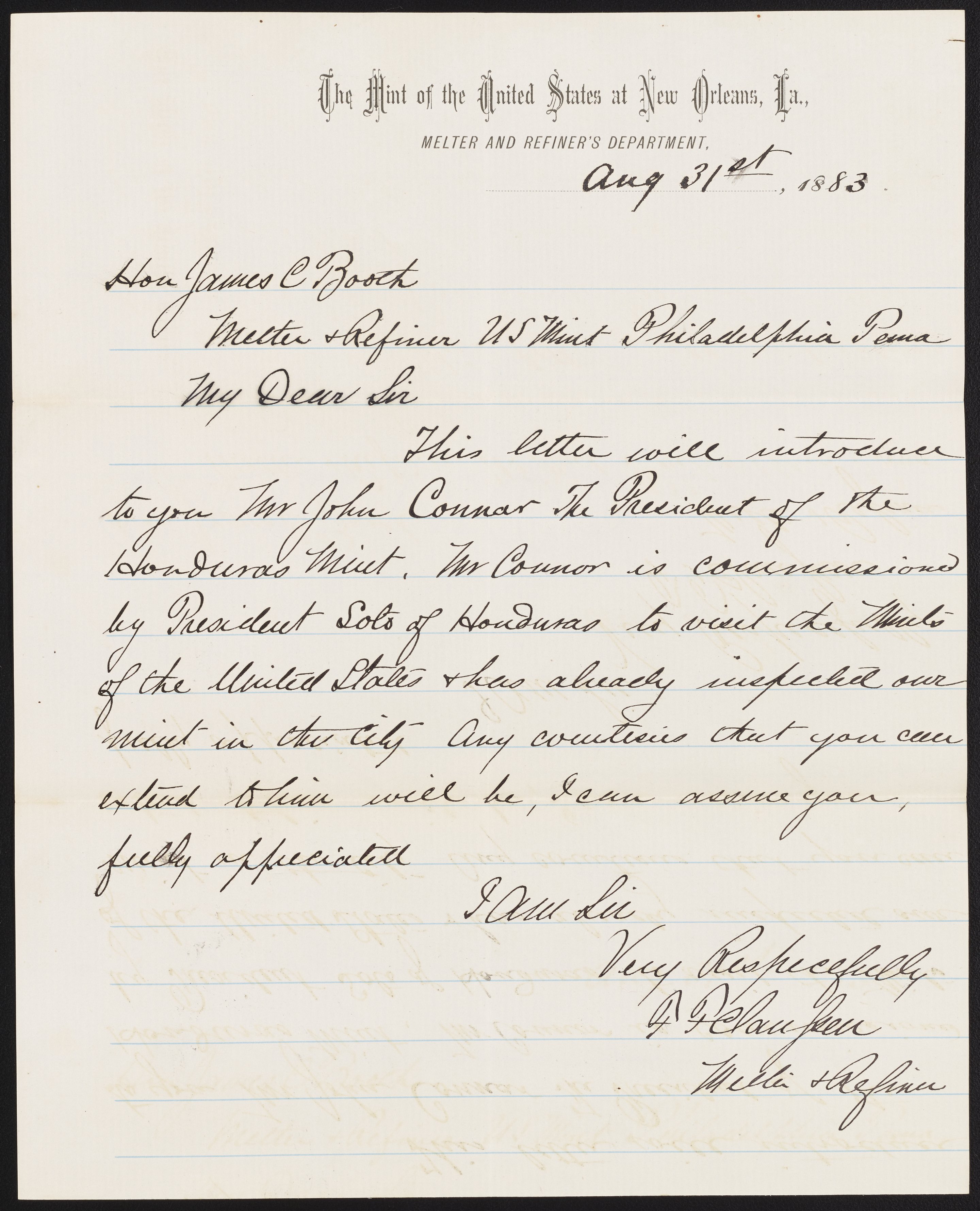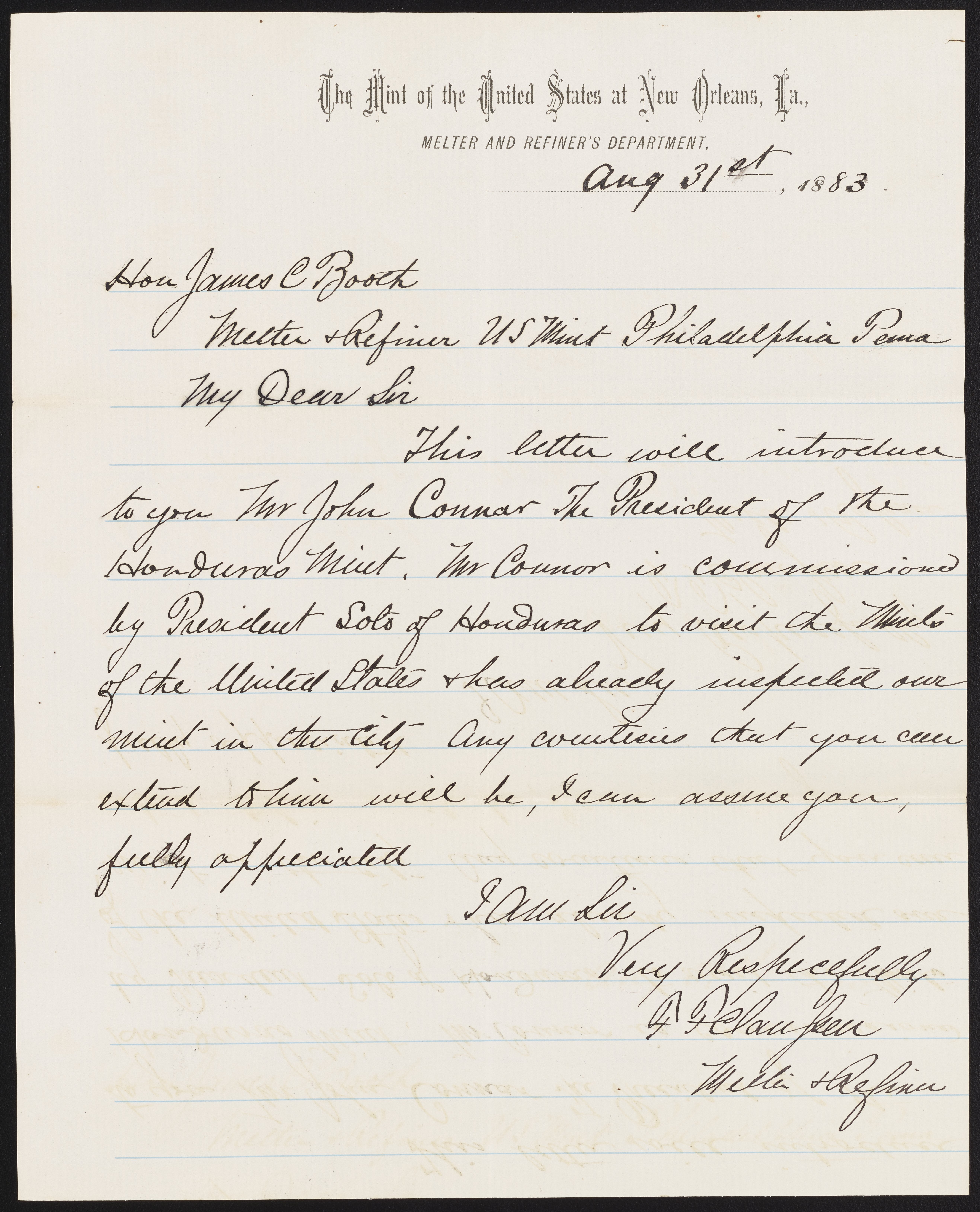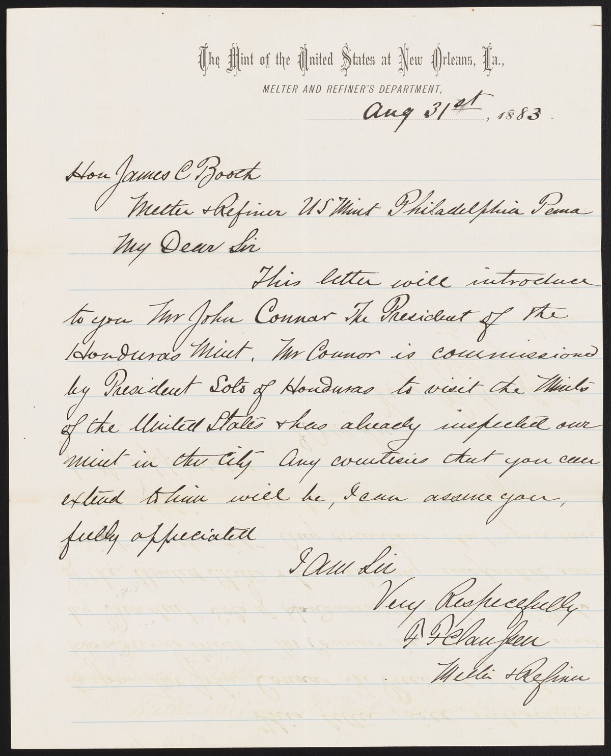 Small JPG1200 x 1484px — 233 KBLarge JPG2880 x 3561px — 1.1 MBFull-sized JPG5266 x 6512px — 3.2 MBOriginal fileTIFF — 5266 x 6512px — 98.2 MBFrancis F. Claussen, assayer of the United States Mint at New Orleans, La., writes to James Curtis Booth (1810-1888) to request that a Mr. Connor, who is minting coins for Honduras, be allowed to tour the Mint’s facilities in Philadelphia.