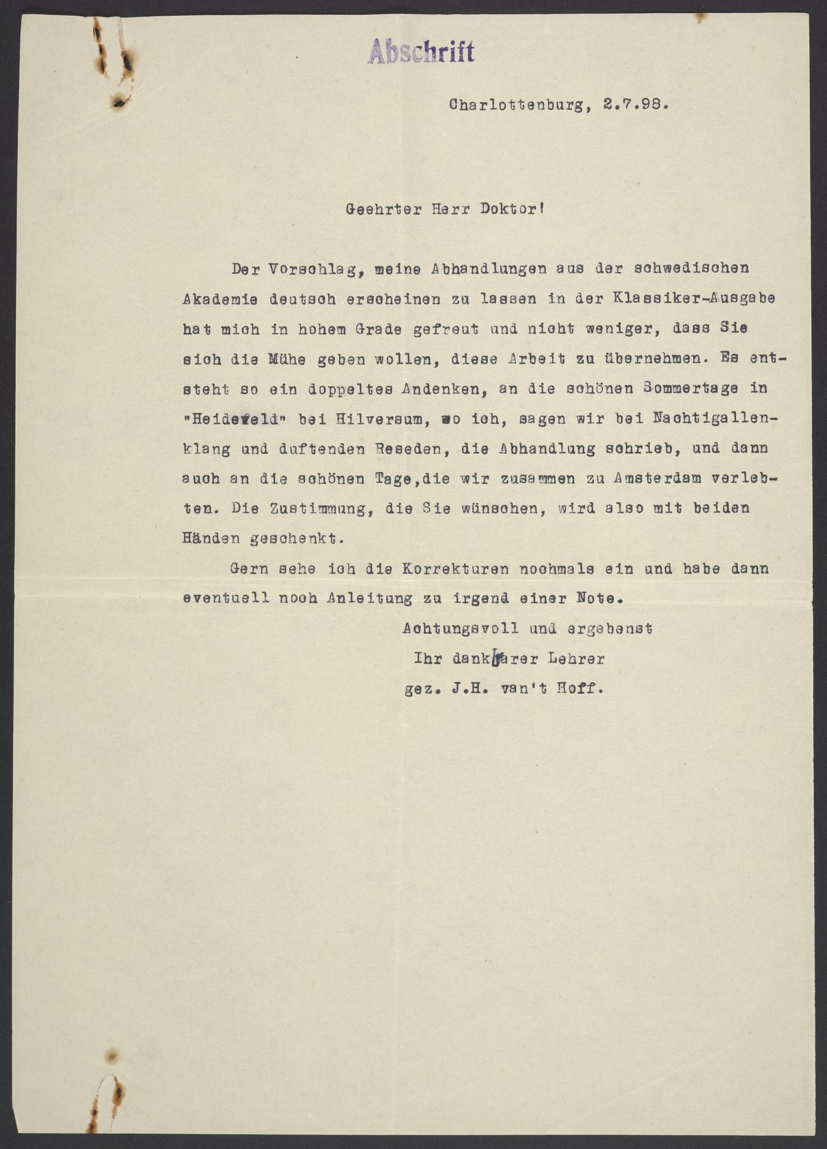 Der Vorschlag meine Abhandlungen aus der schwedischen Akademie deutsch erscheinen zu lassen in Klassiker-Ausgabe hat mich in hohem Grade gefreut und nicht weniger, dass Sie sich die Mühe geben wollen, diese Arbeit zu übernehmen. Es entsteht so ein doppeltes Andenken, an die schönen Sommertage in "Heideveld" bei Hilversum, wo ich, sagen wir bei Nachtigallenklang und duftenden Reseden, die Abhandlung schrieb, und dann auch an die schönen Tage, die wir zusammen zu Amsterdam verlebten. Die Zustimmung, die Sie wünschten, werden also mit beiden Händen geschenkt.