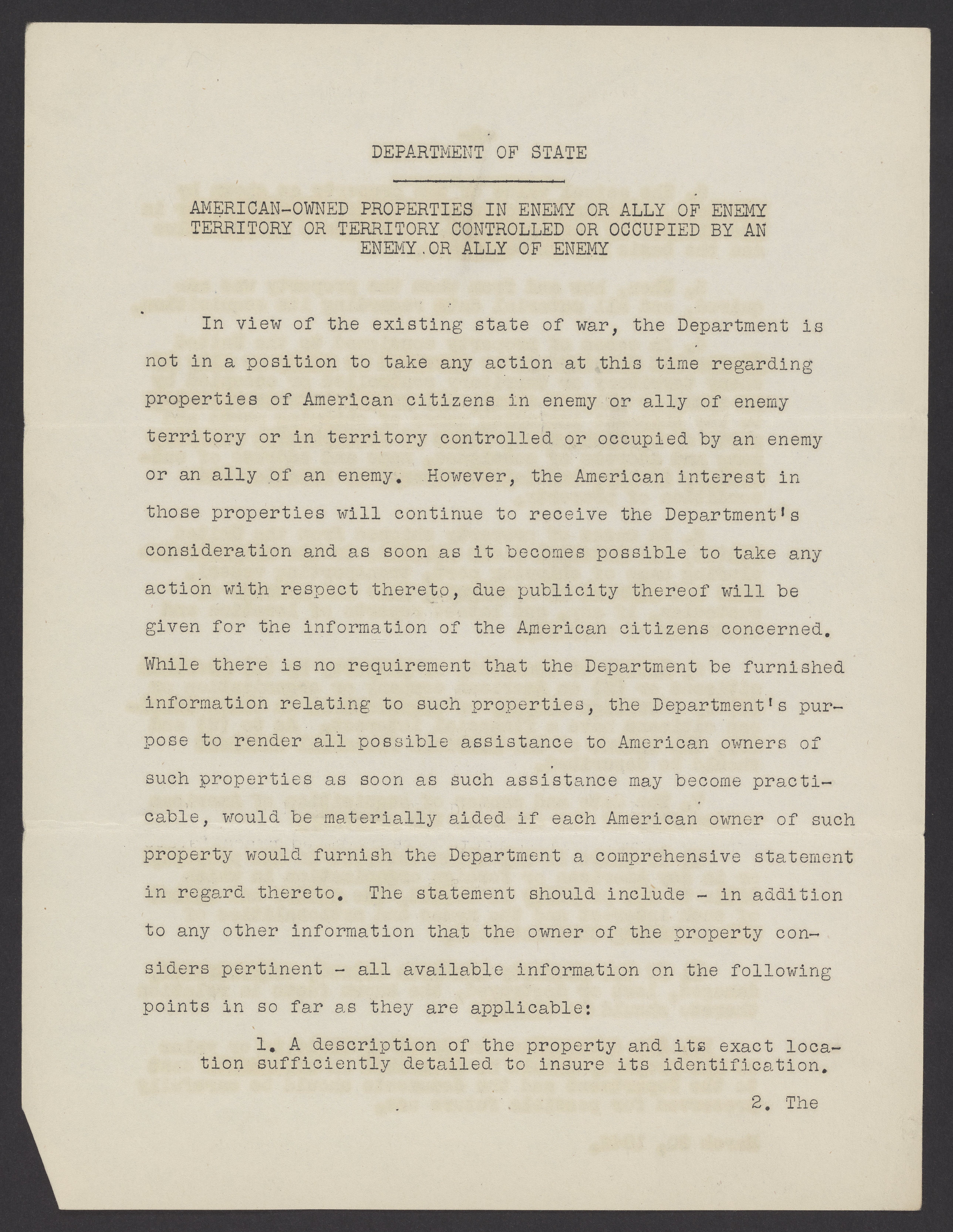 United States. Department of State. “American-Owned Properties in Enemy or Ally of Enemy Territory or Territory Controlled or Occupied by an Enemy or Ally of Enemy,” March 20, 1942. Ernst Berl Papers, Box 2, Folder 46. Science History Institute. Philadelphia. https://digital.sciencehistory.org/works/yzax1c1.