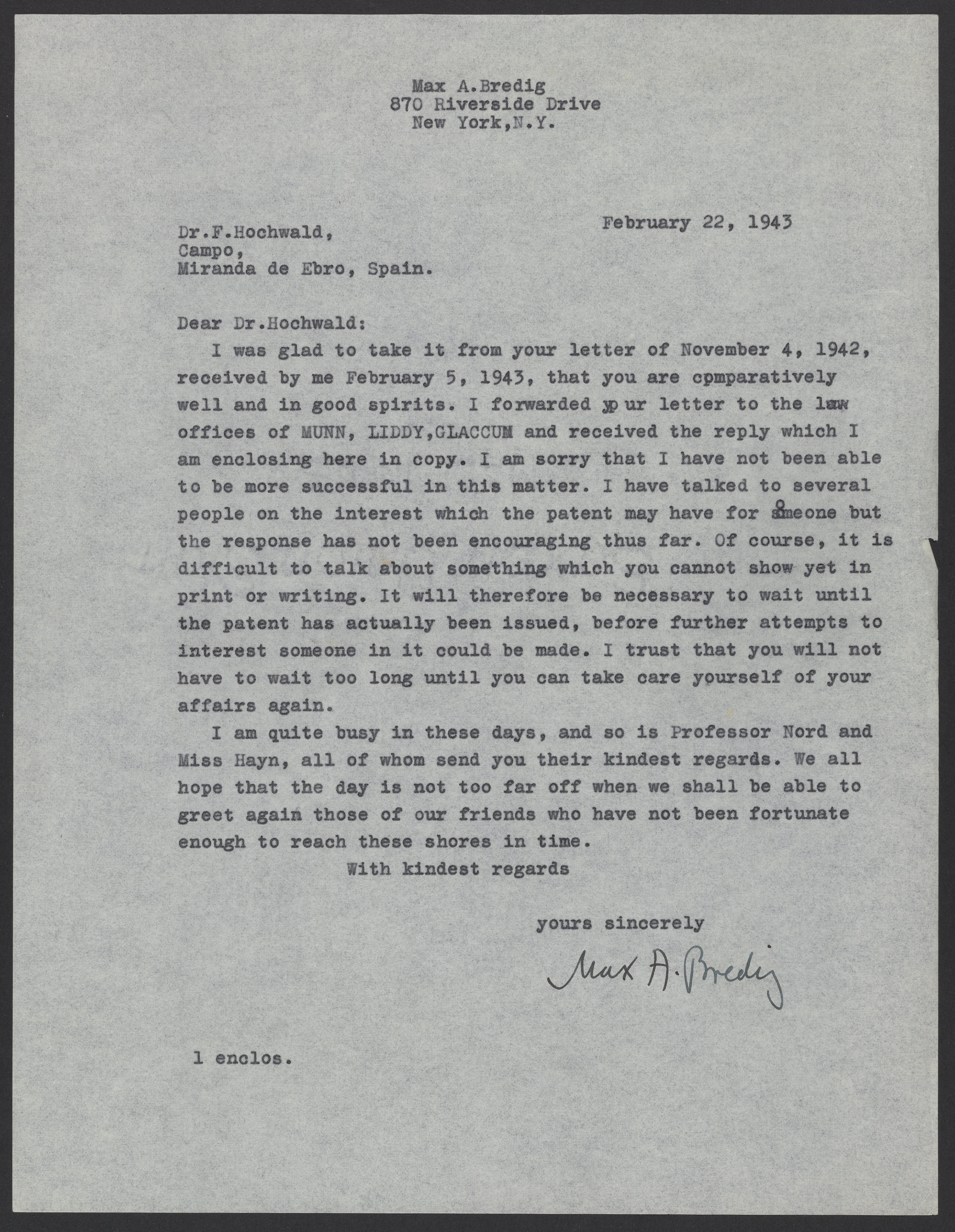 Max Albert Bredig (1902-1977) sends Fritz Hochwald (1897-1968) a response from Munn, Liddy, and Glaccum in reference to a patent application.