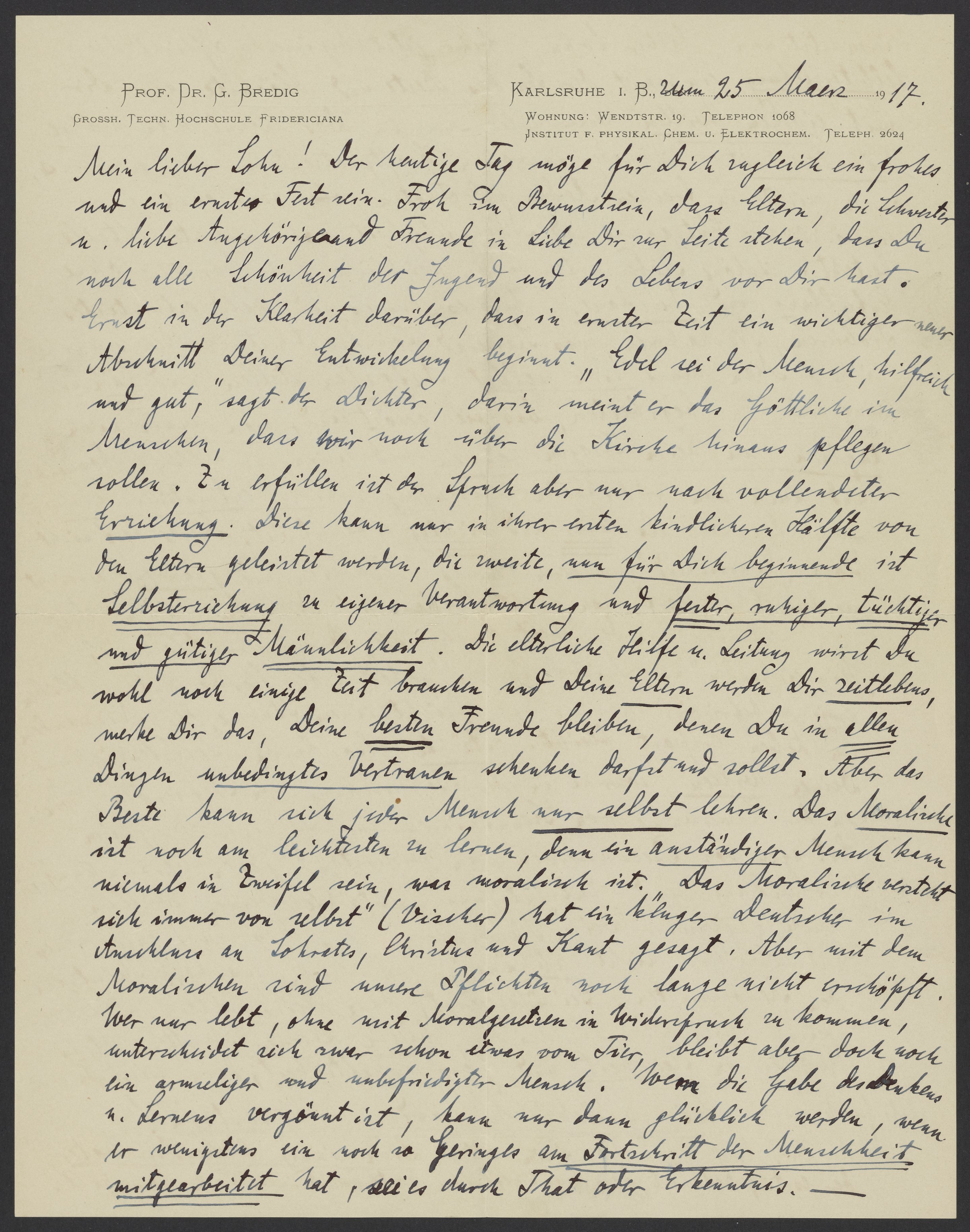 Mein lieber Sohn! Der heutige Tag möge für Dich zugleich ein frohes und ernstes Fest rein. Froh im Bewusstsein, dass Eltern, die Schwester, u. liebe Angehörige und Freund in Liebe Dir zur Seite stehen, dass Du noch alle Schönheit der Jugend und des Lebens vor Dir hast. Ernst in der Klarheit darüber, dass in erster Zeit ein wichtiger neuer Abschnitt Deiner Entwicklung beginnt. „Edel sei der Mensch, hilfreich und gut,“ sagt der Dichter, darin meint er das Göttliche im Menschen, dass wir noch über die Kirche hinaus pflegen sollen. Zu erfüllen ist der Spruch aber nur nach vollendeter Erziehung. Diese kann nur in ihrer ersten kindlichen Hälfte von den Eltern geleistet werden, die zweite nun für Dich beginnend ist Selbsterziehung zu eigener Verantwortung und fester, ruhiger, tüchtiger und gütiger Männlichkeit. Die elterliche Hilfe u. Leitung wirst Du wohl noch einige Zeit brauchen und Deine Eltern werden Dir zeitlebens, merke Dir das, Deine besten Freunde bleiben, denen Du in allen Dingen unbedingtes Vertrauen schenken darfst und sollst. Aber das Beste kann sich jeder Mensch nur selbst lehren. Das Moralische ist noch am leichtesten zu lernen, denn ein anständiger Mensch kann niemals in Zweifel sein, was moralisch ist. „Das Moralische versteht sich immer von selbst“ (Zischer) hat ein klüger Deutscher im Anschluss an Sokrates, Christus und Kant gesagt. Aber mit dem Moralischen sind unsere Pflichten noch lange nicht erschöpft. Wer nur lebt, ohne mit Moralgesetzen in Widerspruch zu kommen, unterscheidet sich zwar schon etwas von Tier, bleibt aber doch noch ein armseliger und unbefriedigter Mensch. Wenn die Gabe des Denkens u. Lernens vergönnt ist, kann nur dann glücklich werden, wenn er wenigstens ein noch so Geringes am Forschritt der Menschheit mitgearbeitet hat, sei es durch That oder Erkenntnis.
