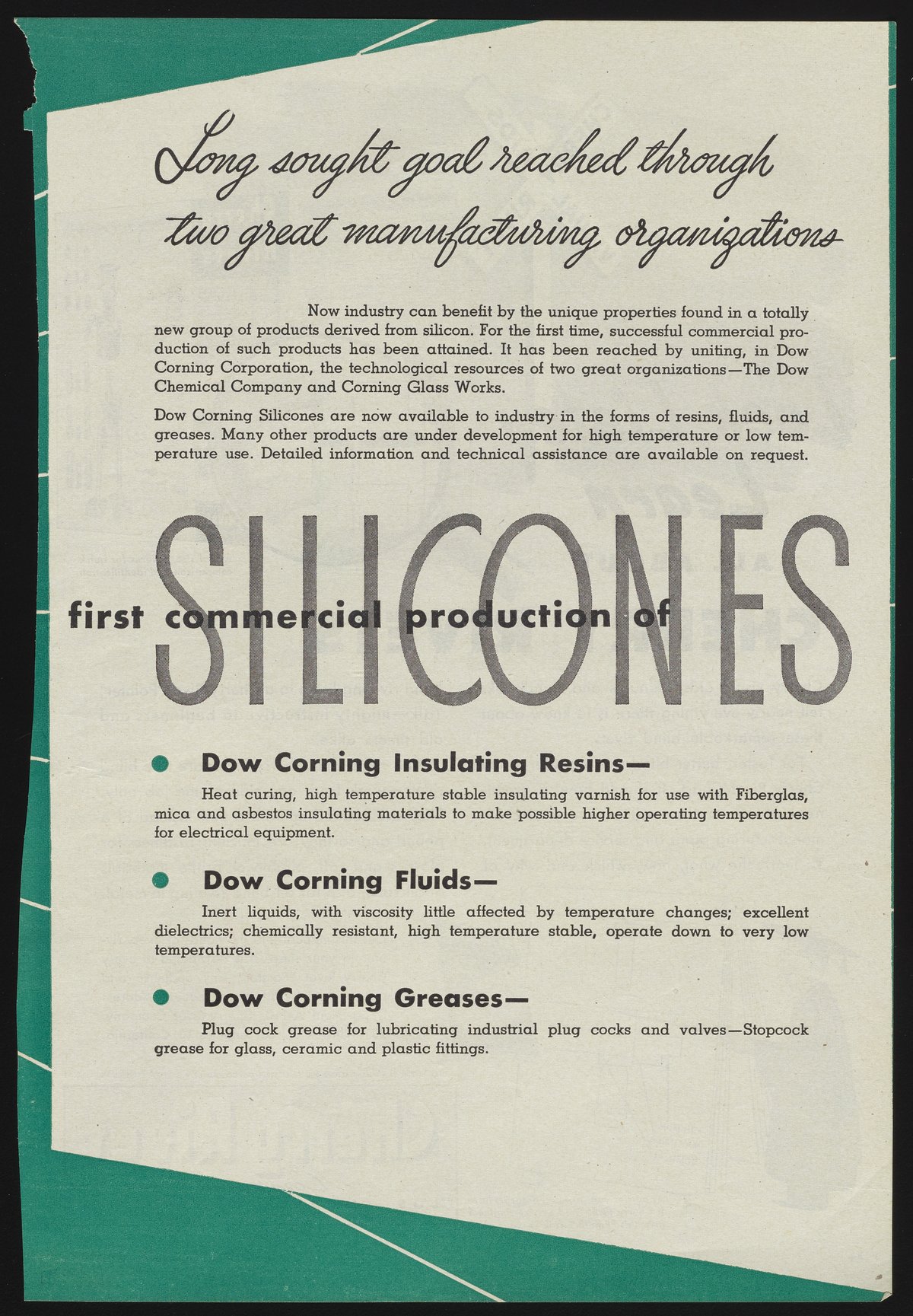 Dow Chemical Company. “Dow Corning Announces First Commercial Production of Silicones,” July 1944. Advertisements from the Dow Chemical Historical Collection, Box 7. Science History Institute. Philadelphia. https://digital.sciencehistory.org/works/z029p5457.