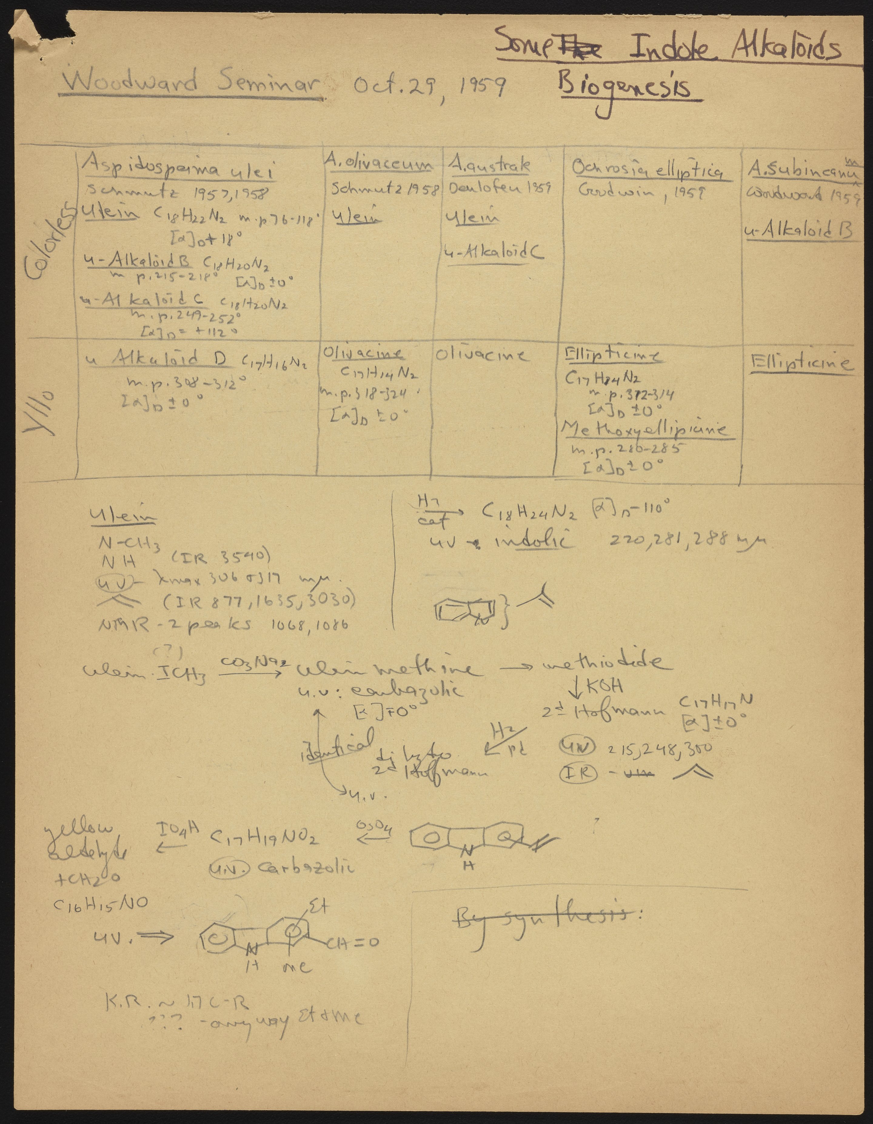 Kohler, Robert E. “R. B. (Robert Burns) Woodward Seminar Entitled ‘Some Indole Alkaloids Biogenesis.’” Notes from R. B. (Robert Burns) Woodward's Seminars, circa 1959–1966. Folder 2. Science History Institute. Philadelphia. https://digital.sciencehistory.org/works/z029p5792.