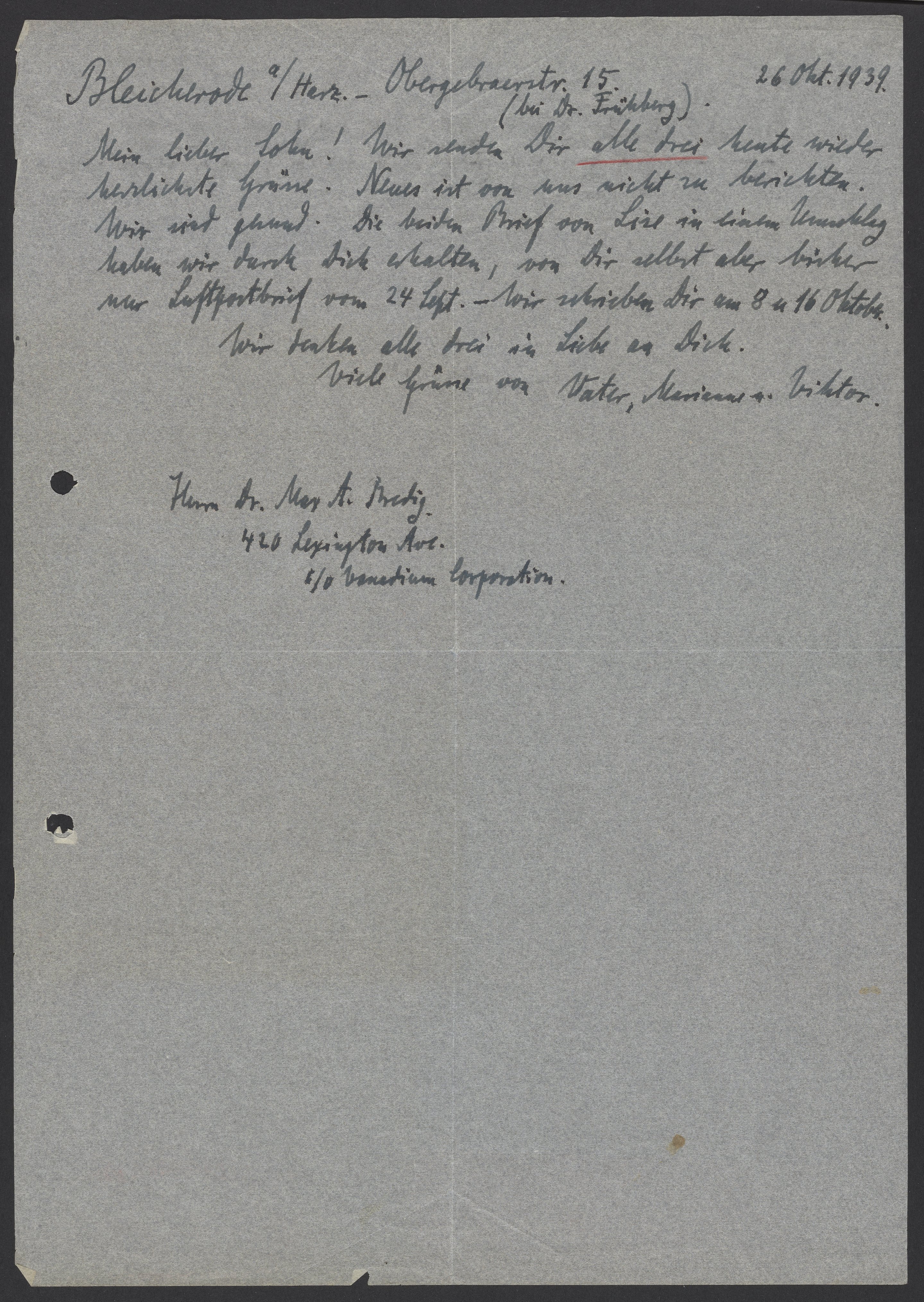 Letter from Georg Bredig to Max Bredig, October 26, 1939