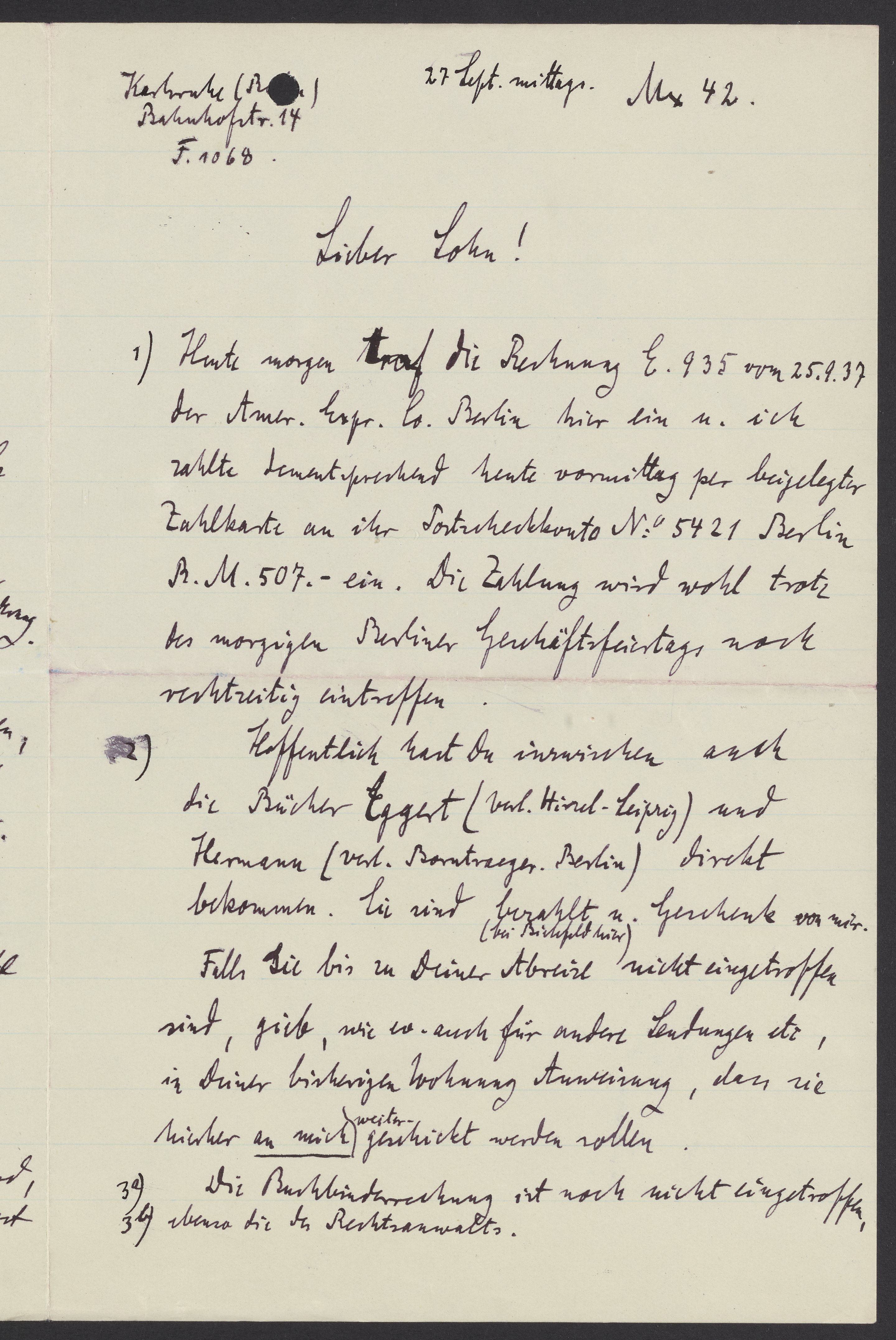 1) Heute morgen traf die Rechnung E. 935 von 25.9.37 der Amer. Expr. Co. Berlin hier ein u. ich zahlte dementsprechend heute Vormittag per beigelegter Zahlkarte an ihr Postscheckkonto No. 5421 Berlin R.M. 507. ein. Die Zahlung wird wohl trotz des morgigen Berliner Geschäftsfeiertags noch rechtzeitig eintreffen.