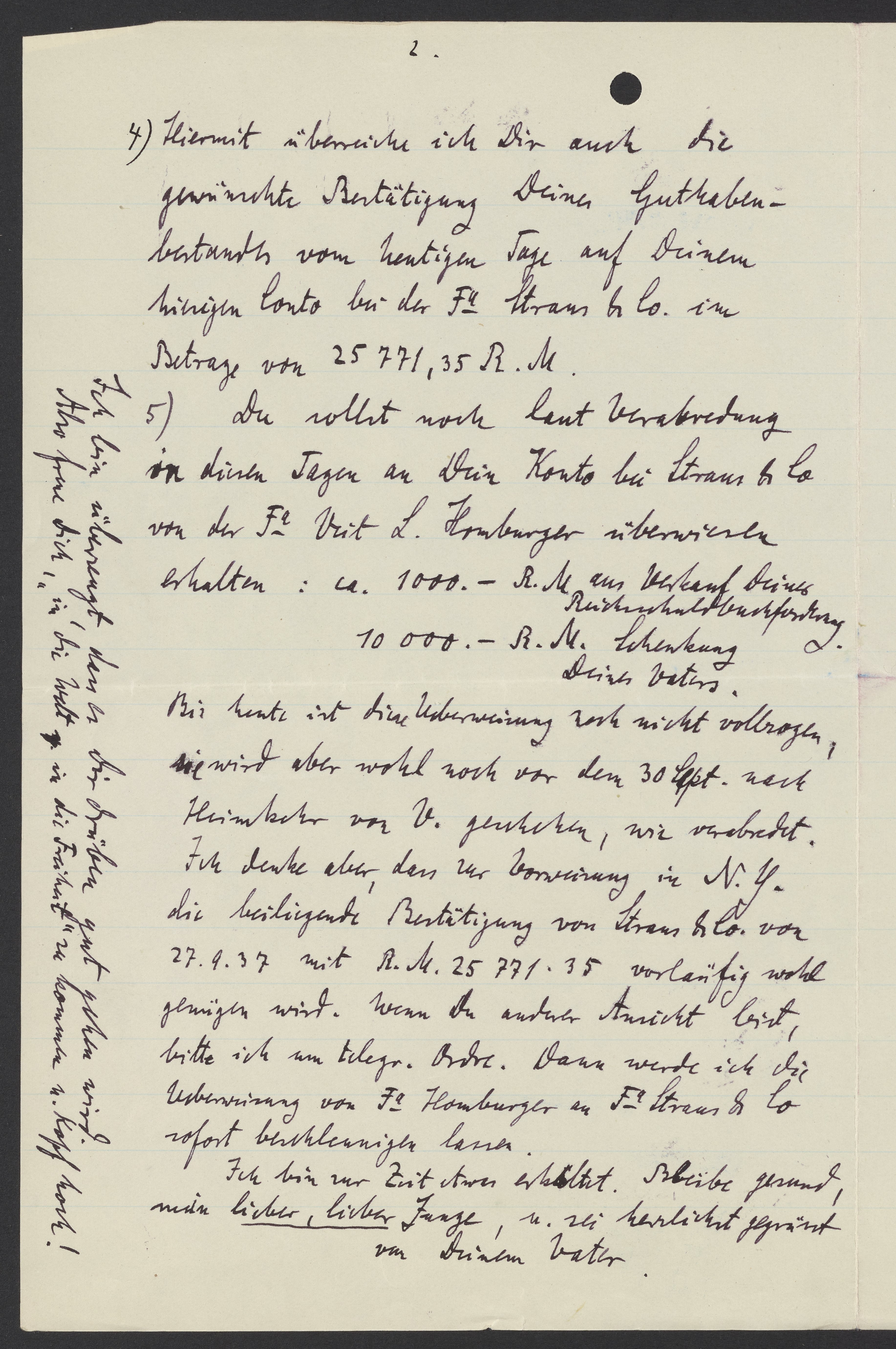4) Hiermit überreiche ich Dir auch die gewünschte Bestätigung Deiner Guthabenbestandes vom heutigen Tage auf Deinem hiesigen Conto bei der Fa. Straus & Co im Betrage von 25771, 35 R.M.