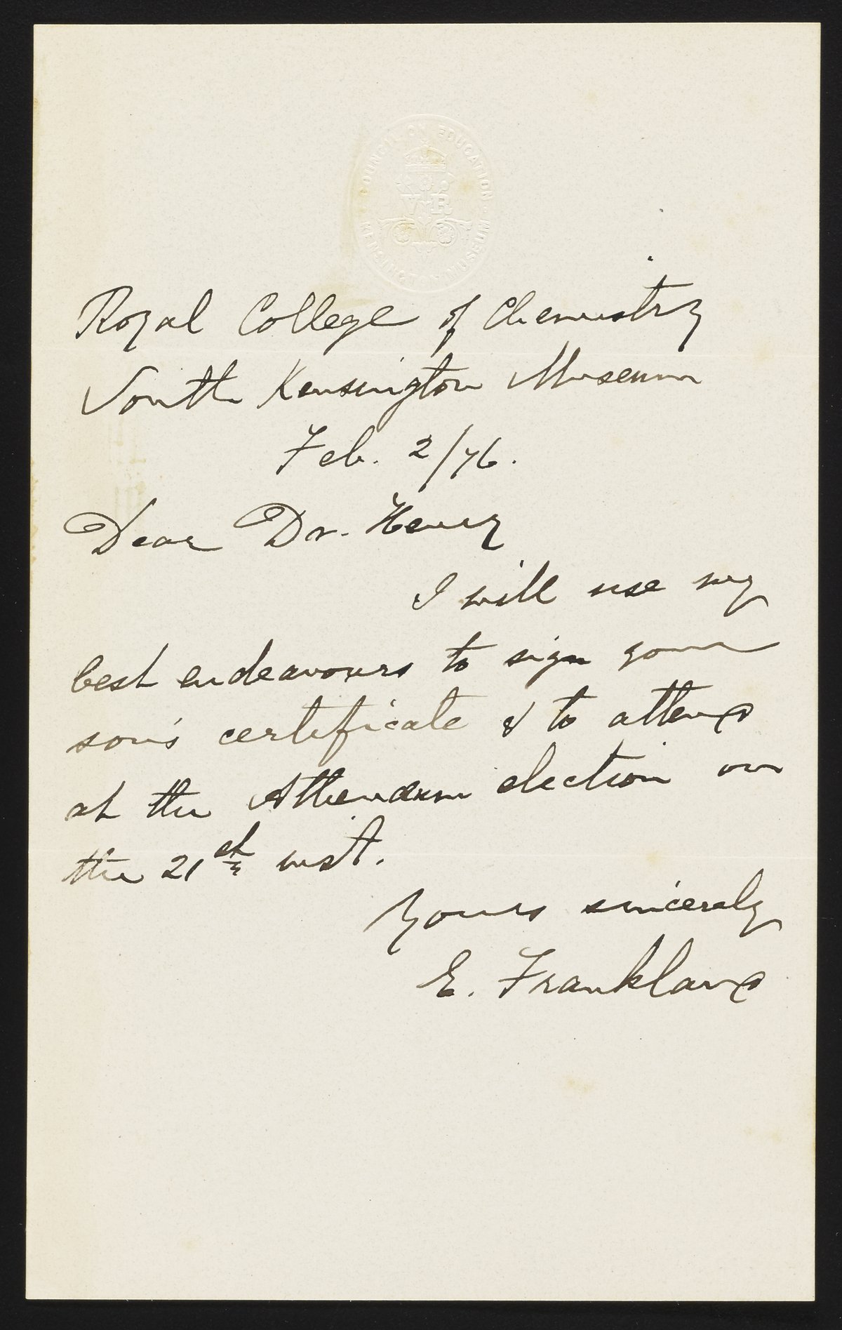 Concerns Frankland's intention to sign Dr. Henry's son's certificate so that he may attend the Athenaeum election. Letterhead is embossed, "Council on Education Kensington Museum."