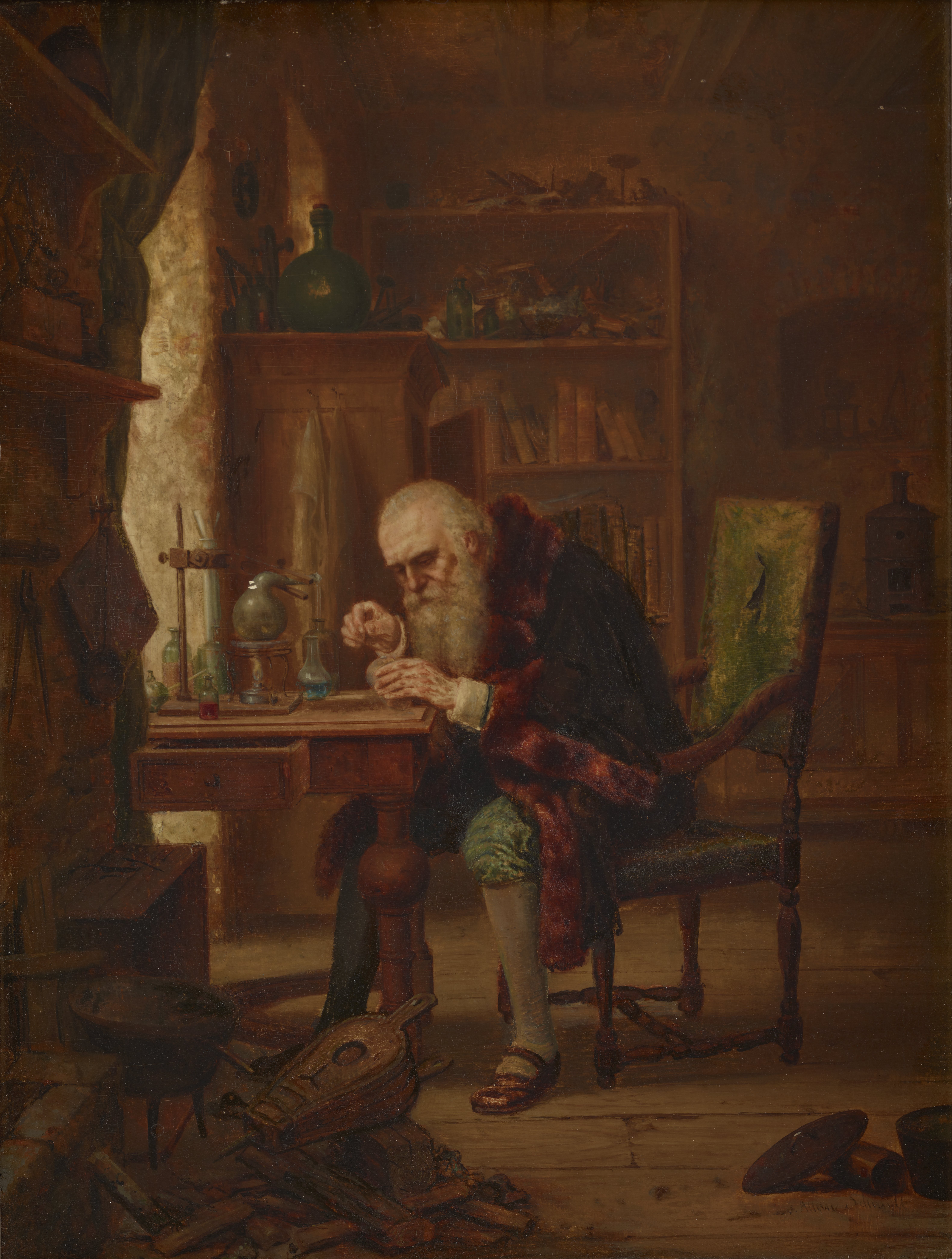 A bearded, elderly alchemist in a fur-trimmed coat leans close over a tabletop experiment. The equipment on his lab bench includes an adjustable clamp stand and an alcohol burner, contemporary to the 1800s. Small vials and flasks, as well as a glass alembic, are arranged over the table or secured with a clamp. In the foreground a small furnace, bellows, and a pile of fuel for the fire suggest further experiment. Though his work is solitary and his surroundings are shabby- even the back of his green velvet chair is torn and dirtied- the large bookcase on the rear wall signals study and scholarly habits.