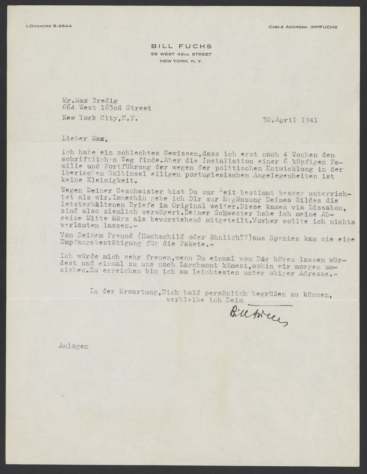 Letter from Bill Fuchs to Max Bredig, April 30, 1941