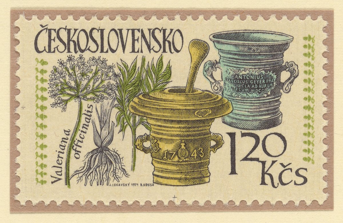 1971 Czechoslovakian postage stamp featuring the medicinal herb Valerian (Valeriana officinalis) alongside antique pharmacy mortars and pestles. Valerian is a plant that was used by the Greeks and Romans to treat insomnia, migraines, fatigue, and stomach cramps. Today, it is commonly sold as a dietary supplement to treat insomnia.