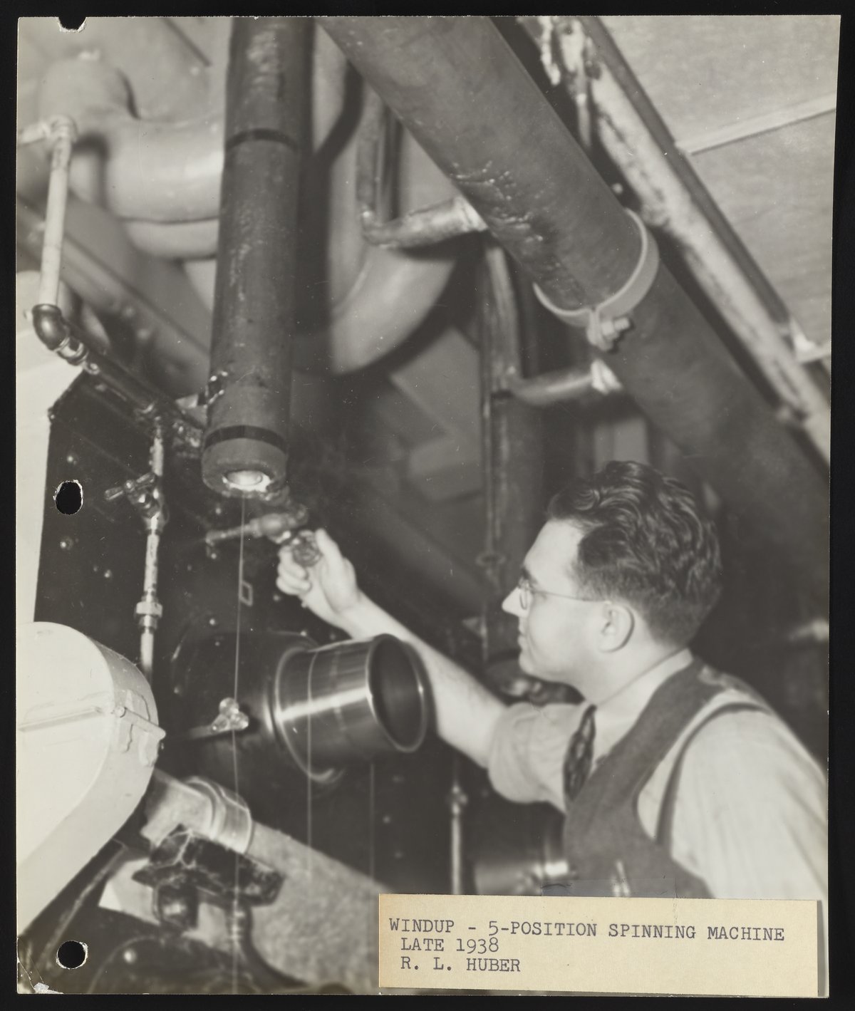 Close-up view of DuPont employee Richard L. Huber adjusting the steam chimney on a five-position windup and spinning machine at the DuPont pilot plant in Wilmington, Delaware during the early stages of nylon production and research. The steam chimney was used to expose the newly-spun nylon yarn to moisture, which stabilized the fiber and allowed it be wound onto a bobbin.