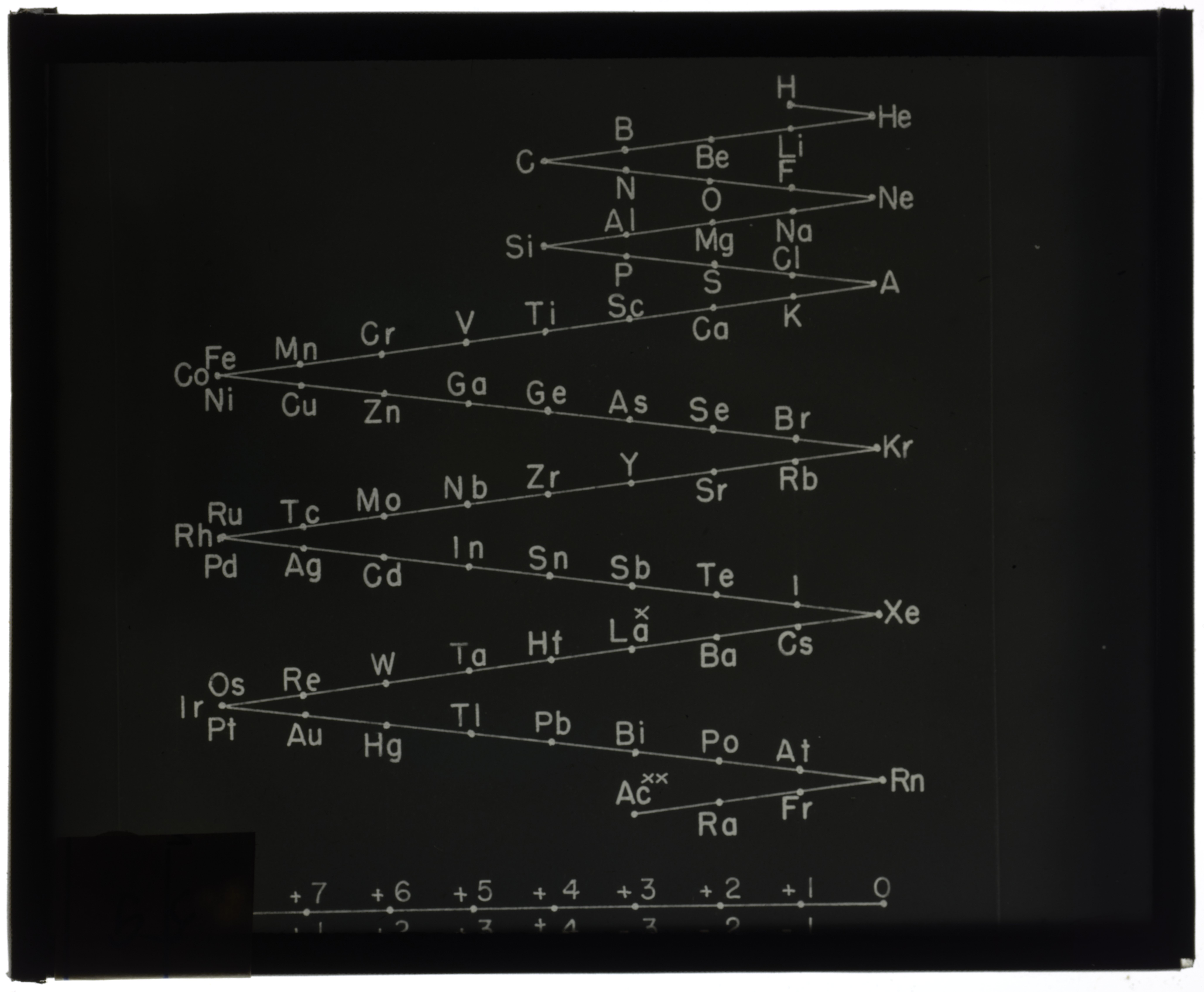 Woodiwiss, George, and Edward G. Mazurs. “Periodic Table in Style of a Zigzag (George Woodiwiss, 1906).” Glass (material), circa 1906–1957. Edward G. Mazurs Collection of Periodic Systems Images, Box 1. Science History Institute. Philadelphia. https://digital.sciencehistory.org/works/z603qz049.