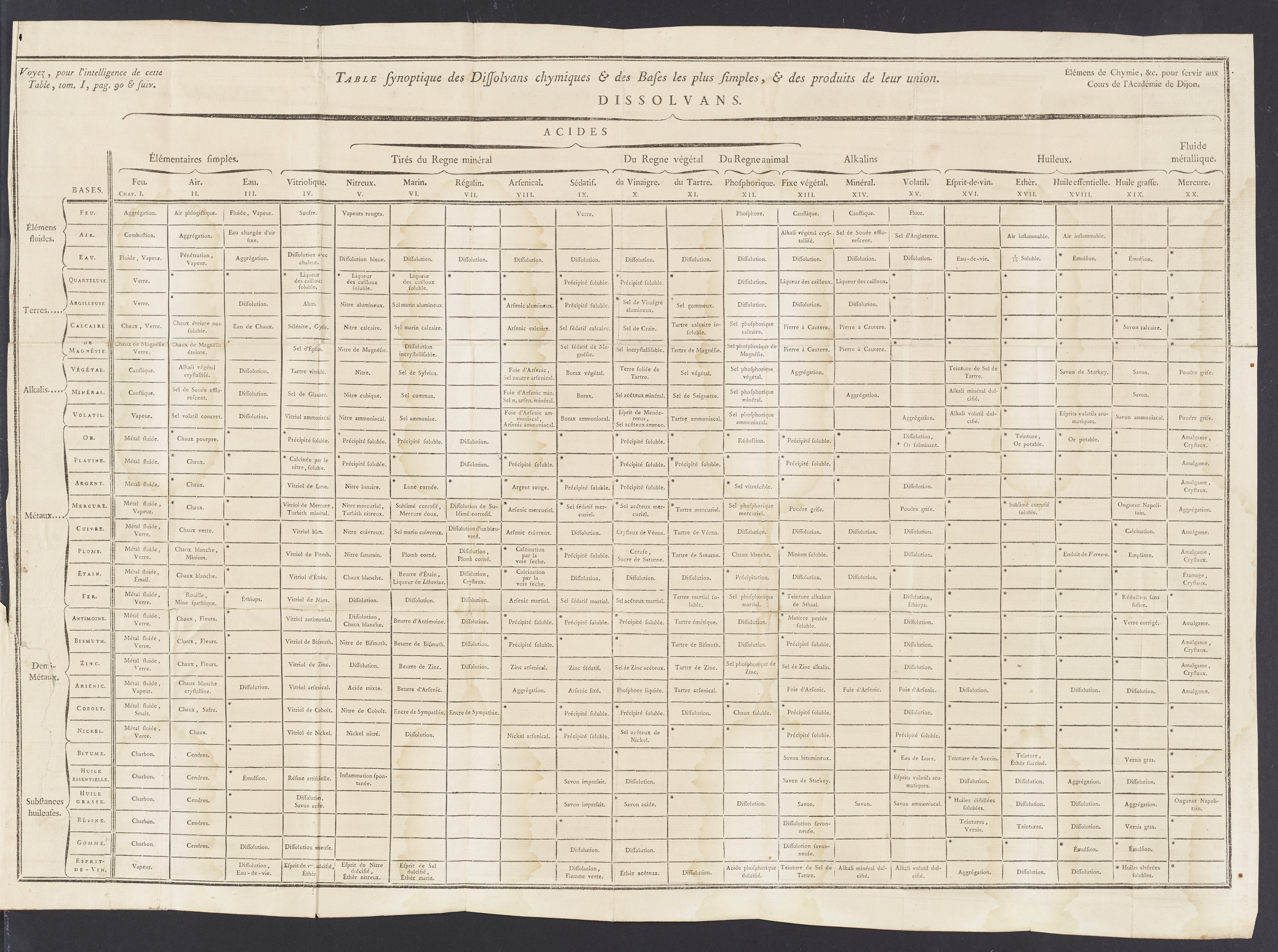 Small JPG1200 x 2064px — 366 KBFull-sized JPG1719 x 2957px — 648 KBOriginal fileTIFF — 1719 x 2957px — 14.6 MBTextbook by Louis-Bernard Guyton de Morveau (1737-1816) and his colleagues, written to accompany the course of chemistry they gave under the auspices of the Academy of Dijon. The work was hailed throughout Europe as an important milestone and de Morveau became famous almost overnight. The treatise was a precursor to de Morveau's Nomenclature chimique, which was first published by him in the Journal de Physique (1782).