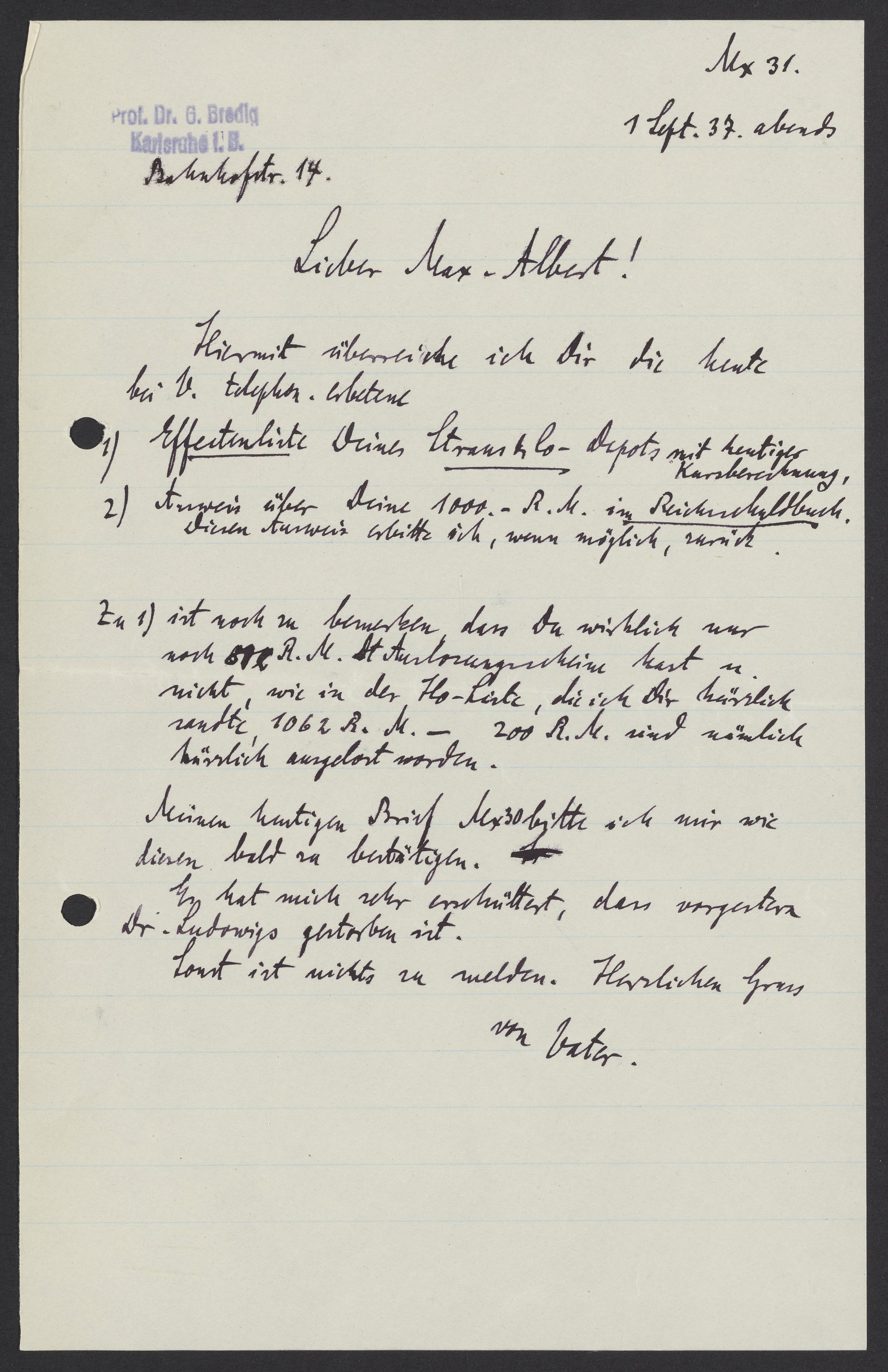 Letter from Georg Bredig to Max Bredig, September 7, 1937