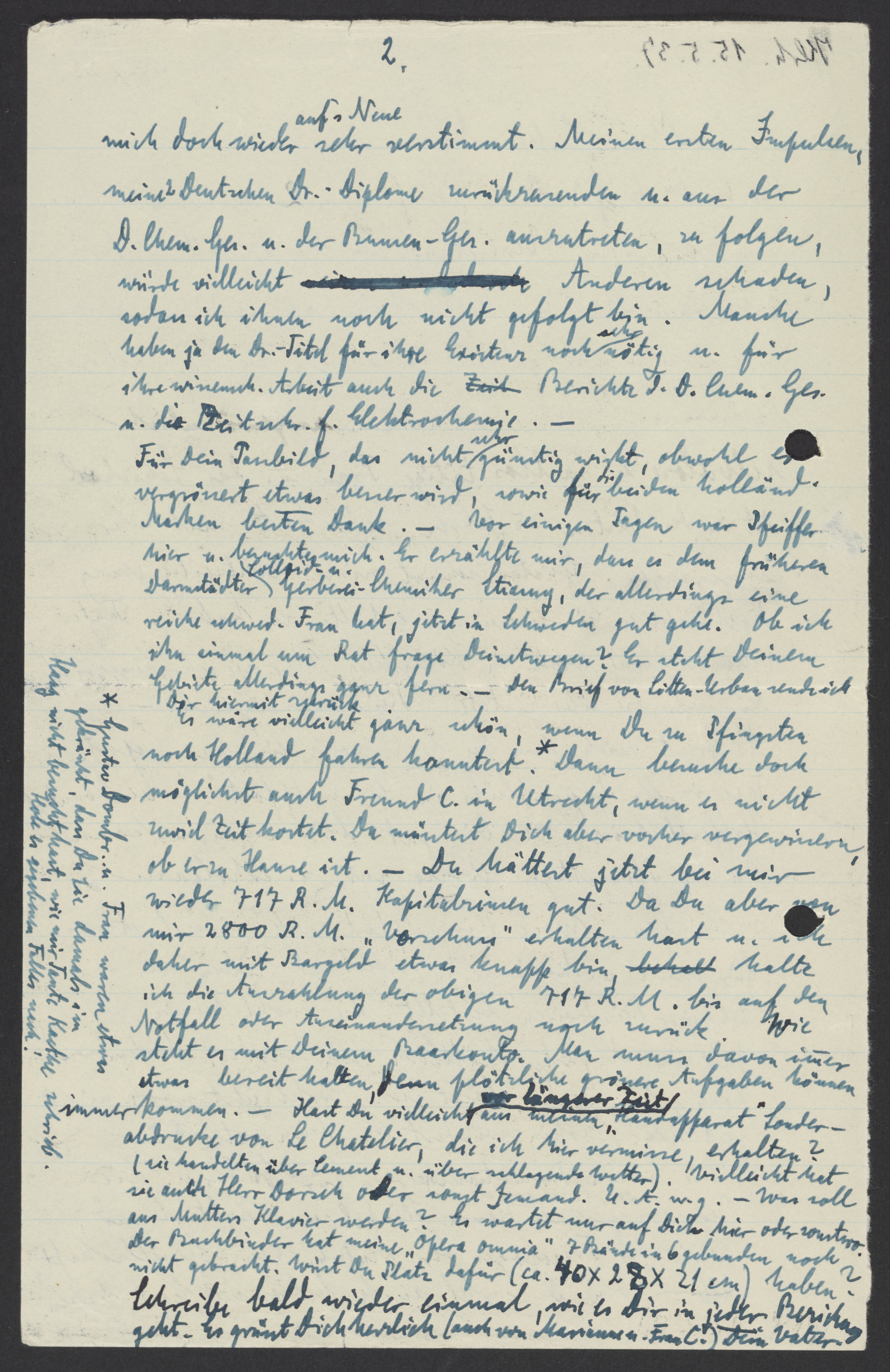Es wäre vielleicht ganz schön, wenn Du zu Pfingsten nach Holland fahrest konntest.* Dann besuche doch möglichst auch Freund C. in Utrecht, wenn es nicht zuviel Zeit kostet. Du müsstest Dich aber vorher vergewissern, ob er zu Hause ist. – Du hättest jetzt bei mir wieder 717 R.M. Kapitalzinsen gut. Da Du aber von mir 2800 R.M. „Vorschuss“ erhalten hast u. ich daher mit Bargeld etwas knapp bin, halte ich die Auszahlung der obigen 717 R.M. bis auf den Notfall oder Auseinandersetzung noch zurück. Wie steht es mit Deinem Baarkonto. Mann muss davon immer etwas bereit halten, denn plötzliche grosse Aufgaben können immer kommen. – Hast Du vielleicht vor längerer Zeit aus meinem „Handapparat“ Sonderabdrucke von Le Chatelier, die ich hier vermisse, erhalten? (sie handelten über Cement u. über schlagendes Wetter). Vielleicht hat sie auch Herr Dorsch oder sonst Jemand U. A. w.g. – Was soll aus Mutters Klavier werden? Es wartet nur auf Dich hier oder sonstwo. Der Buchbinder hat meine „Opera Omnia“ 7 Bände in 6 gebunden noch nicht gebracht. Wirst Du Platz dafür (ca. 40 x 28 x 21 cm) haben? Schreibe bald wieder einmal, wie es Dir in jeder Beizehung geht. Es grüsst Dich herzlich (auch von Marianne u. Frau C.) Dein Vater