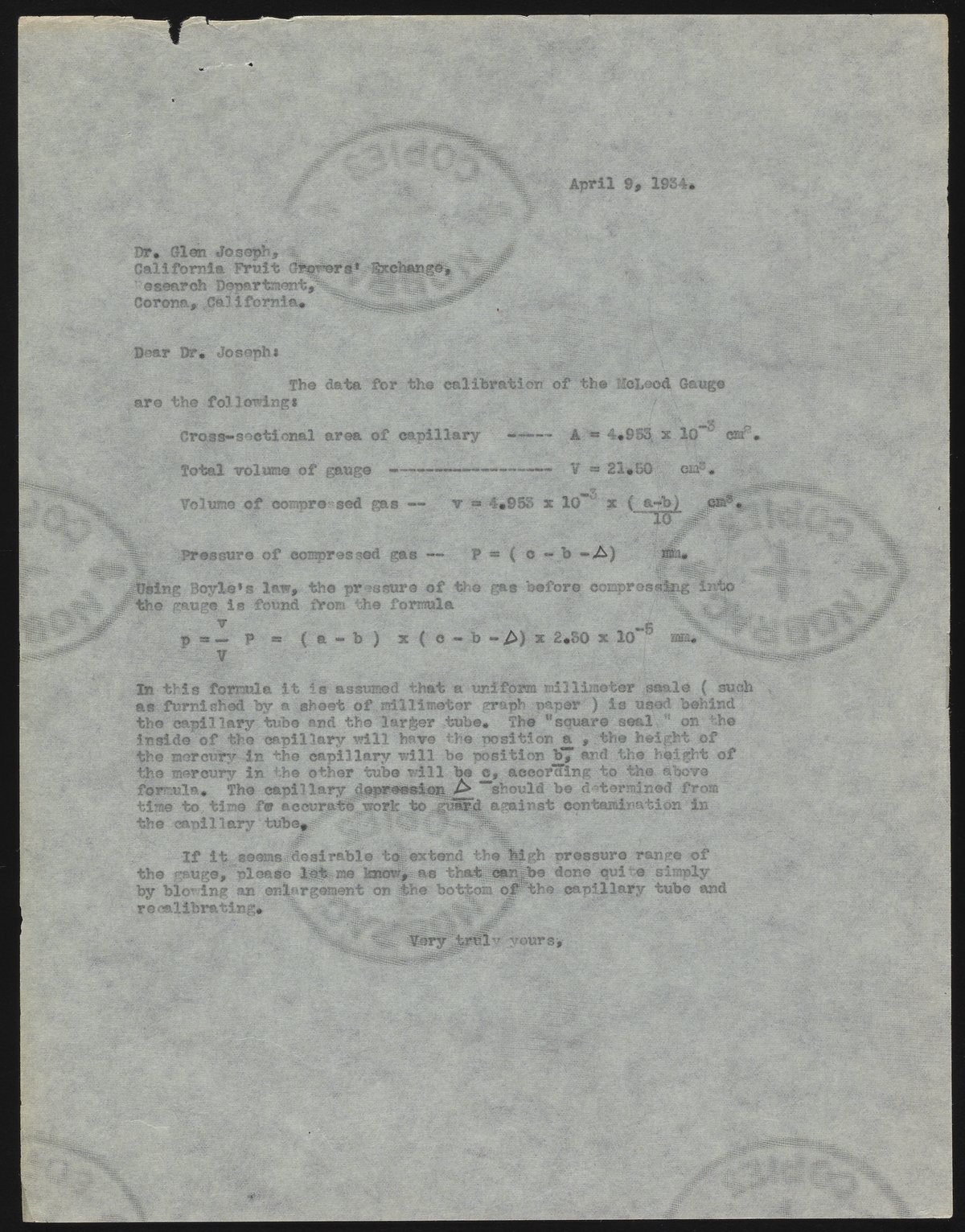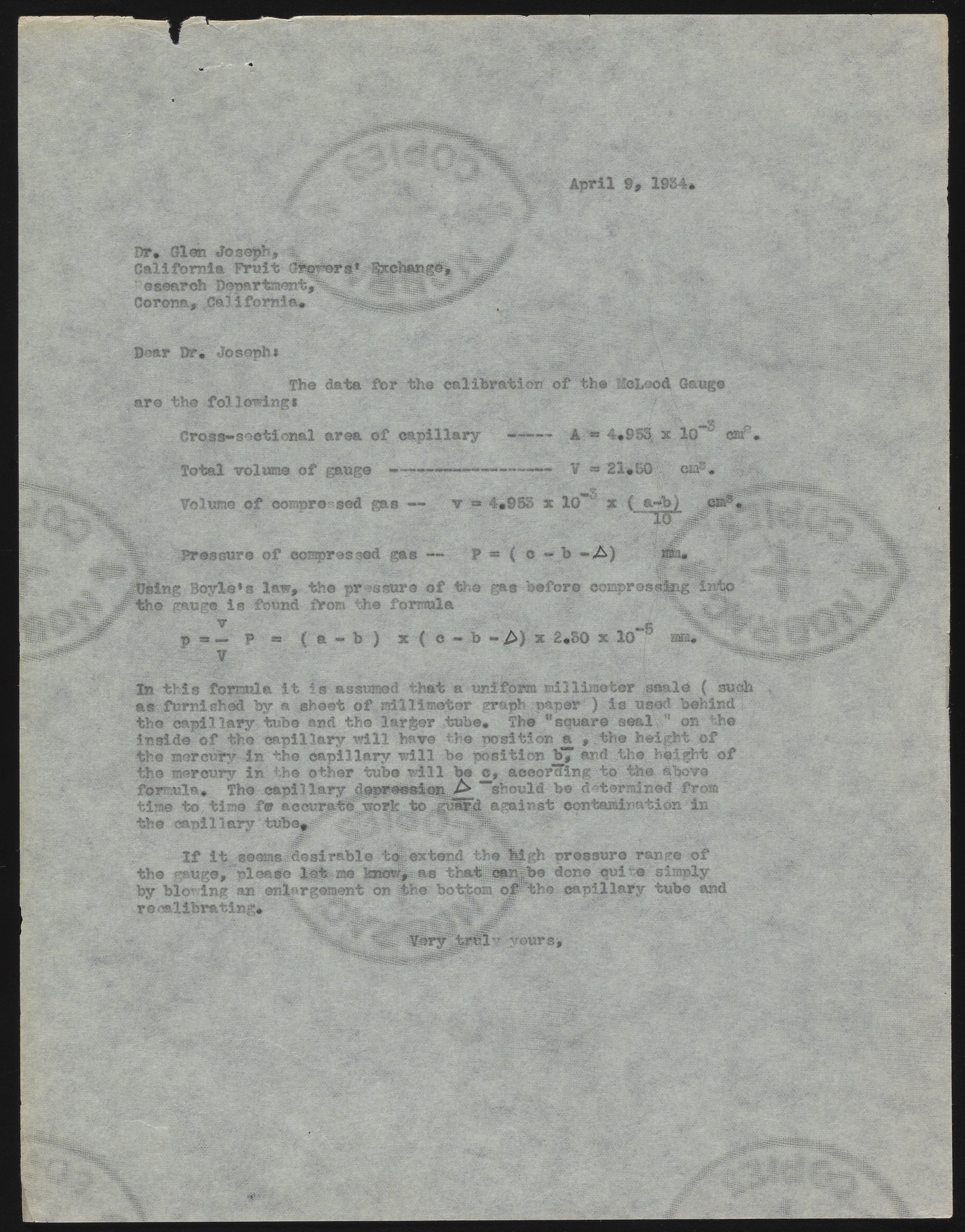Directions for calibrating a McLeod gauge for use with the early model of the Beckman pH meter. This letter is likely related to the handwritten McLeod gauge diagrams and calculations also found in this folder. At the time of this letter, Joseph was a researcher for the California Fruit Growers Exchange.