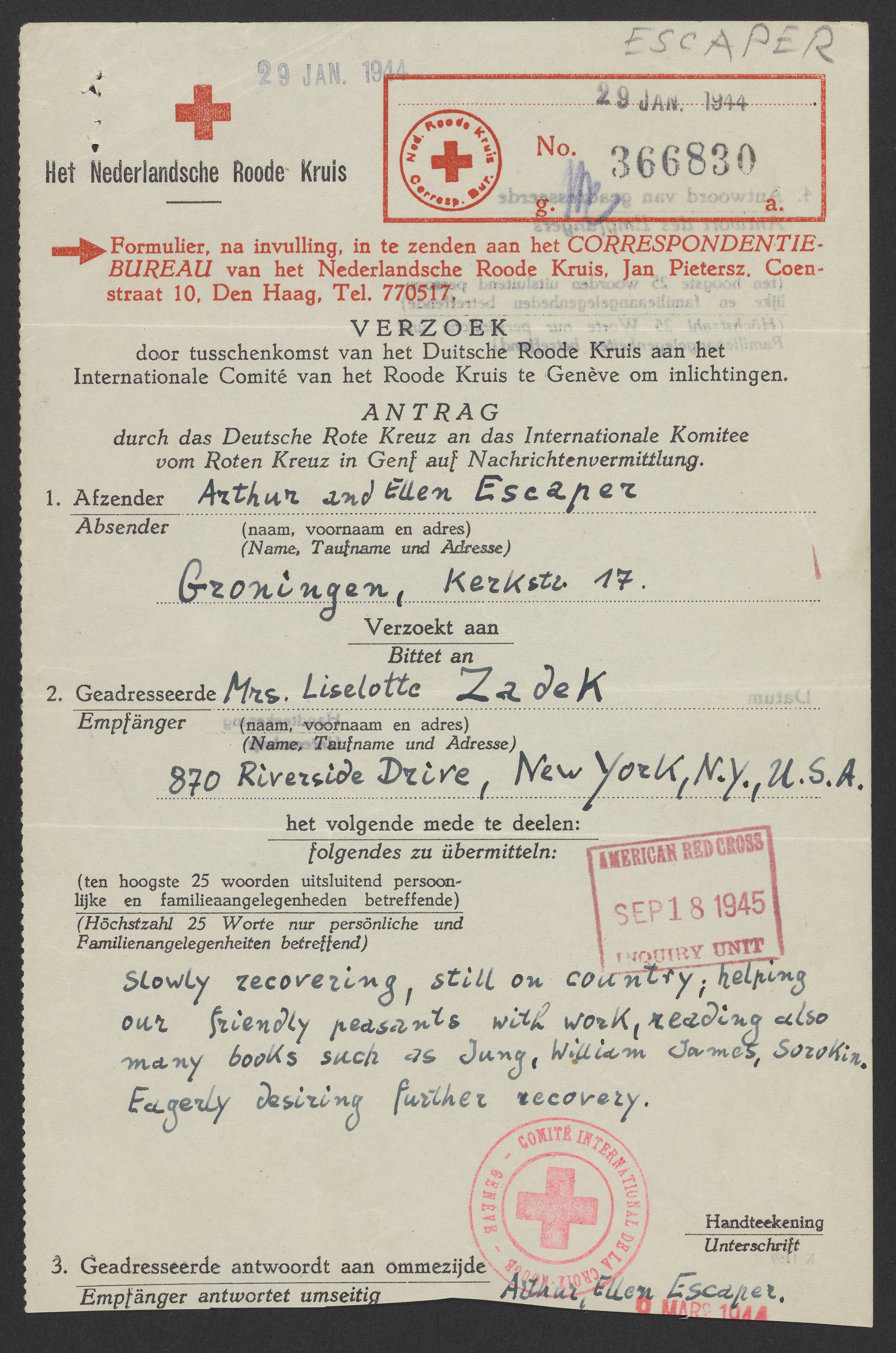 Message from Arthur and Ellen Escaper (Alfred and Eva Schnell) to Mrs. Liselotte Zadek, January 29, 1944