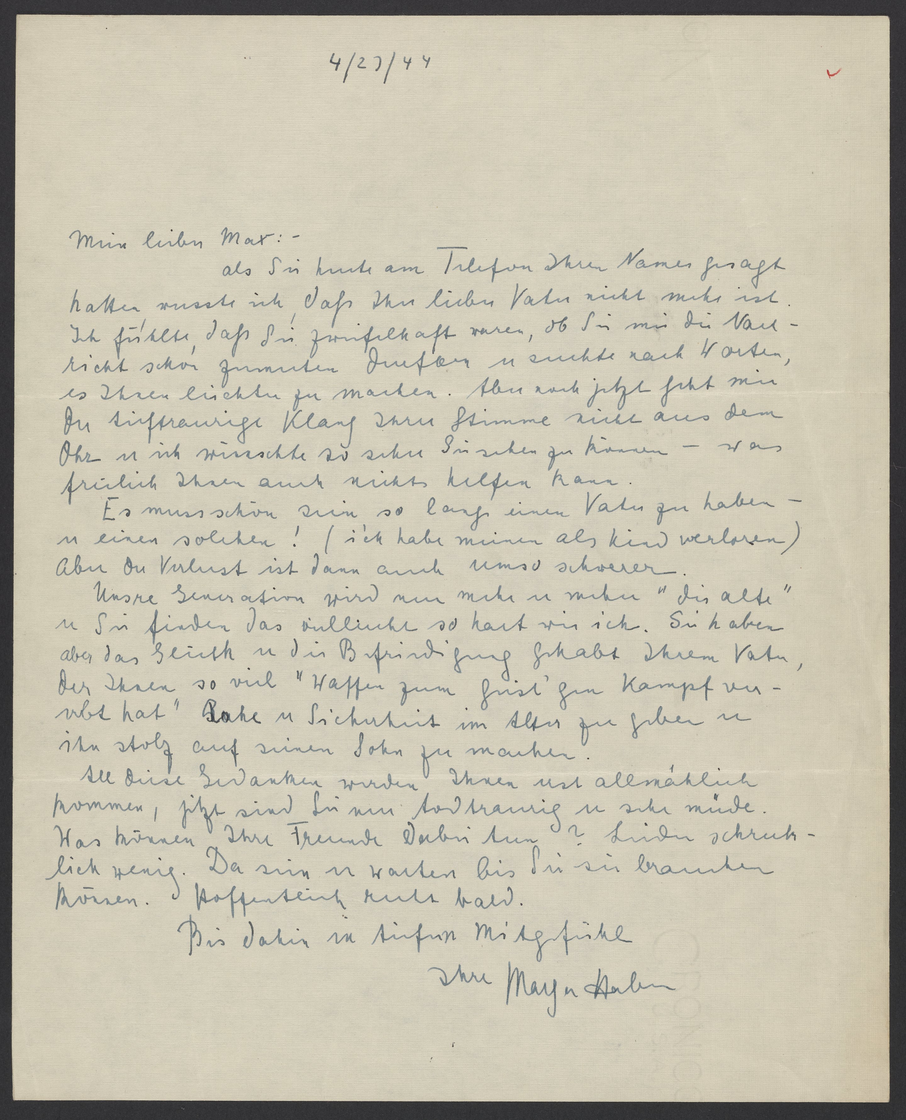 als Sie heute am Telefon Ihren Name gesagt hatten, wusste ich daß Ihr lieber Vater nicht mehr ist. Ich fühlte, daß Sie zweifelhaft waren, ob Sie mir die Nachricht schon zumuten dürfen u. suchte nach Worten, es Ihnen leichter zu machen. Aber noch jetzt geht mir der traurige Klang Ihrer Stimme nicht aus dem Ohr u. ich wünschte zu sehr Sie sehen zu können – was freilich Ihnen auch nichts helfen kann.