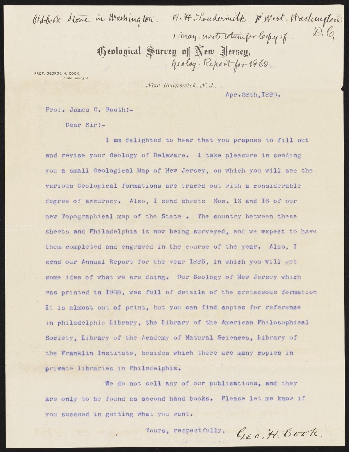 Small JPG1200 x 1551px — 231 KBLarge JPG2880 x 3723px — 1.2 MBFull-sized JPG4996 x 6458px — 3.6 MBOriginal fileTIFF — 4996 x 6458px — 92.4 MBGeorge Hammell Cook (1818-1889) of the Geological Survey of New Jersey, responds to James Curtis Booth's (1810-1888) request to acquire a copy of Cook's Geology of New Jersey (1868).