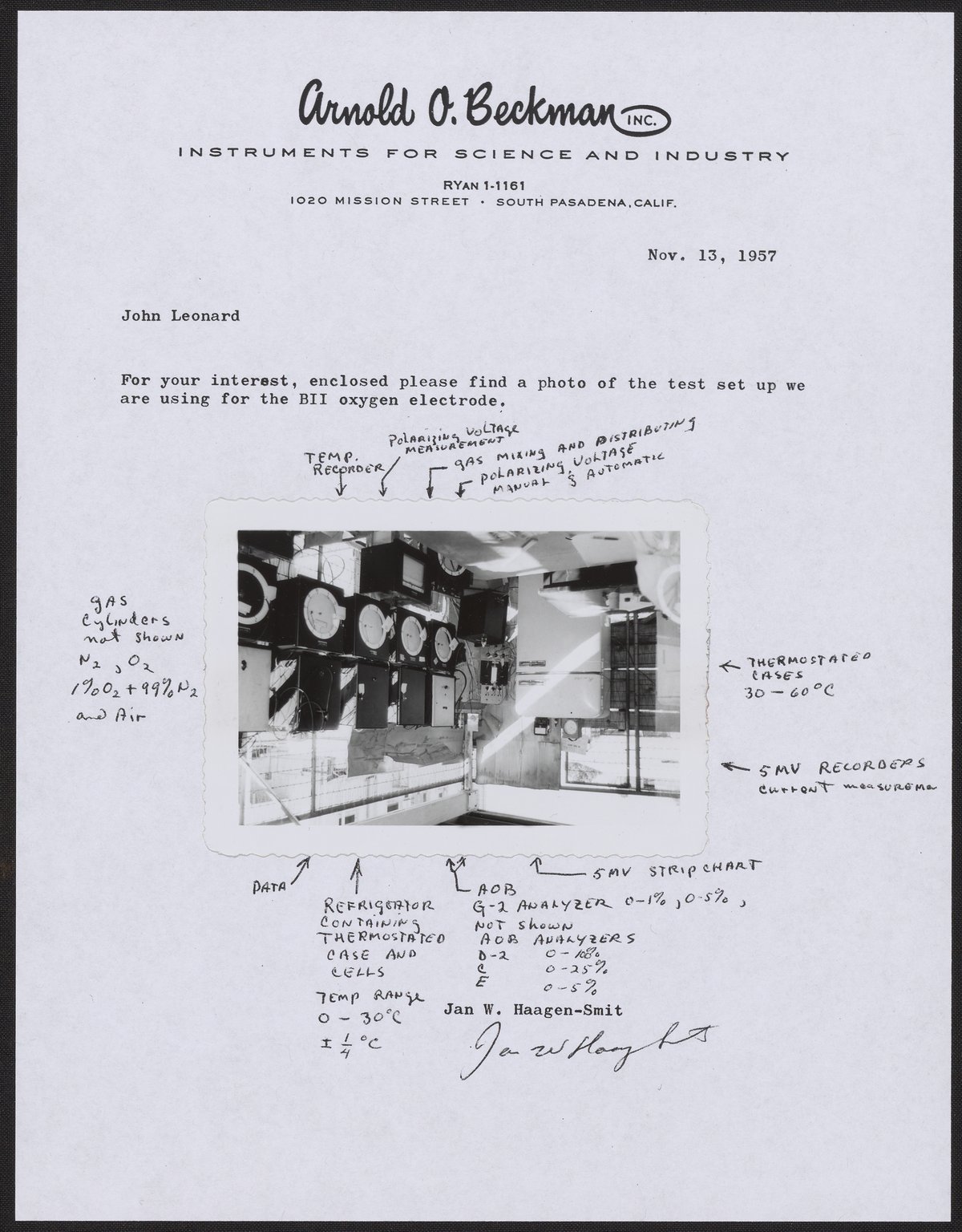 In this memo, Jan Haagen-Smit includes a labeled photograph of the testing set-up for the Beckman oxygen electrode, which includes Beckman Oxygen Analyzers. The memo (but not the photograph) in this digitized image is a photocopy of the original.