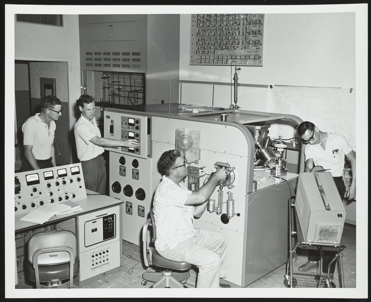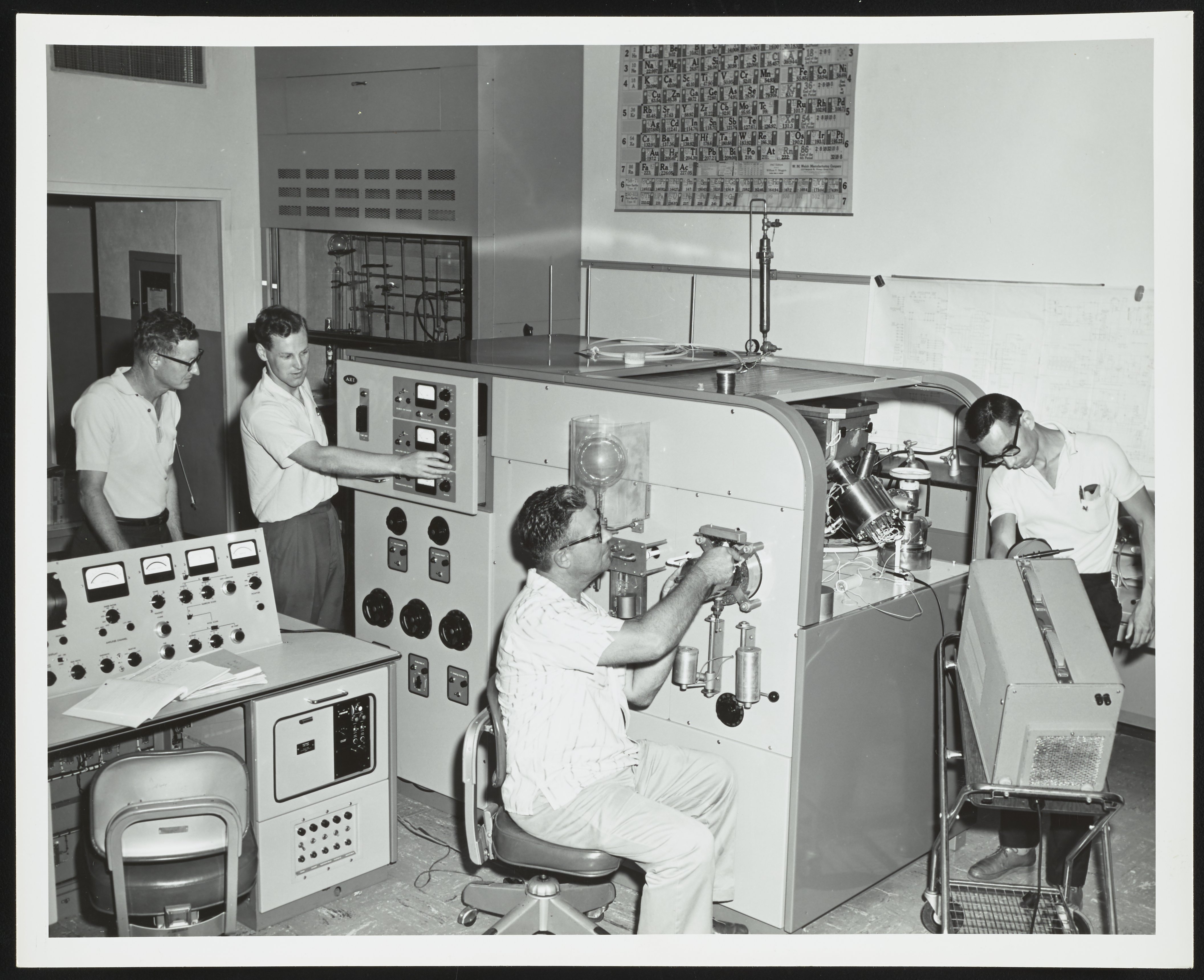 Installation of the Mass Spectrometer 9 (MS-9) at the Humble Oil and Refining Company Research and Development Division laboratory located in Baytown, Texas. Present in the photograph are, from left, Henry Earle Lumpkin (Mass Spectrometrist, Humble Oil and Refining Company); Nigel Bean (Erection Engineer, Associated Electrical Industries); Joe Daniels (Electronics Engineer, Humble Oil and Refining Company); and Peter Dammers (Engineer Trainee, Associated Electrical Industries).