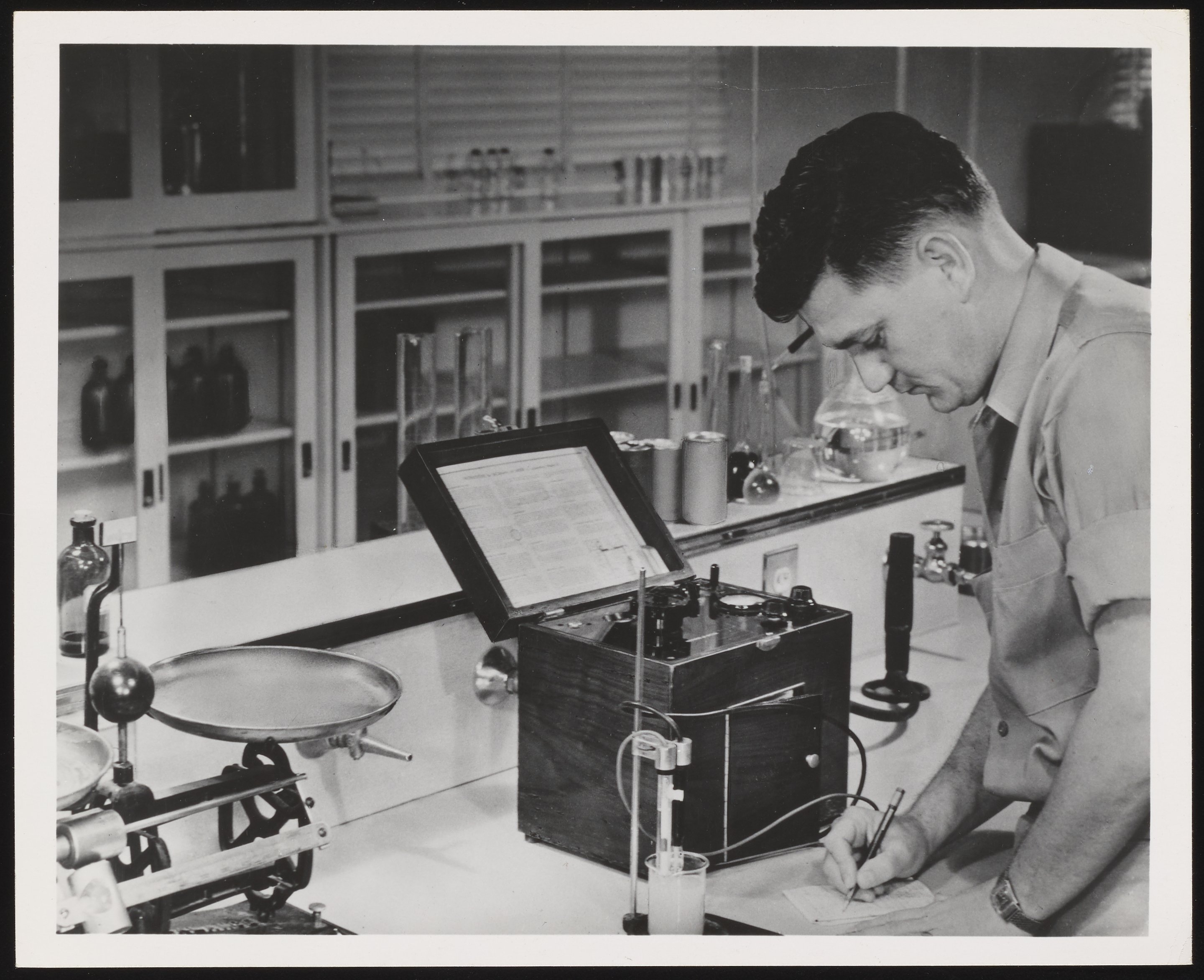 “Beckman Model G PH Meter in Use,” circa 1955. Beckman Historical Collection, Box 55, Folder 74. Science History Institute. Philadelphia. https://digital.sciencehistory.org/works/zg64tk984.