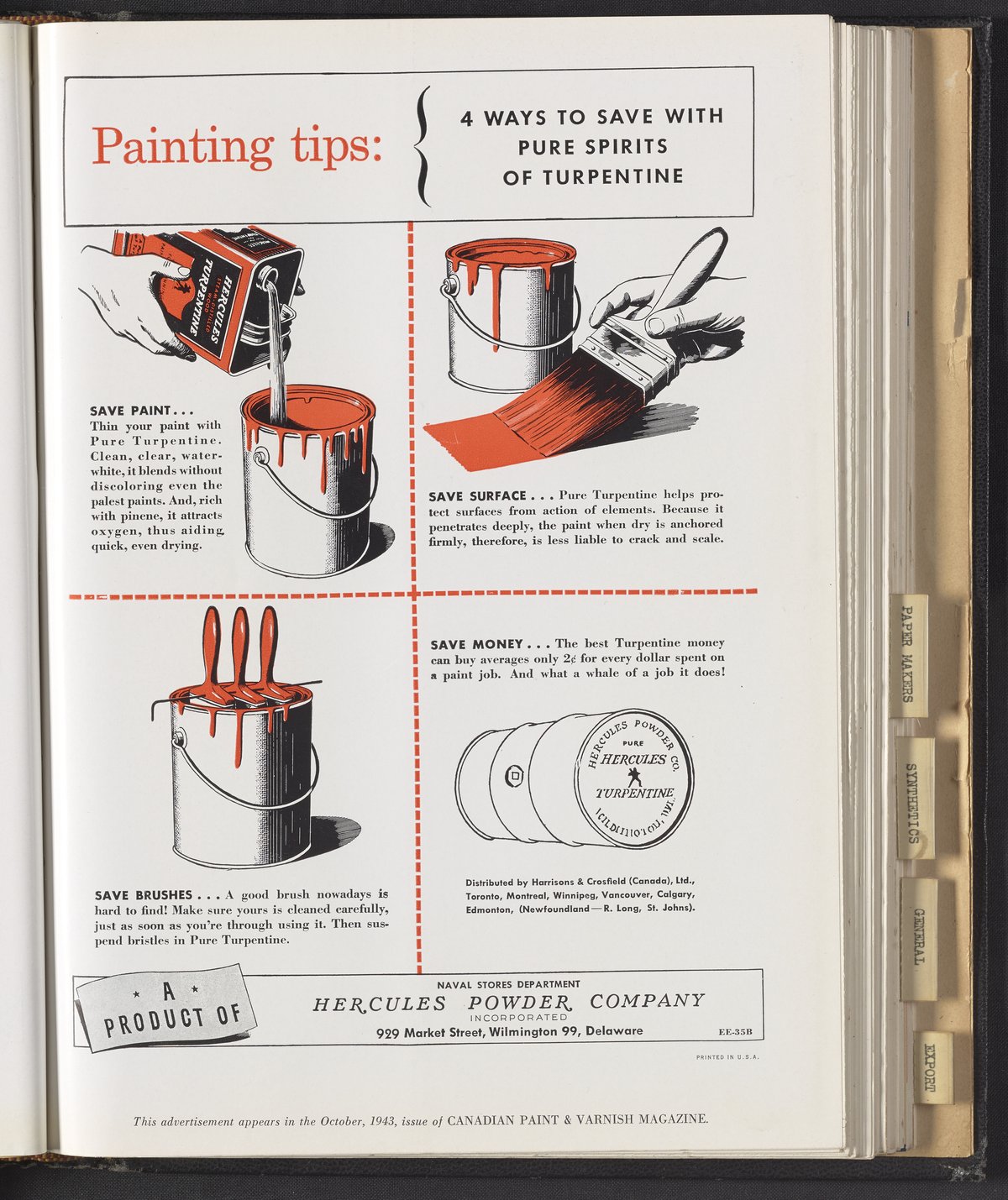 Hercules Incorporated. “Painting Tips: 4 Ways to Save with Pure Spirits of Turpentine.” 1943 Hercules Advertisements, 1943. Records of Hercules Incorporated, Volume 1943. Science History Institute. Philadelphia. https://digital.sciencehistory.org/works/zg64tm67b.