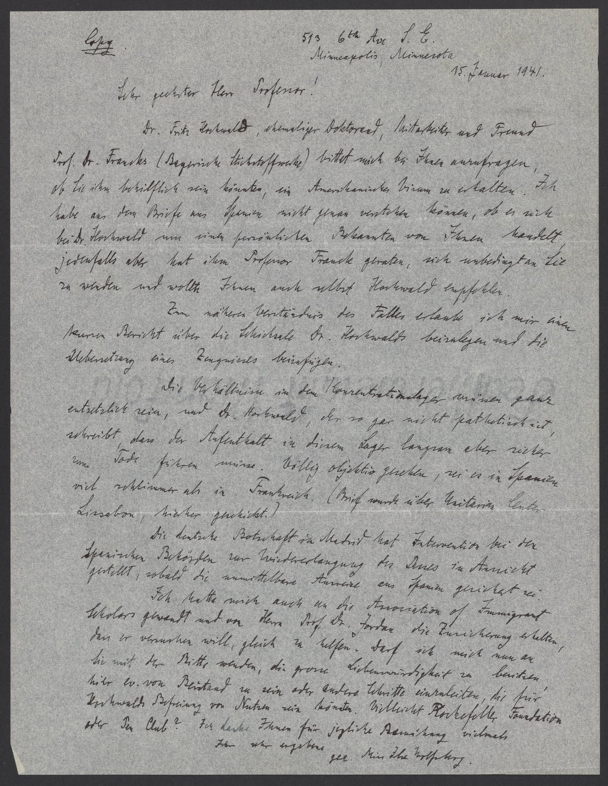 Dr. Fritz Hochwalds, ehemaliger Doktorand, Mitarbeiter und Freund Prof. Dr. Francks (Bayerischer Stickstoffwerke) bittet mir bei Ihnen anzufragen, ob Sie ihm behilflich sein könnten, ein Amerikanisches Visum zu erhalten. Ich habe aus dem Briefe aus Spanien nicht genau verstehen können, ob es sich bei Dr. Hochwald um einen persönlichen Bekannten von Ihnen handelt, jedenfalls aber hat ihm Professor Franck geraten, sich unbedingt an Sie zu wenden und wollte Ihnen auch selbst Hochwald empfehlen.