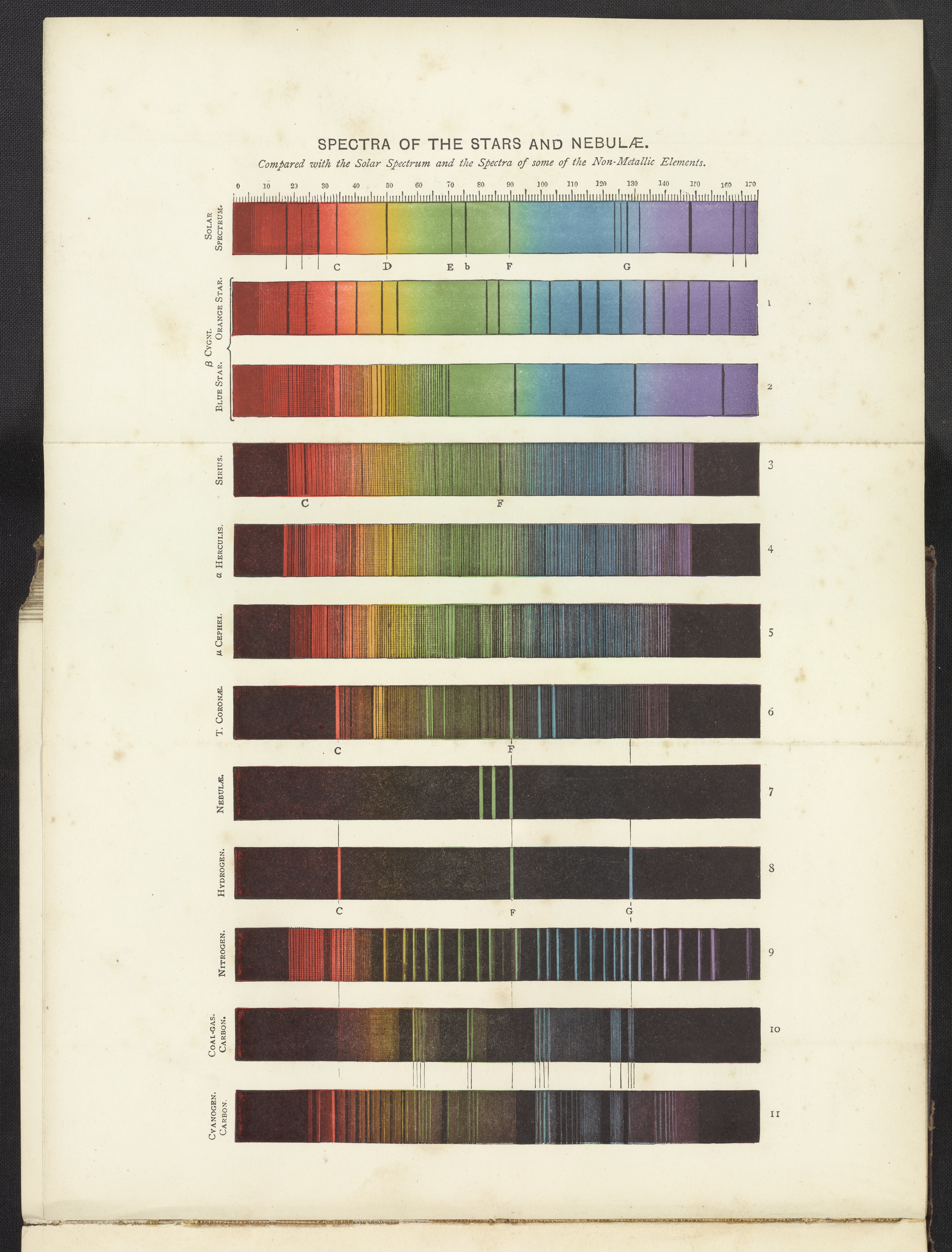 Chromo-lithograph of the Spectra of the Stars and Nebulae compared with the Solar Spectrum and the Spectra of some of the Non-Metallic Elements.