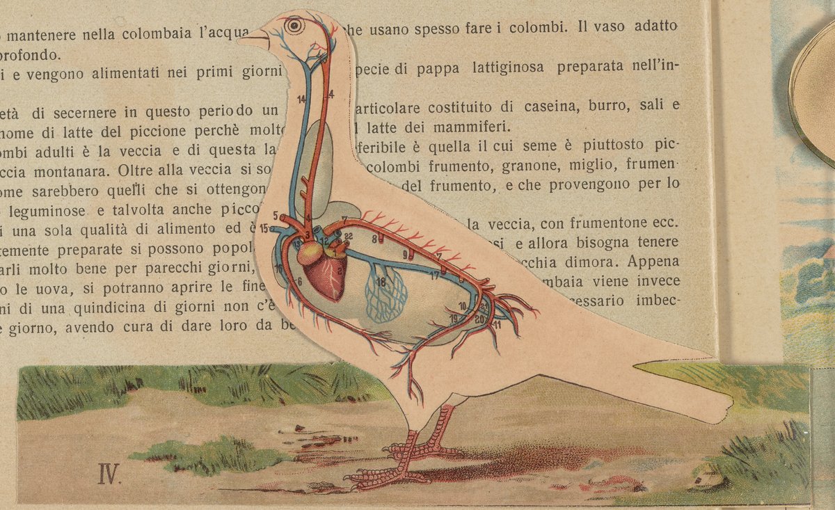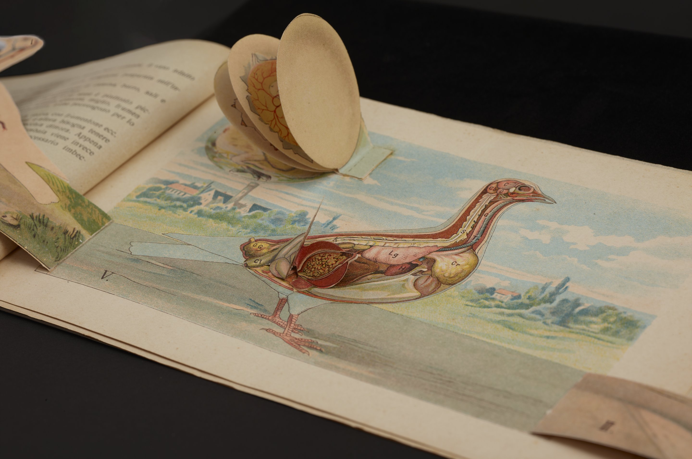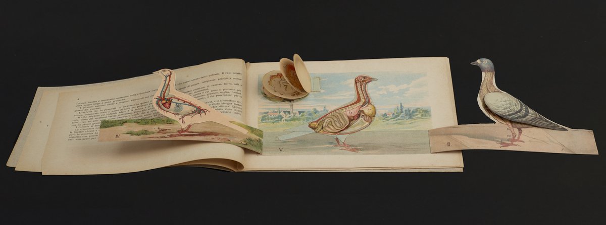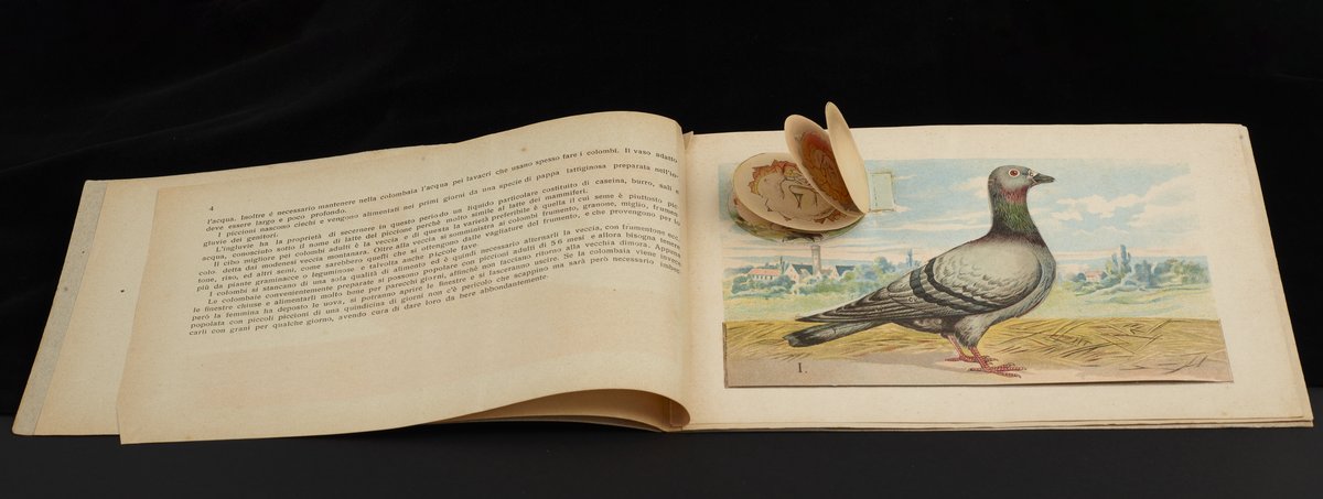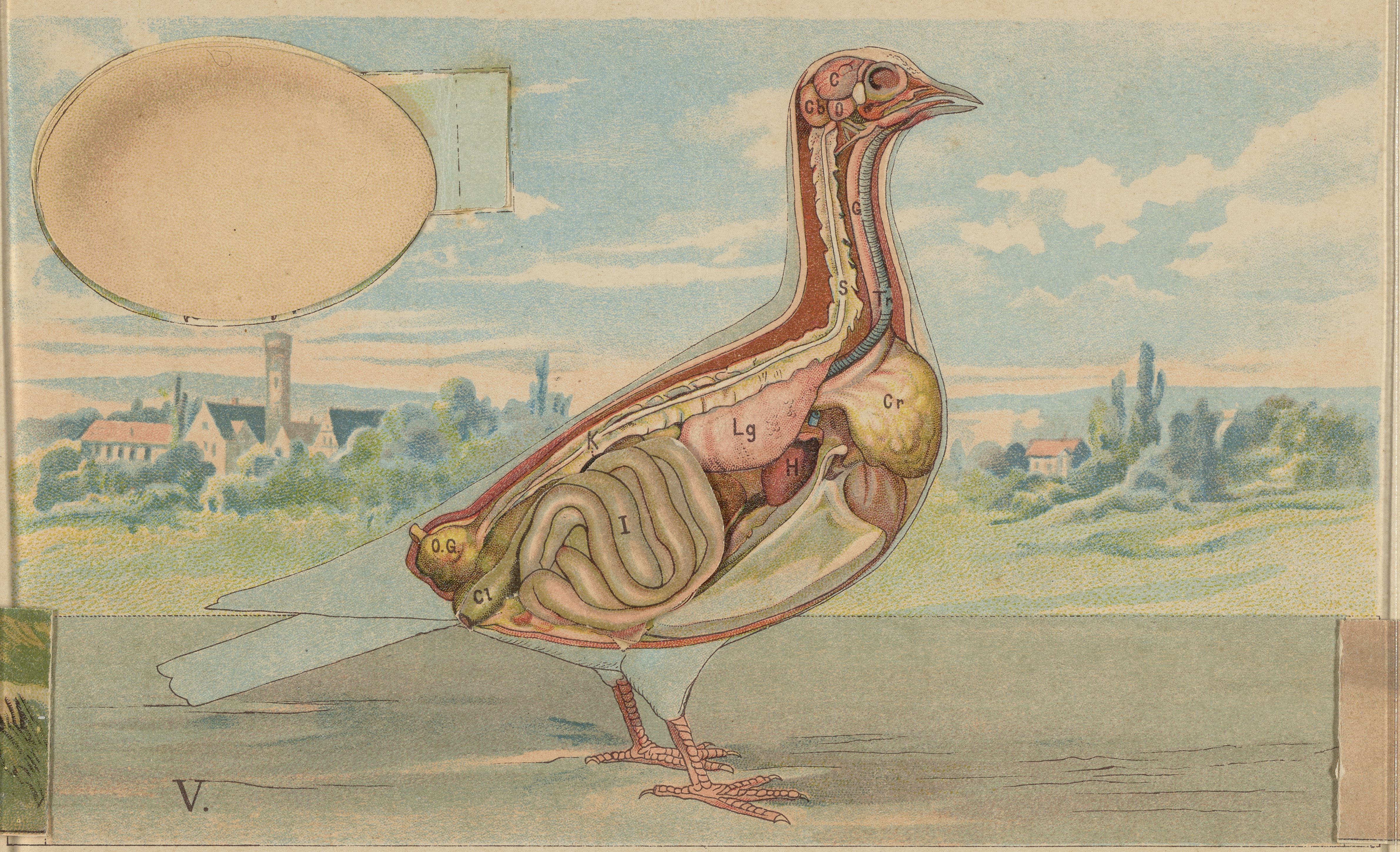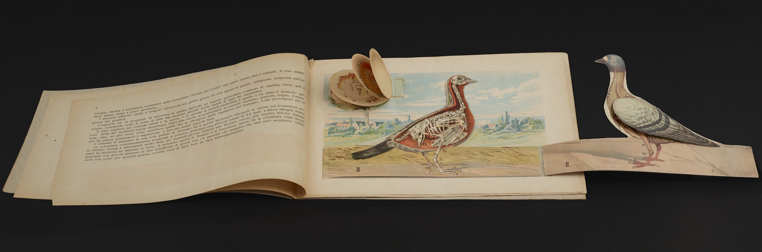 Small JPG1200 x 453px — 85.7 KBLarge JPG2880 x 1087px — 393 KBFull-sized JPG8895 x 3358px — 3.0 MBOriginal fileTIFF — 8895 x 3358px — 85.5 MBItalian-language book on the anatomy of the pigeon. It includes a color illustration of a pigeon and a pigeon egg. The pigeon is composed of two large, double-sided flaps and a series of smaller flaps, each of which lifts to reveal the anatomical layer beneath it, from the pigeon's outer body to its skeleton, vascular system, muscles, and internal organs. The egg is composed of three double-sided flaps that depict the stages of embryonic development.