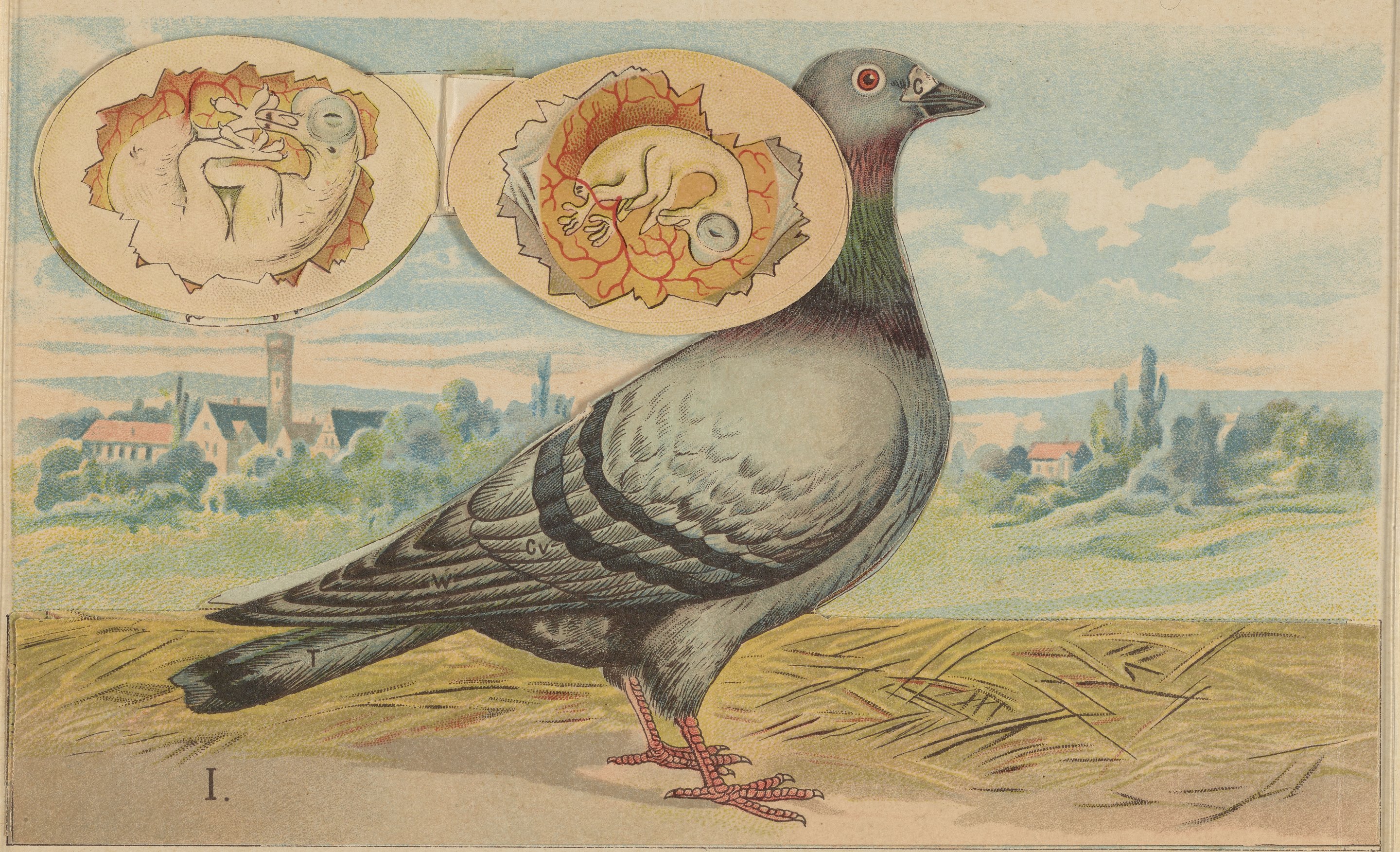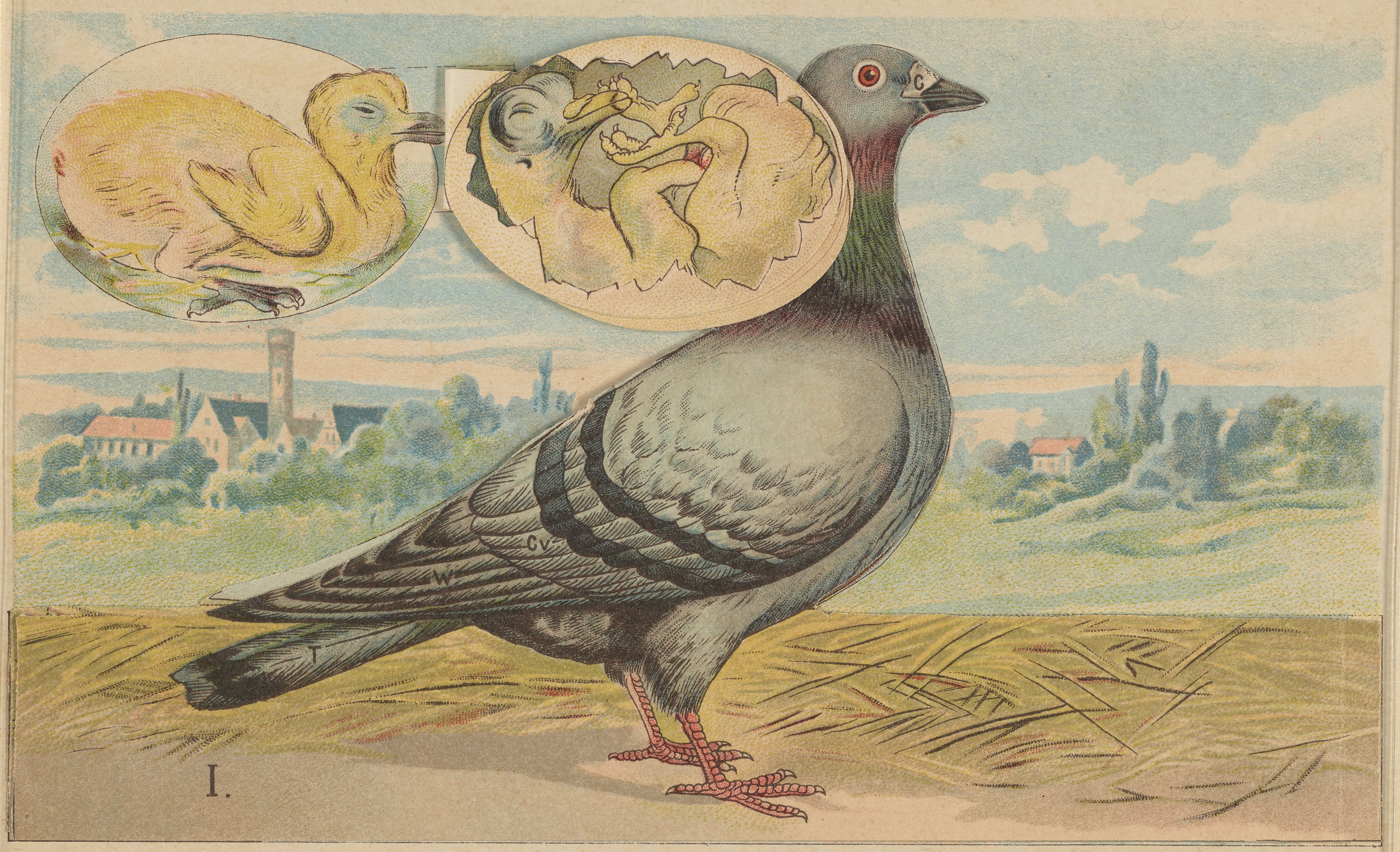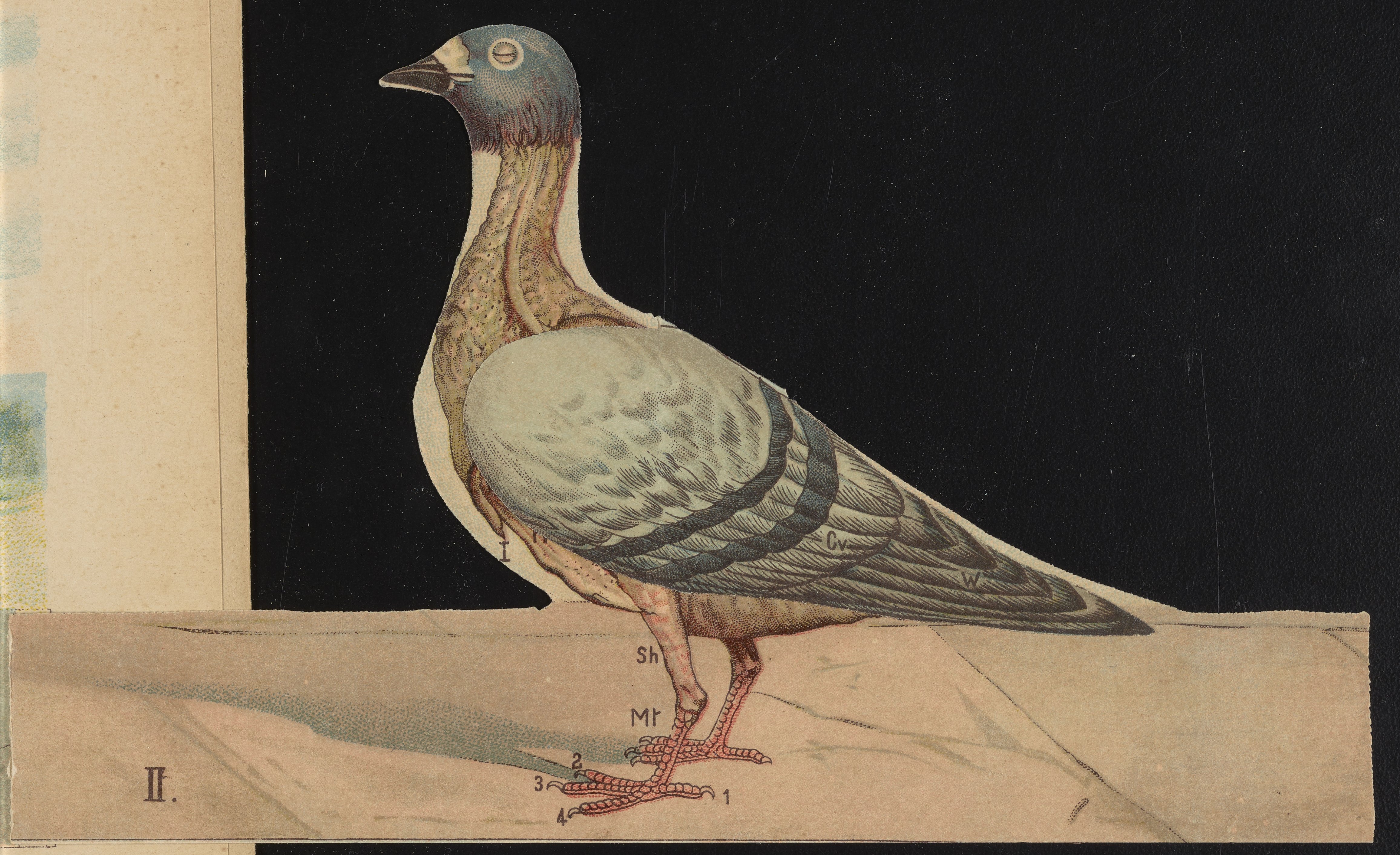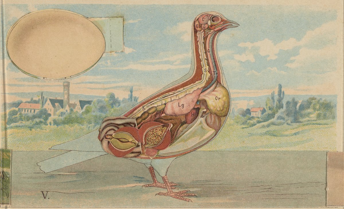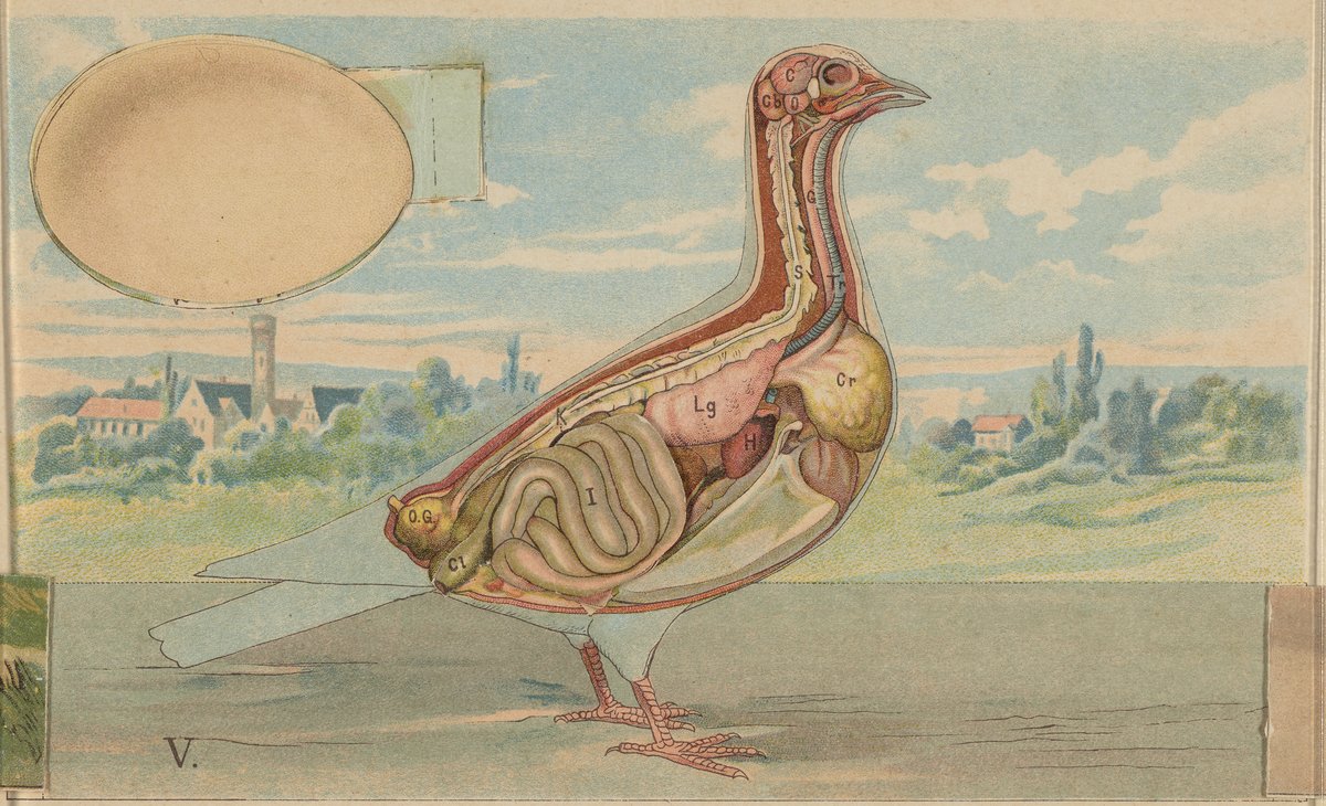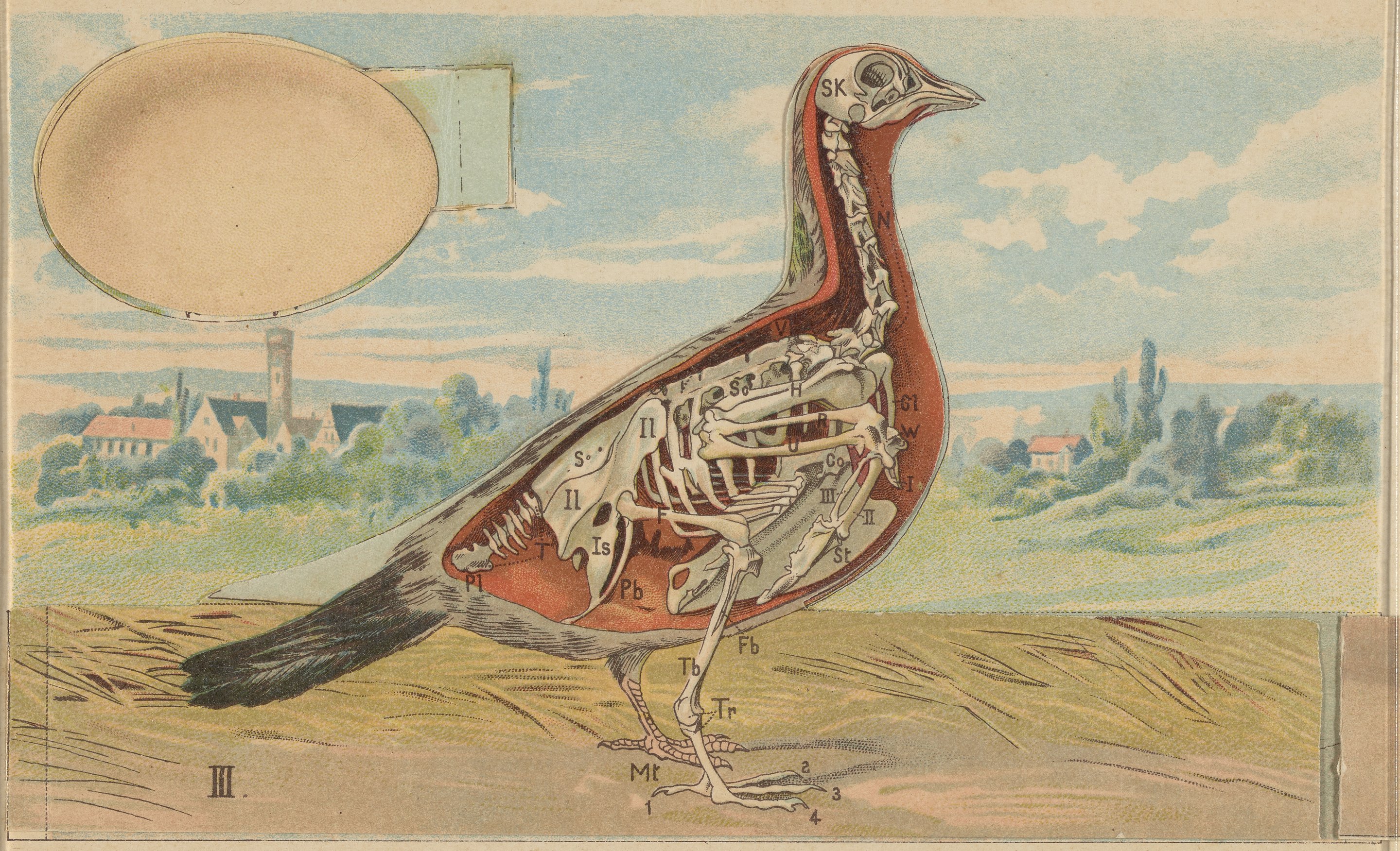 Small JPG1200 x 453px — 85.7 KBLarge JPG2880 x 1087px — 393 KBFull-sized JPG8895 x 3358px — 3.0 MBOriginal fileTIFF — 8895 x 3358px — 85.5 MBItalian-language book on the anatomy of the pigeon. It includes a color illustration of a pigeon and a pigeon egg. The pigeon is composed of two large, double-sided flaps and a series of smaller flaps, each of which lifts to reveal the anatomical layer beneath it, from the pigeon's outer body to its skeleton, vascular system, muscles, and internal organs. The egg is composed of three double-sided flaps that depict the stages of embryonic development.
