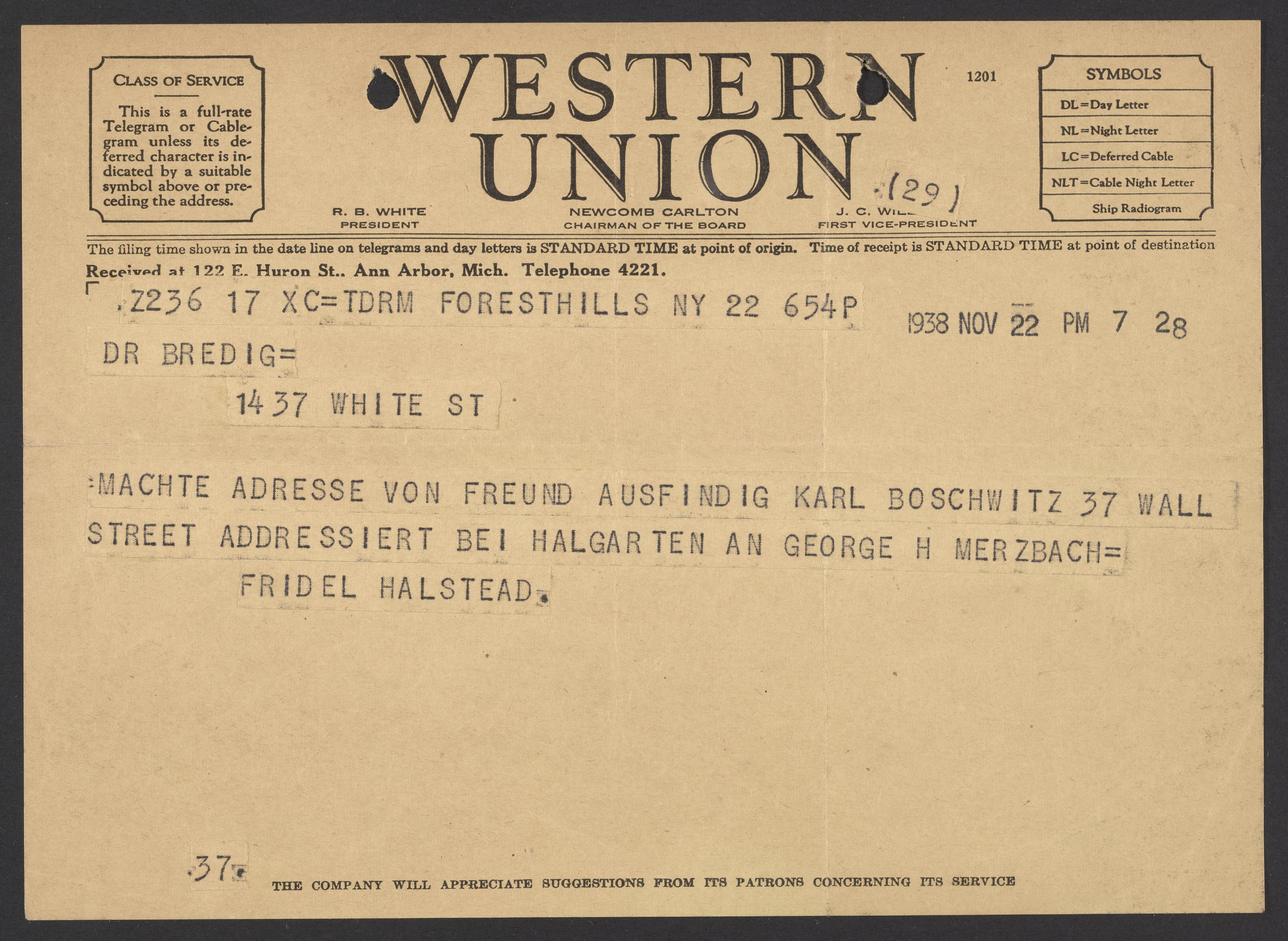 MACHTE ADRESSE VON FREUND AUSFINDIG KARL BOSCHWITZ 37 WALL STREET ADDRESSIERT BEI HALGARTEN AN GEORGE MERZBACH = FRIDEL HALSTEAD.