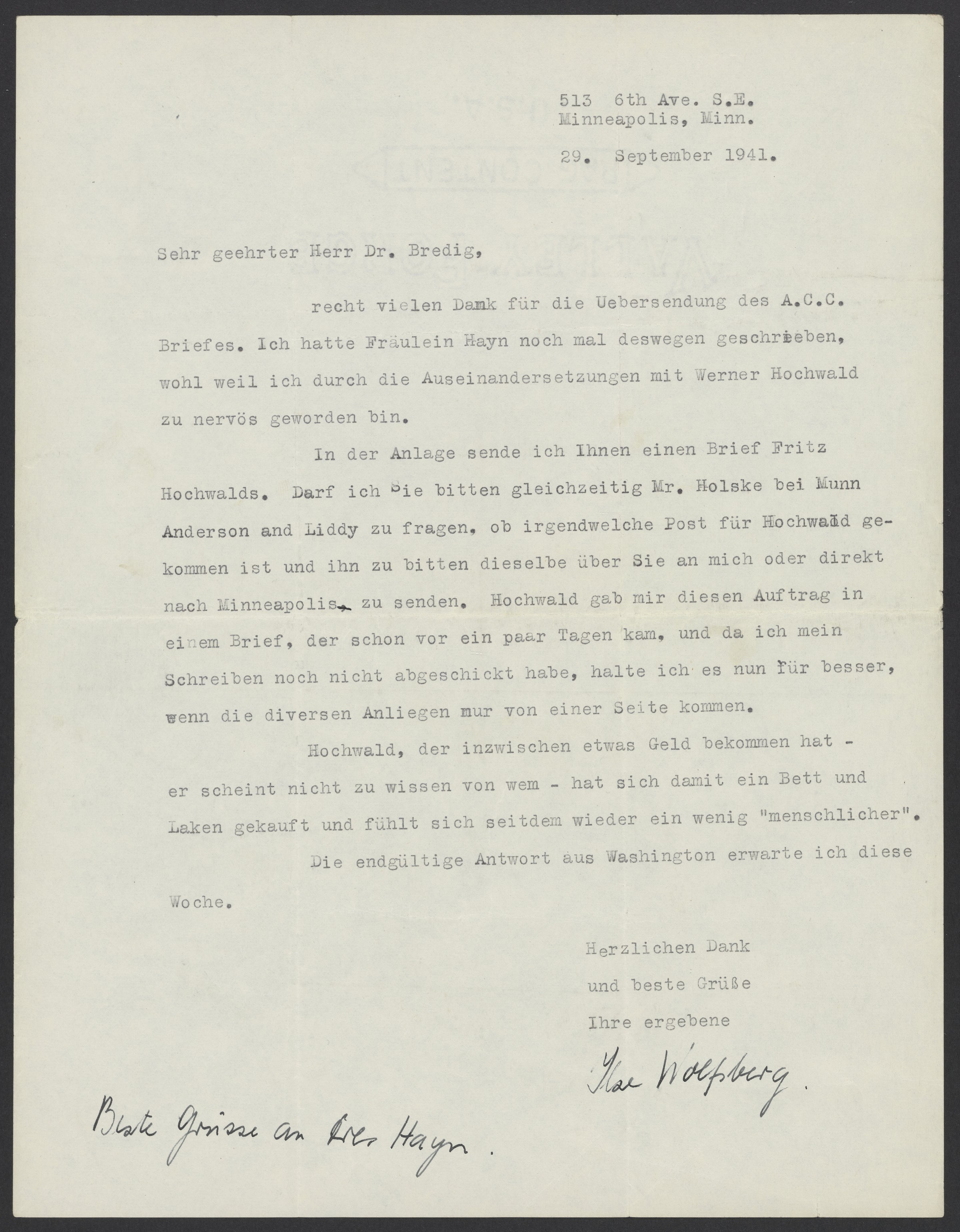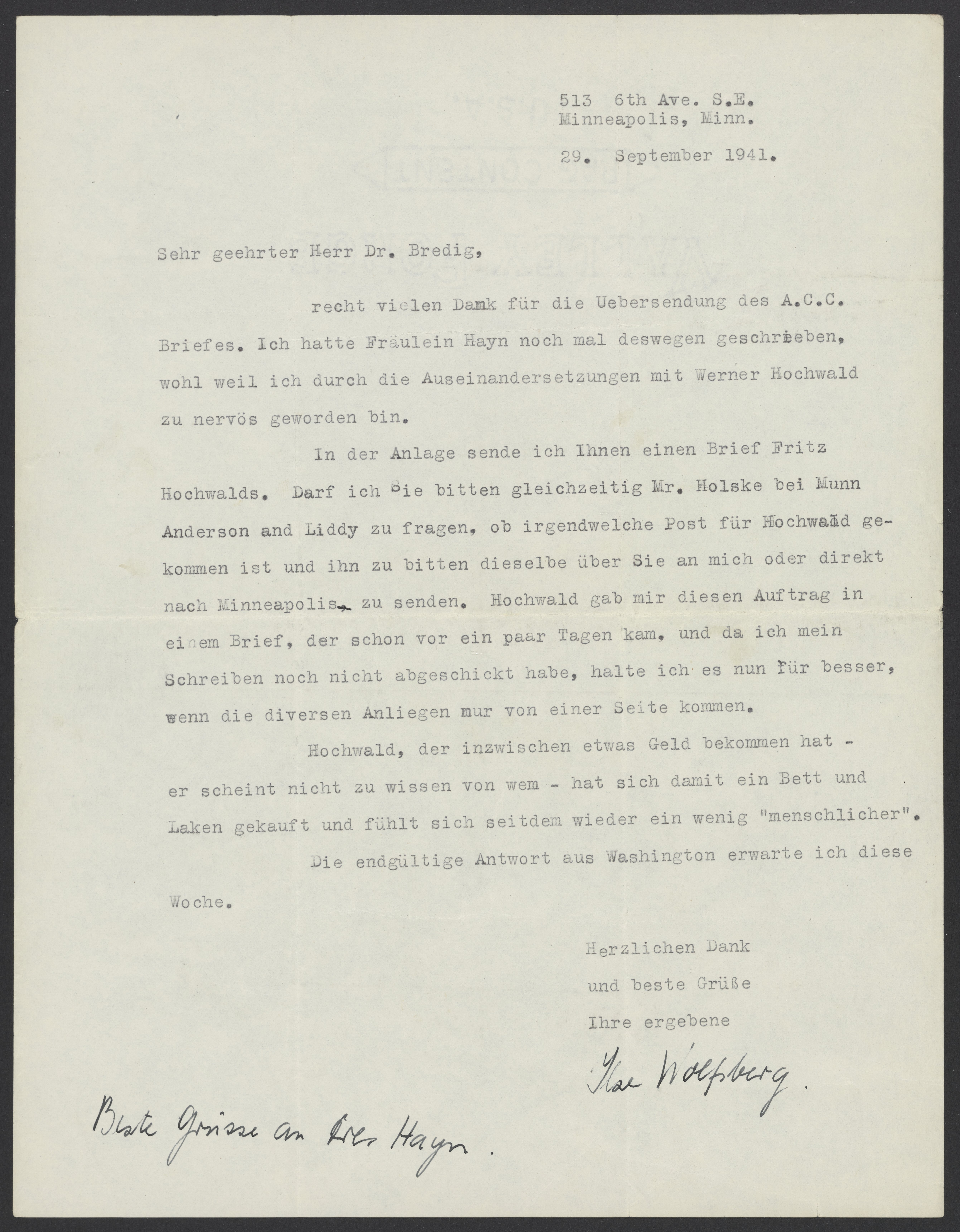 In der Anlage sende ich Ihnen einen Brief Fritz Hochwalds. Darf ich Sie bitten gleichzeitig Mr. Holske bei Munn Anderson and Liddy zu fragen, ob ich iregendwelche Post für Hochwald gekommen ist und ihn zu bitten dieselbe über Sie an mich oder direkt nach Minneapolis zu senden. Hochwald gab mir diesen Auftrag in einem Brief, der schon vor ein paar Tagen kam, und da ich mein Schreiben noch nicht abgeschickt habe, halte ich es nur für besser, wenn die diversen Anliegen nur von einer Seite kommen.
