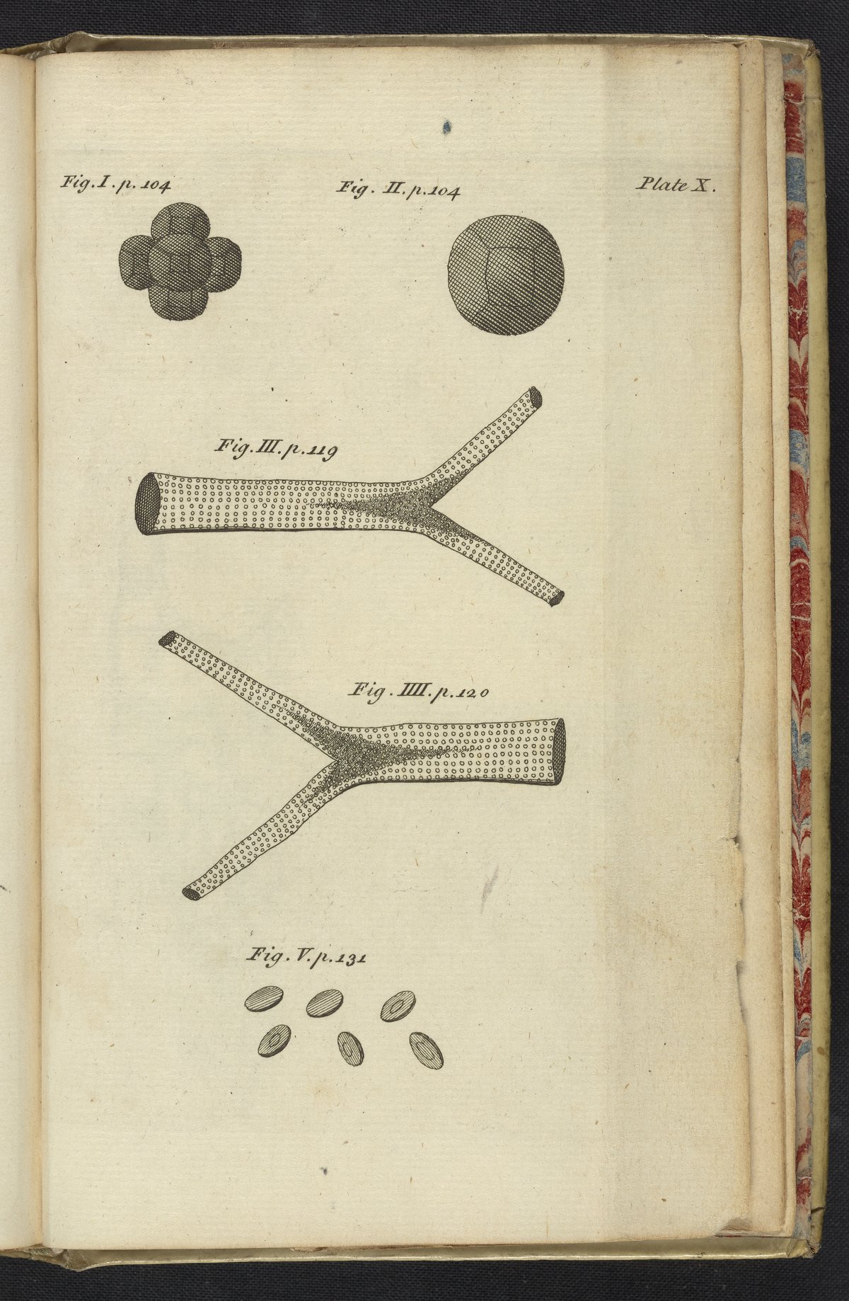 As described on accompanying pages listed next to the illustrations, this plate illustrates blood cells (figures I & II), arteries (figure III), veins (figure IIII), and platelets (figure V) under magnification.