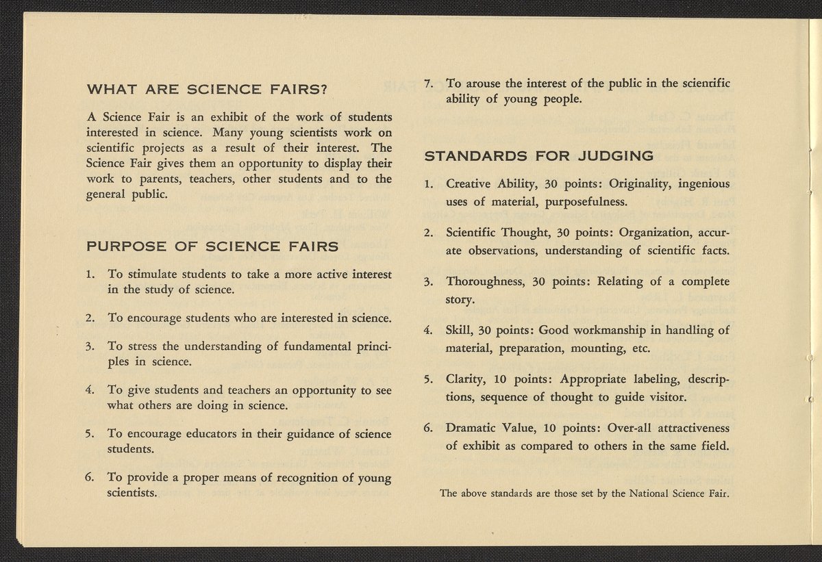 Small JPG1200 x 810px — 159 KBFull-sized JPG2678 x 1808px — 685 KBOriginal fileTIFF — 2678 x 1808px — 13.9 MBThe booklet describes the organization responsible for the Fifth Annual Southern California Science Fair, held in April at the Los Angeles County Museum. A list of student exhibitors includes their name, grade, exhibit title, school, and teacher.
