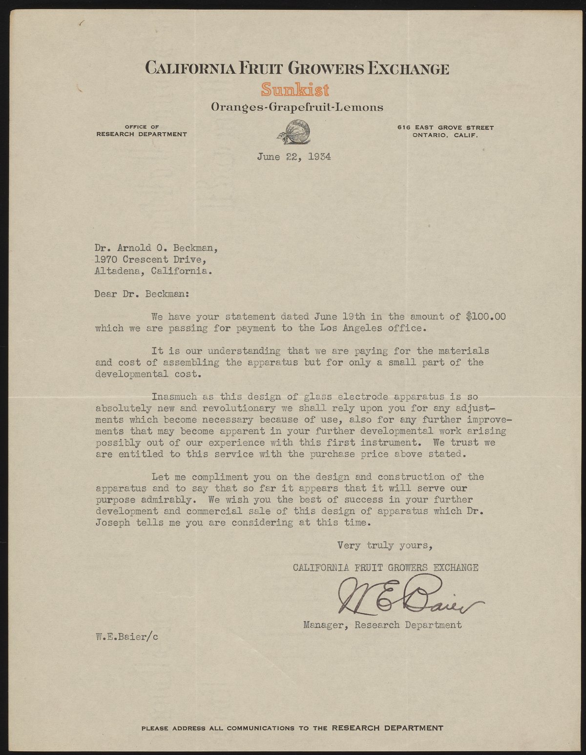 Baier, W. E. “Letter from W. E. Baier to Arnold O. Beckman,” June 22, 1934. Beckman Historical Collection, Box 14, Folder 8. Science History Institute. Philadelphia. https://digital.sciencehistory.org/works/zs25x8496.