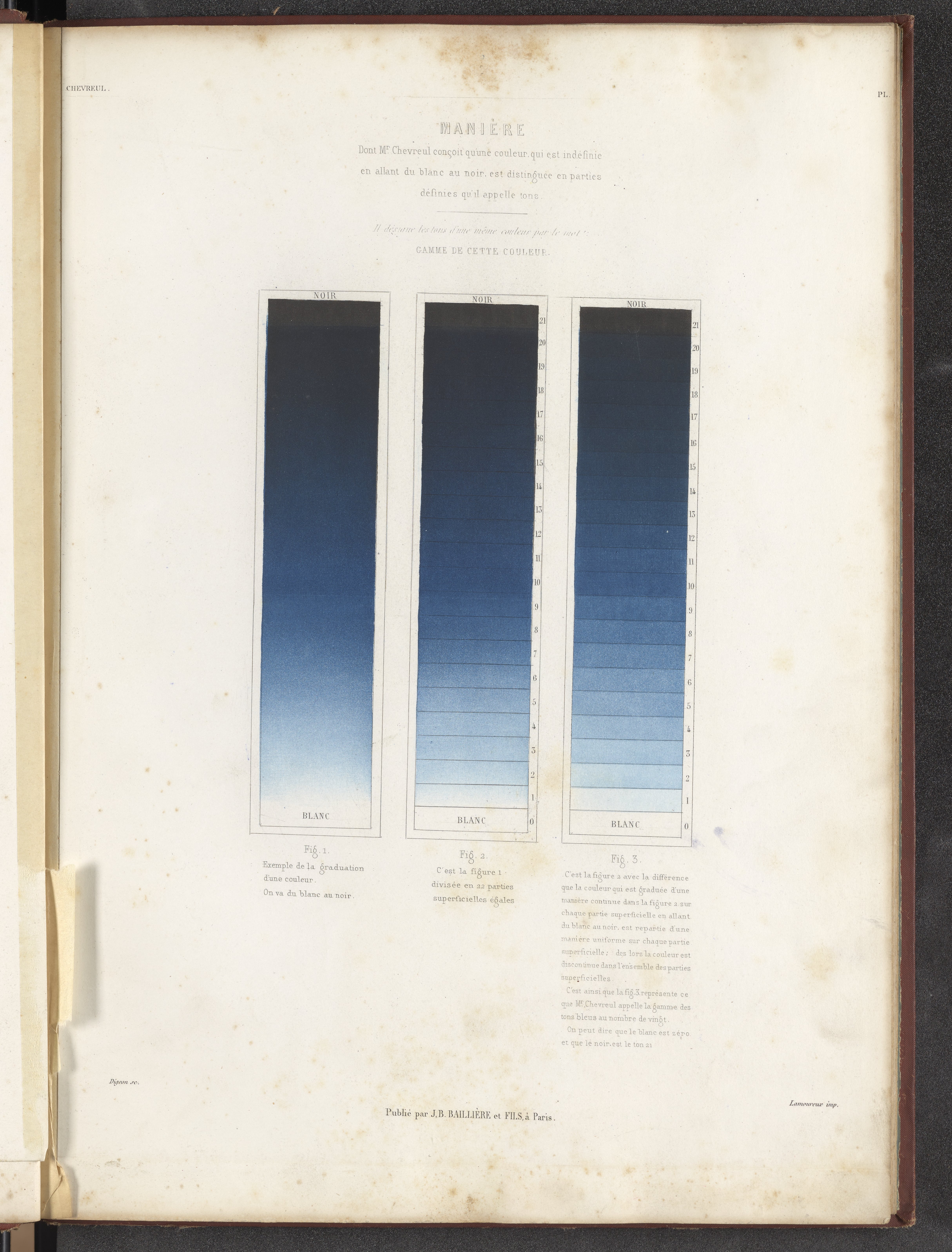 Chevreul, M. E. (Michel Eugène). “Plate II: Gamme Des Tons Bleus.” In Des Couleurs Et De Leurs Applications Aux Arts Industriels à l'Aide Des Cercles Chromatiques. Paris, France: J.-B. Baillière et fils, 1864. https://digital.sciencehistory.org/works/zs25x8606.