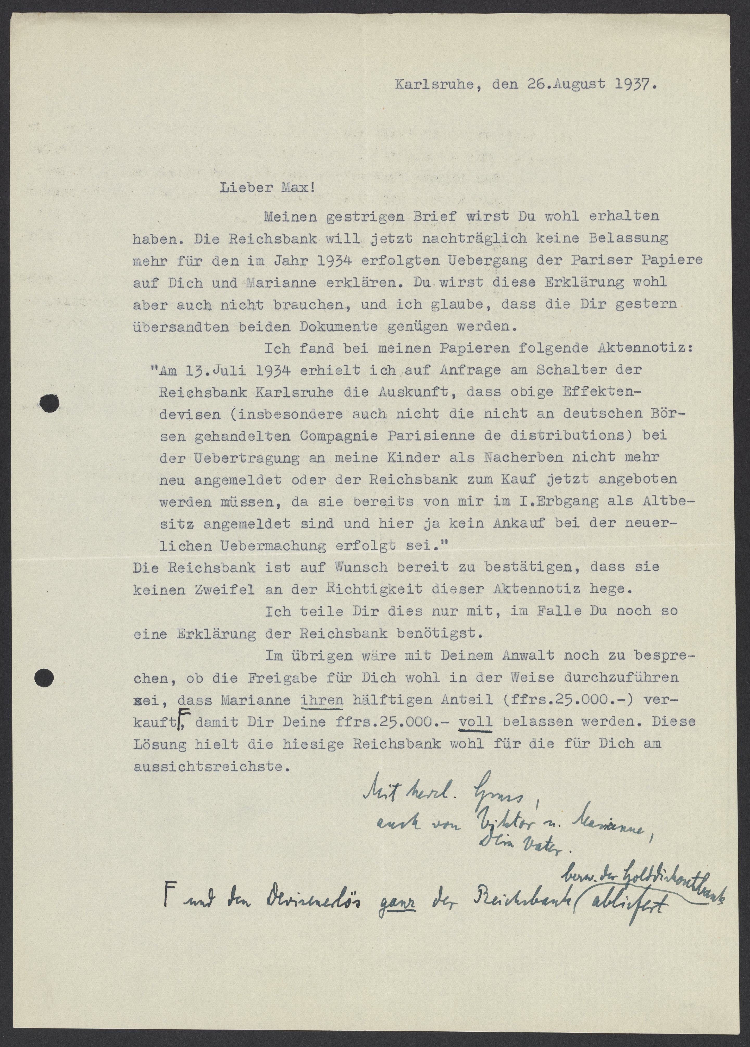 Meinen gestrigen Brief wirst Du wohl erhalten haben. Die Reichsbank will jetzt nachträglich keine Belassung mehr für den im Jahr 1934 erfolgten Uebergang der Pariser Papiere auf Dich und Marianne erklären. Du wirst diese Erklärung wohl aber auch nicht brauchen, und ich glaube, dass die Dir gestern übersandten beide Dokumenten genügen werden.