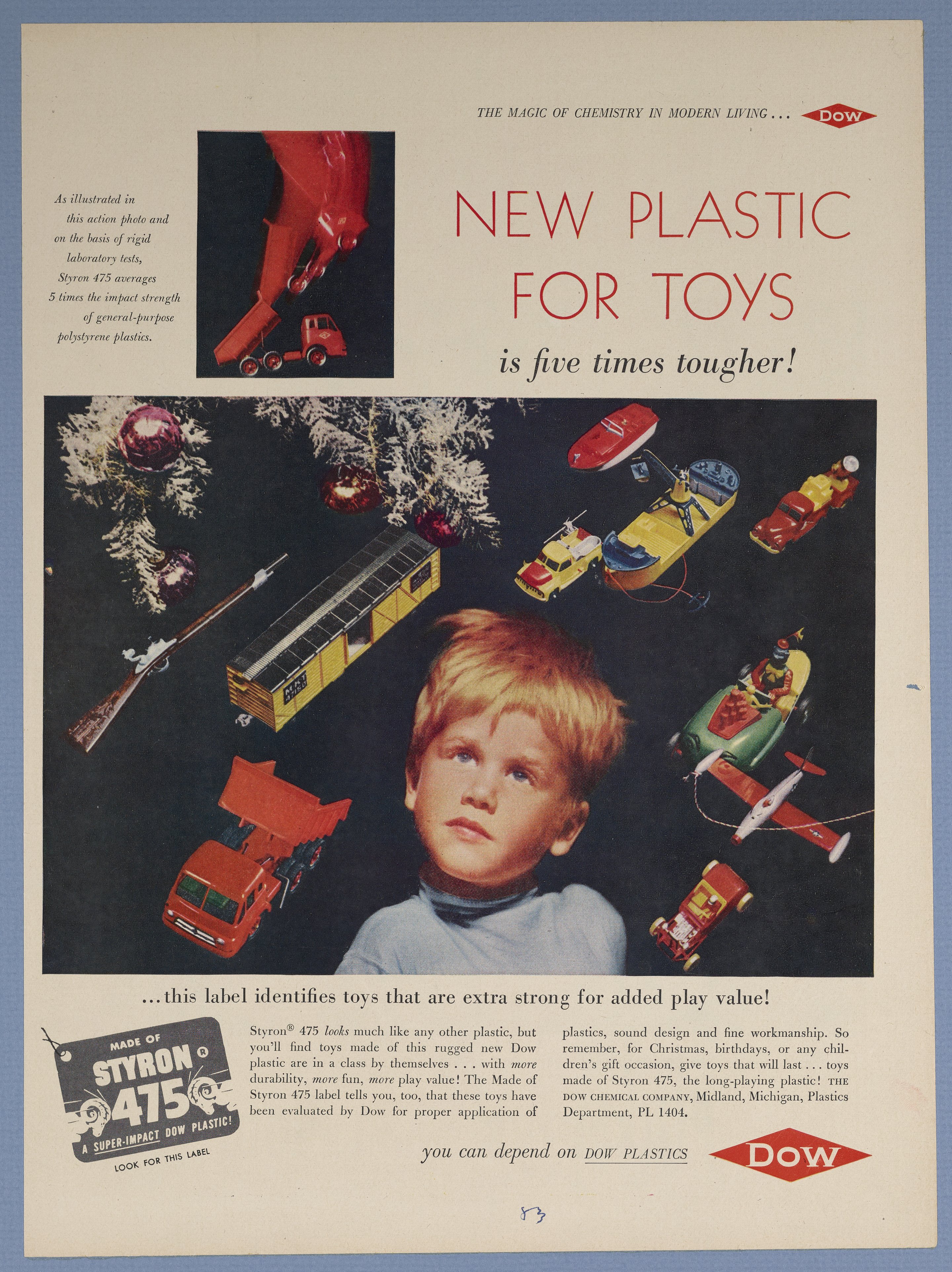 Dow Chemical Company. “New Plastic for Toys Is Five Times Tougher!,” 1943. Advertisements from the Dow Chemical Historical Collection, Box 3. Science History Institute. Philadelphia. https://digital.sciencehistory.org/works/zv86m98.