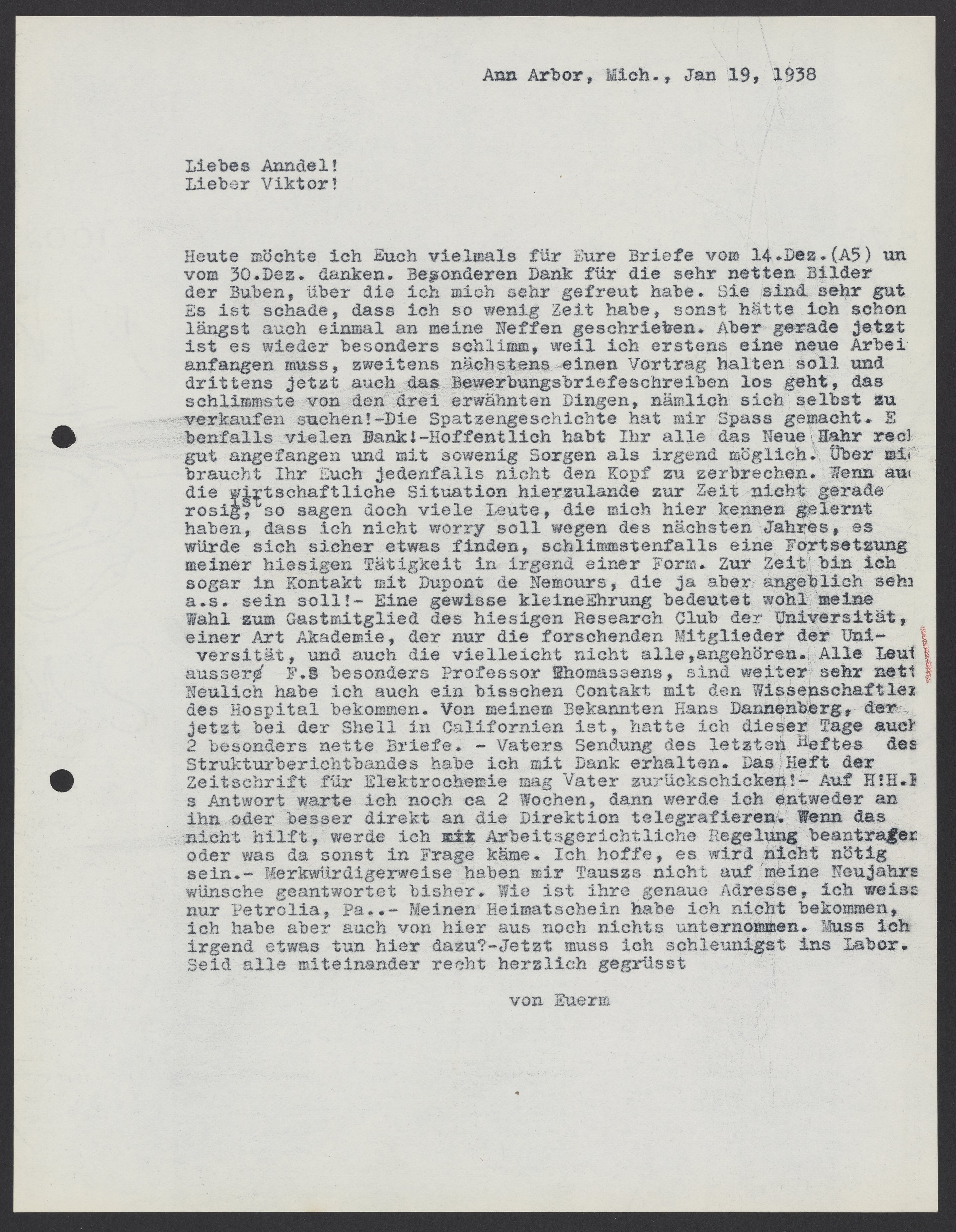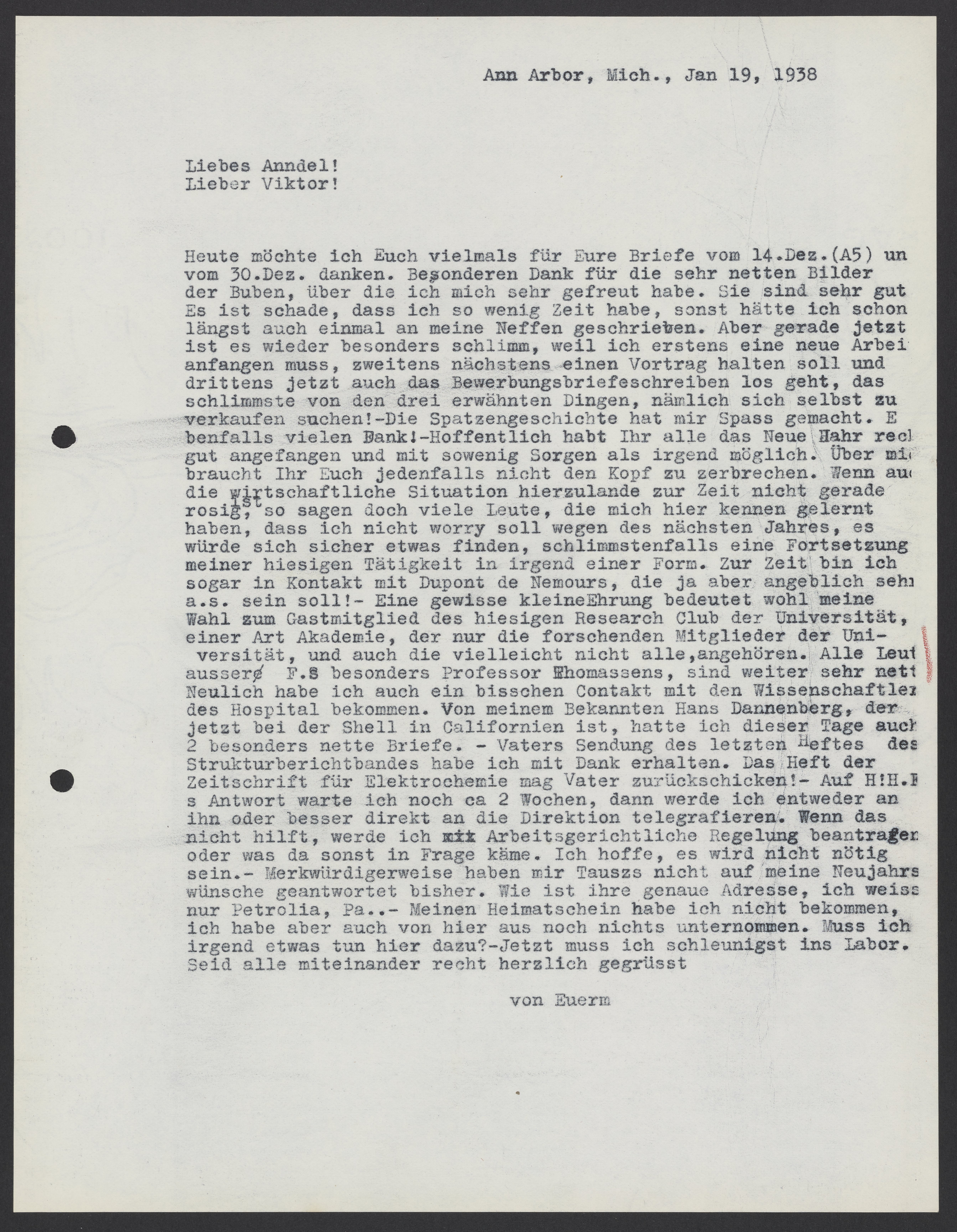 Heute möchte ich Euch vielmals für Eure Briefe vom 14.Dez. (A5) und vom 30.Dez. danken. Besonderen Dank für die sehr netten Bilder der Buben, über die ich mich sehr gefreut haben. Sie sind sehr gut. Es ist schade, dass ich so wenig Zeit habe, sonst hätte ich schon längst auch einmal an meine Neffen geschrieben. Aber gerade jetzt ist es wieder besonders schlimm, weil ich erstens eine neue Arbeit anfangen muss, zweitens nächstens einen Vortrag halten soll und drittens jetzt auch das Bewerbungsschreiben lost geht, das schlimmste von den drei erwähnten Dingen, nämlich sich selbst zu verkaufen suchen. – Die Spatzengeschichte hat mir Spass gemacht. Ebenfalls vielen Dank! Hoffentlich habe Ihr alle das neue Jahr recht gut angefangen und mit sowenig Sorgen als irgend möglich. Über mich braucht Ihr Euch jedenfalls nicht den Kopf zu zerbrechen. Wenn auch die wirtschaftliche Situation hierzulande zur Zeit nicht gerade rosig ist, so sagen doch viele Leute, die mich hier kennen gelernt haben, dass ich nicht worry soll wegen des nächsten Jahren, es würde sich sicher etwas finden, schlimmstenfalls eine Fortsetzung meiner hiesigen Tätigkeit in irgend einer Form. Zur Zeit bin ich sogar in Kontakt mit DuPont de Nemours, die ja aber angeblich sehr a.s. sein soll! – Eine gewisse kleine Ehrung bedeutet wohl meine Wahl zum Gastmitglied des hiesigen Research Club der Universität, und auch die vielleicht nicht alle, angehören. Alle Leute ausser F.S. besonders Professor Thomassens, sind weiter sehr nett. Neulich habe ich auch ein bisschen Contakt mit den Wissenschaftler des Hospitals bekommen. Von meinen Bekannten Hans Dannenberg, der jetzt bei Shell in California ist, hatte ich dieser Tage auch 2 besonders nette Briefe. – Vaters Sendung des letzten Heftes des Strukturberichtbandes habe ich mit Dank erhalten. Das Heft der Zeitschrift für Elektrochemie mag Vater zurückschicken! – Auf H.H.Fs Antwort warte ich noch ca. 2 Wochen, dann werde ich entweder an ihn oder besser direkt an die Direktion telegrafieren. Wenn das nicht hilft, werde ich Arbeitsgerichtliche Regelung beantragen oder was da sonst in Frage käme. Ich hoffe, es wird nicht nötig sein. – Merkwürdigerweise haben mir Tauszs nicht auf meine Neujahrswünsche geantwortet bisher. Wie ist ihre genaue Adresse, ich weiss nur Petrolia, Pa.. – Meinen Heimatschein habe ich nicht bekommen, ich habe aber auch von hier aus nichts unternommen. Muss ich irgend etwas tun hier dazu? – Jetzt muss ich schleunigst ins Labor. Seid alle miteinander recht herzlich gegrüsst