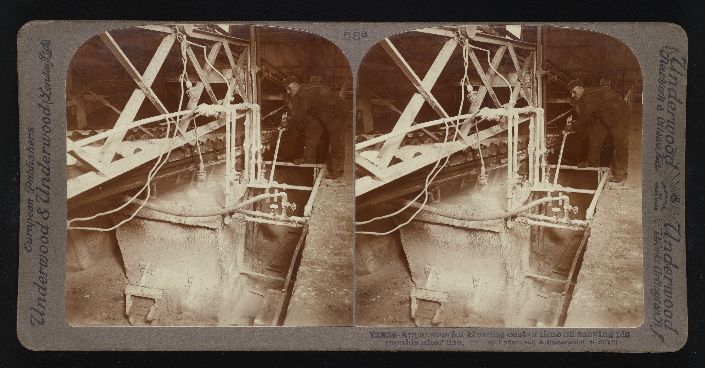 “Apparatus for Blowing Coat of Lime on Moving Pig Moulds after Use.” Underwood & Underwood, n.d. Underwood & Underwood Stereographs of Manufacturing Industries. Science History Institute. Philadelphia. https://digital.sciencehistory.org/works/zw12z529z.