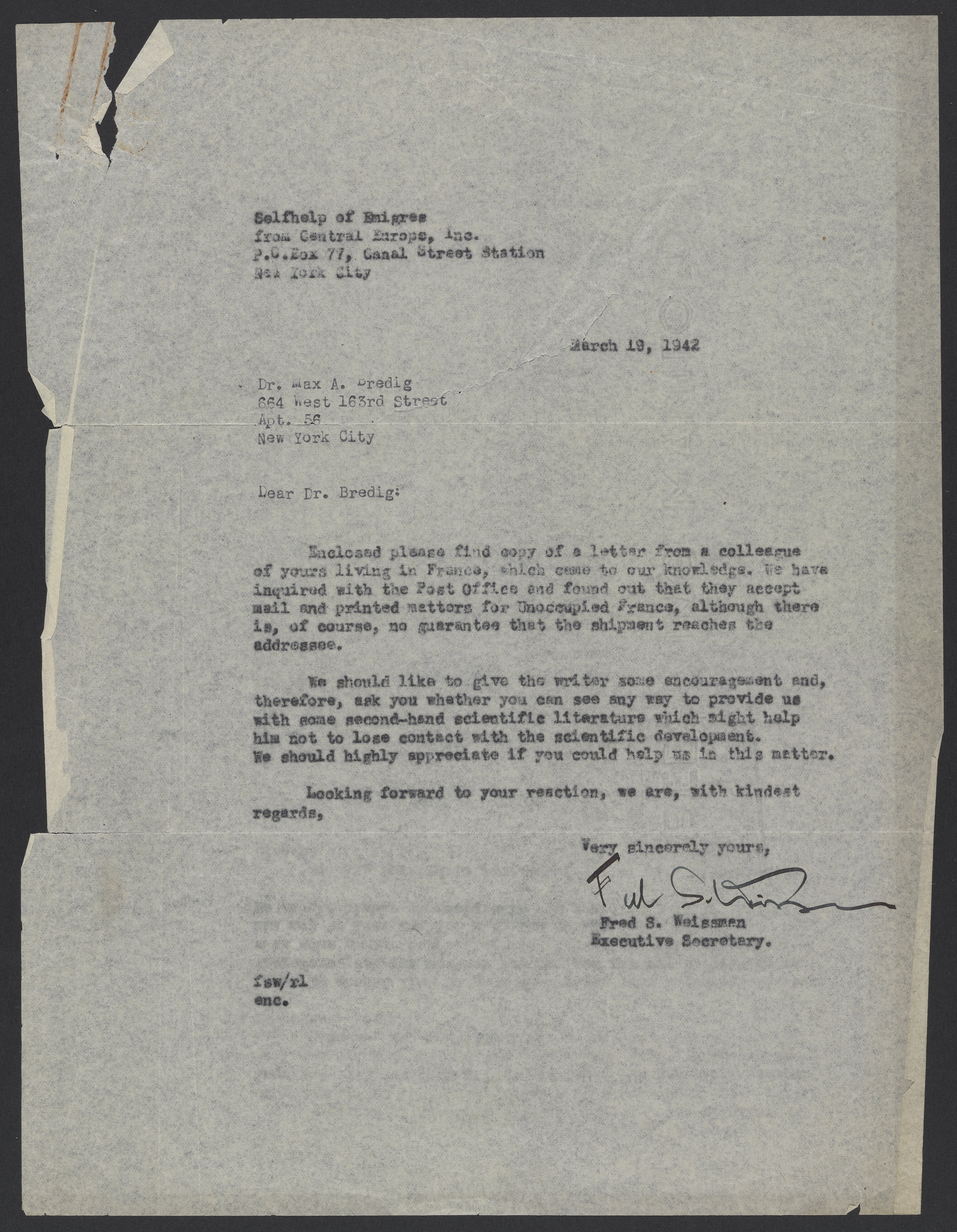Fred S. Weismen, executive secretary of Selfhelf of Emigres from Central Europe, Inc., requests scientific literature from Max Bredig (1902-1977) to supply a scientist colleague living in France with encouragement while they are cut off from any news of scientific development.