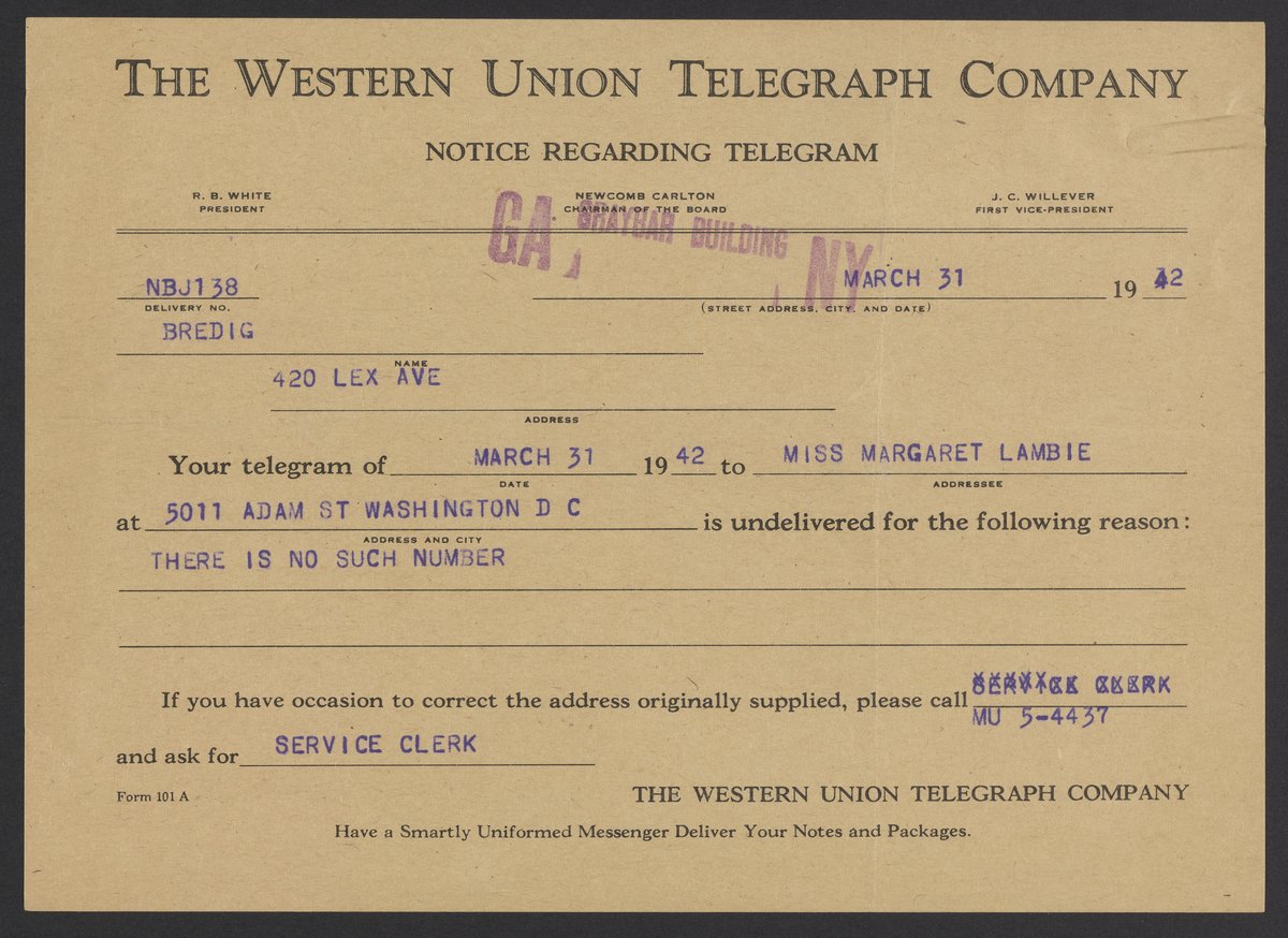 Notice that Max Bredig's (1902-1977) telegram could not be delivered to Margaret Lambie.